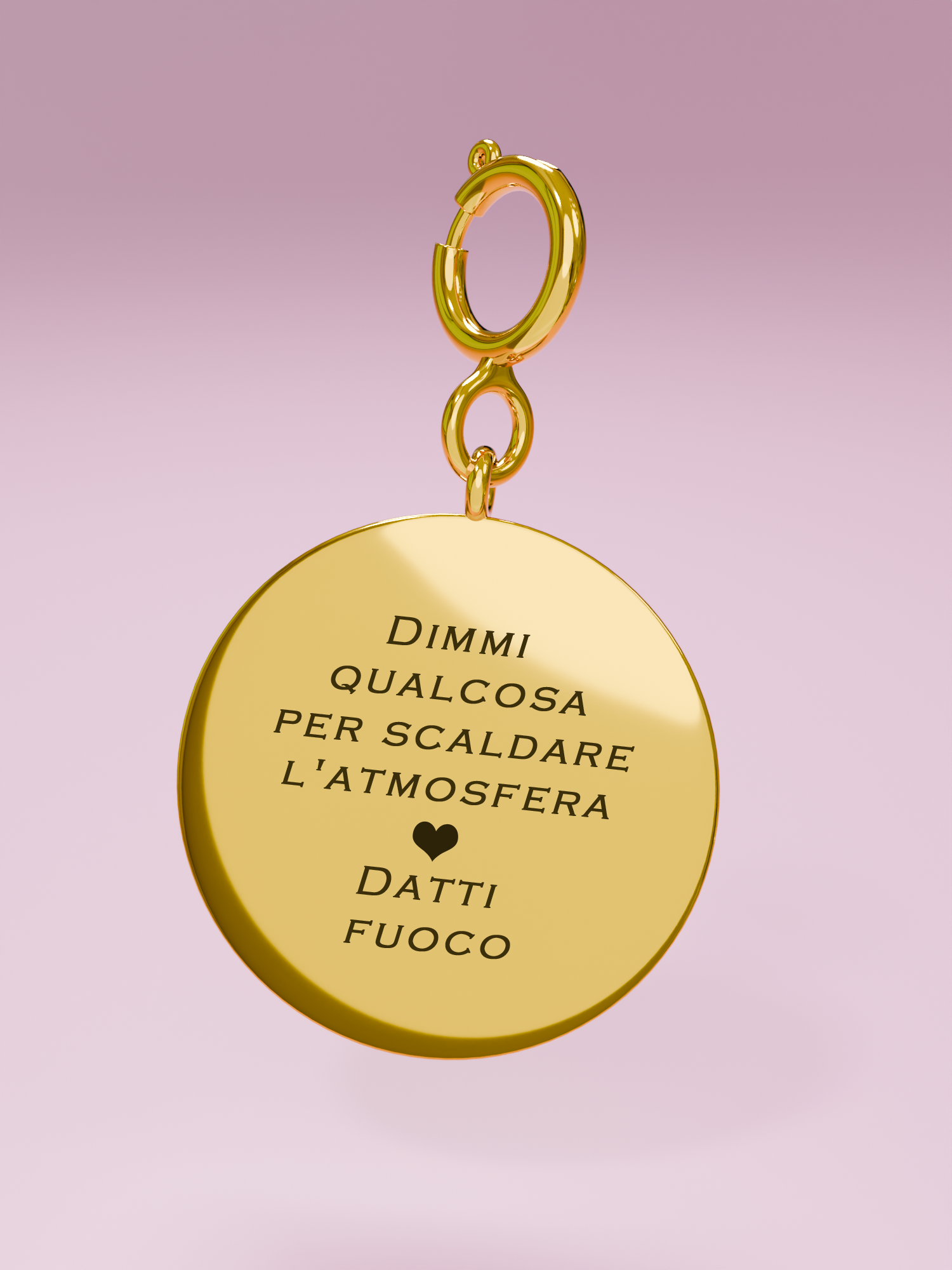 Direttamente dal Feliciaverso, la placchetta circolare ispirata al libro "Una Conquista Fuori Menù" con incisa la frase "Dimmi qualcosa per scaldare l'atmosfera - Datti fuoco".