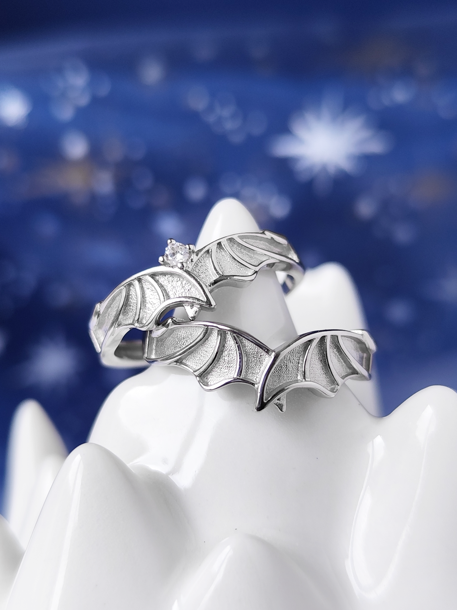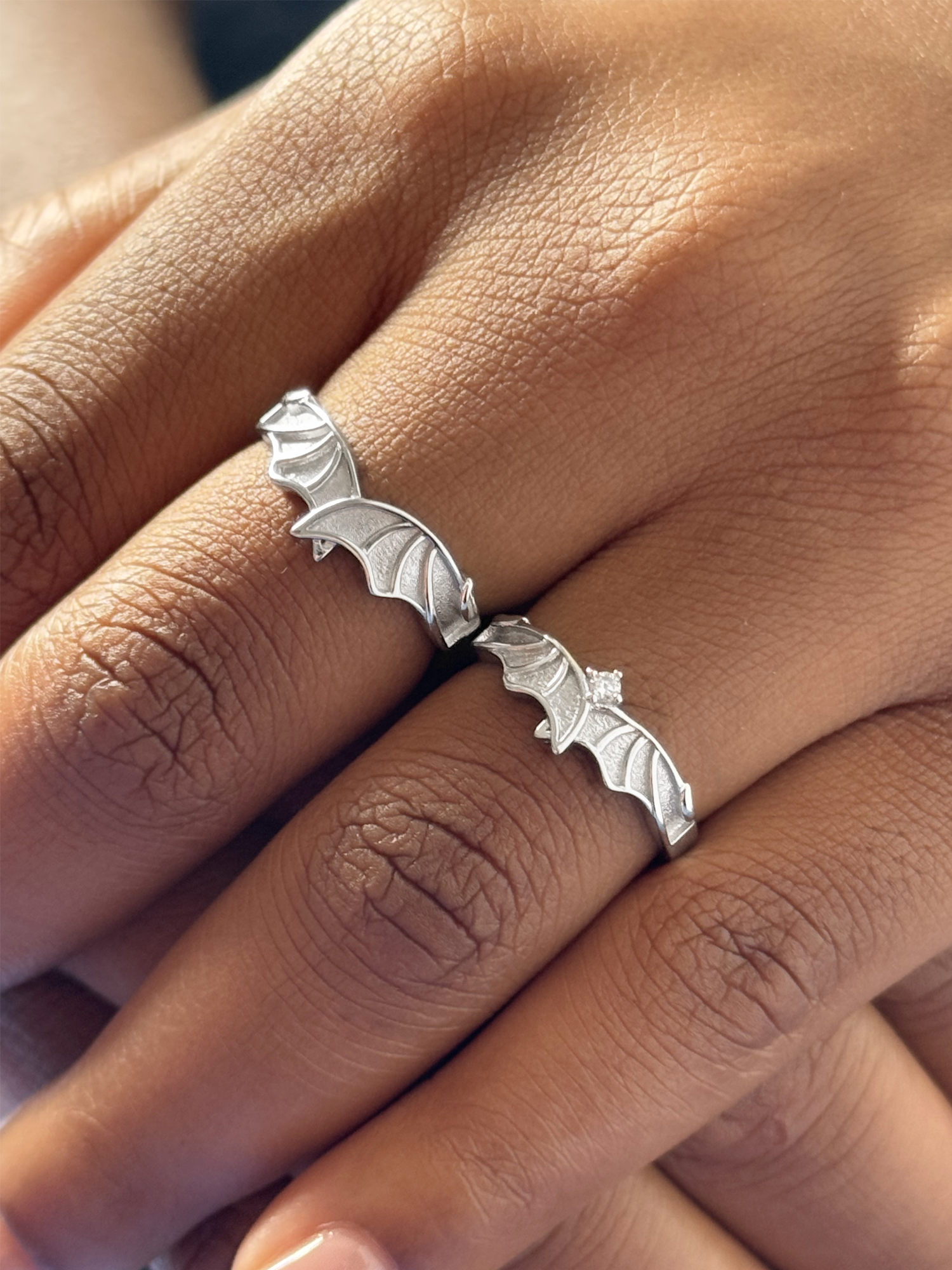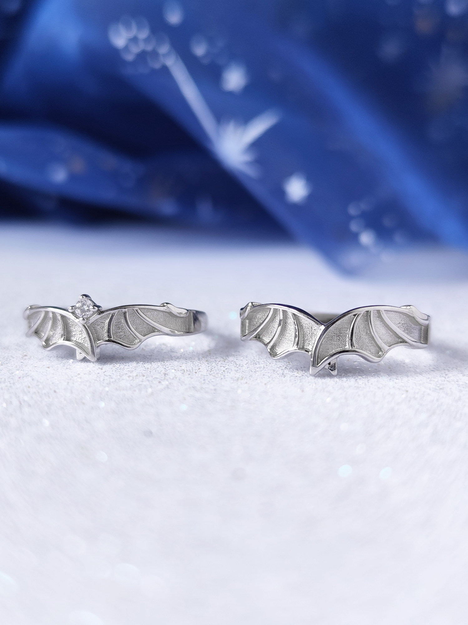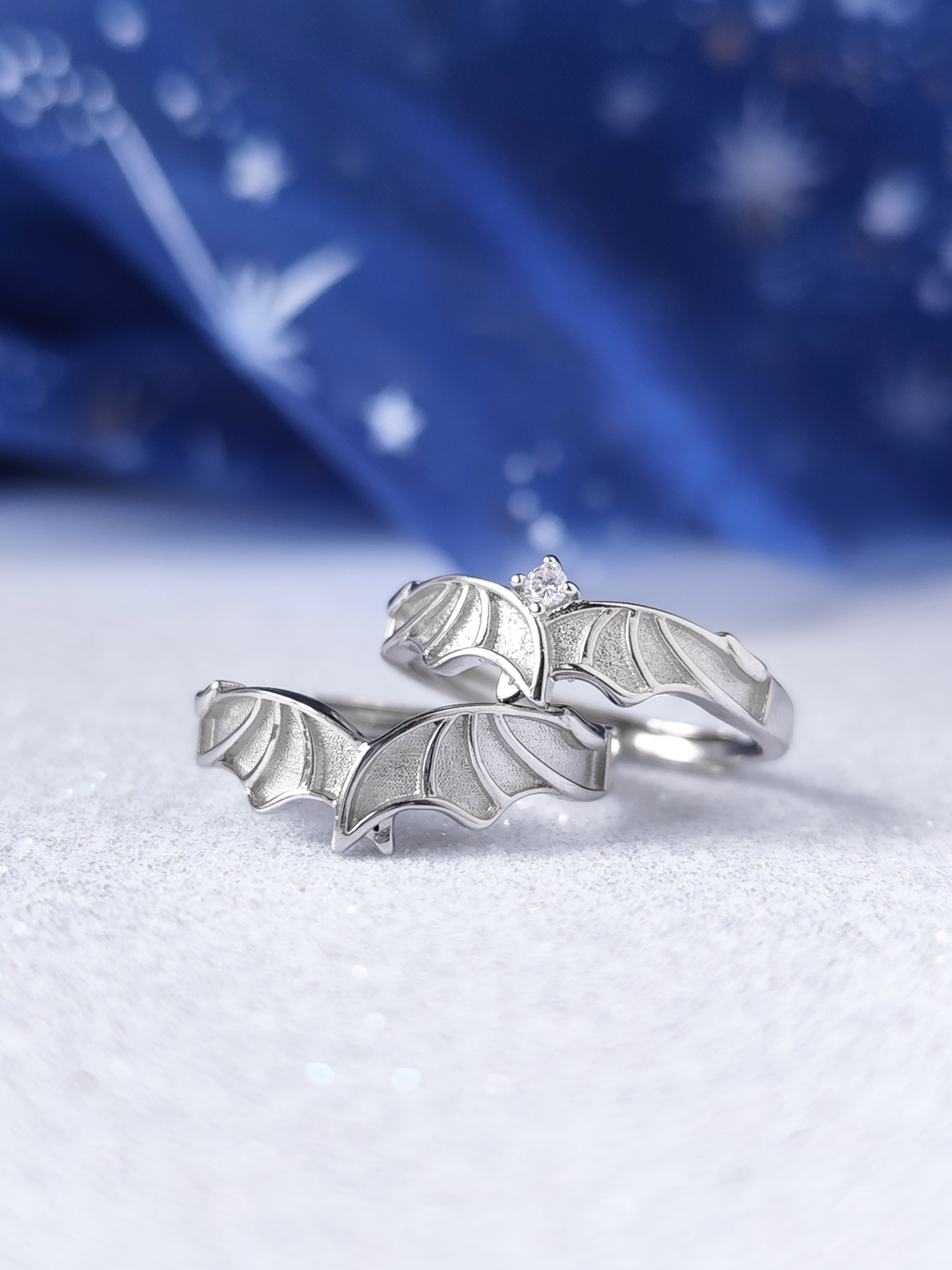 These dainty couple rings comes in the shape of a Illyrian wings. One rappresent Rhysand and the other one with a bright clear swarovski rappresent Feyre.