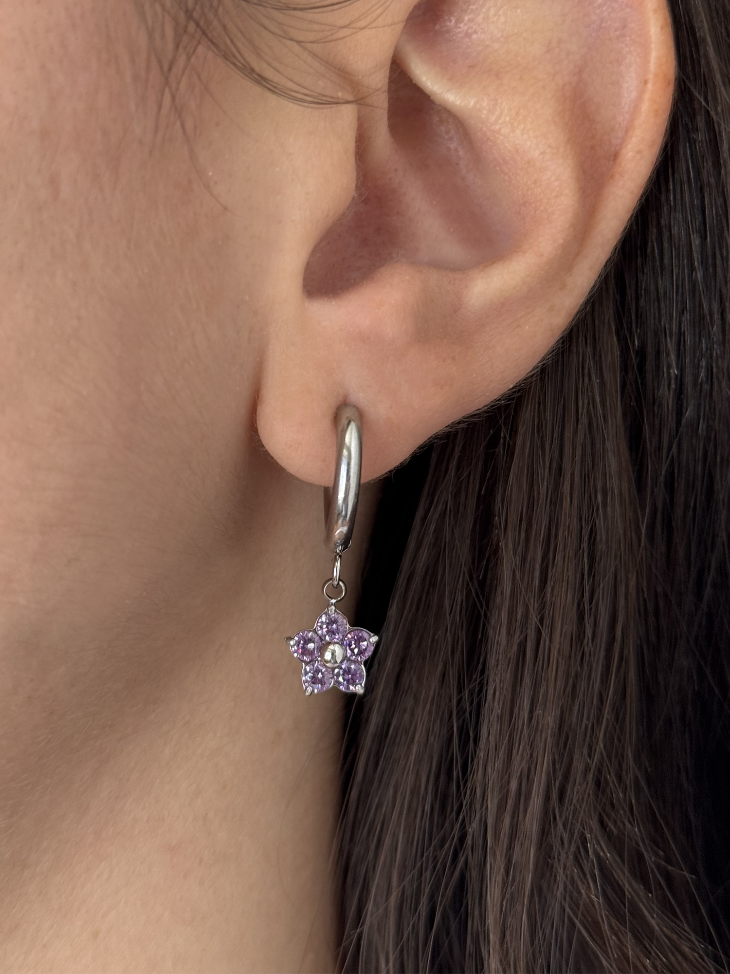 They are made entirely of stainless steel. The earrings comes with the shape of the Forget Me Not flower with bright purple shades crystals.