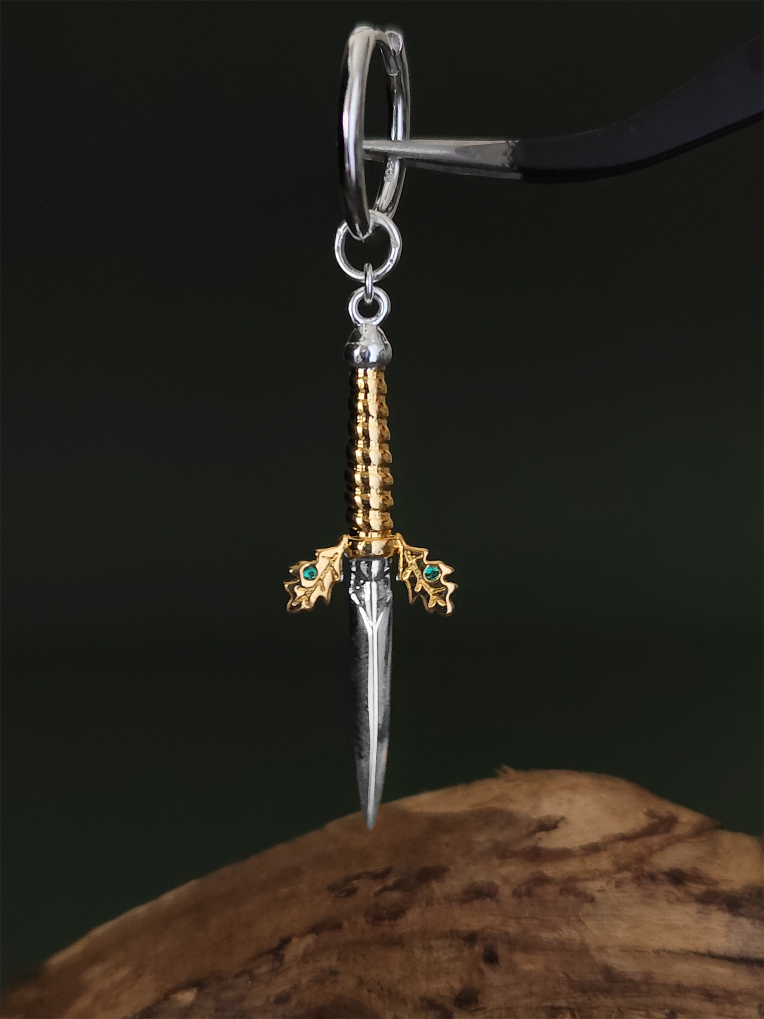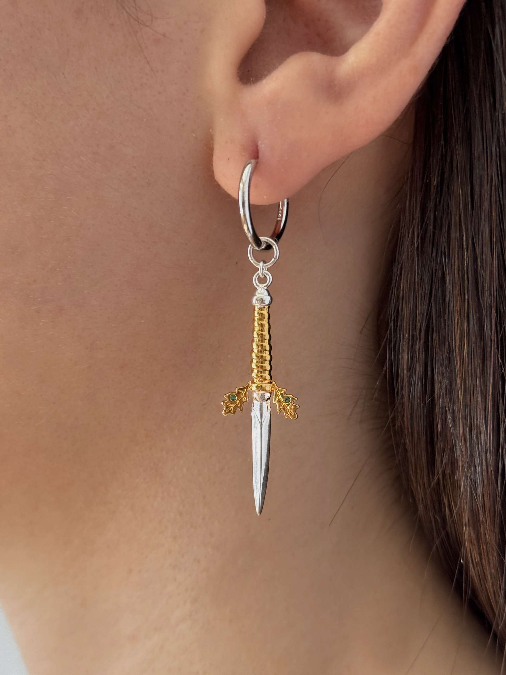 The earring is made entirely of sterling silver 925 and it has the shape of the Jude Duarte's dagger. The small dagger comes with a detailed pommel with two oak leaves and acorns with two bright emerald crystals.
