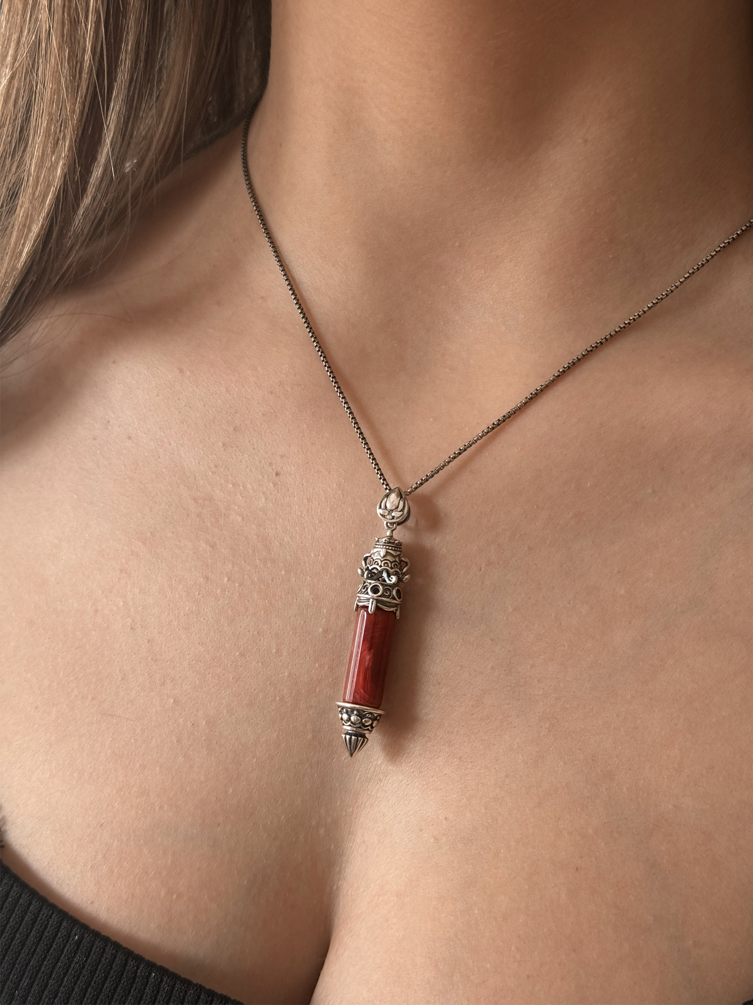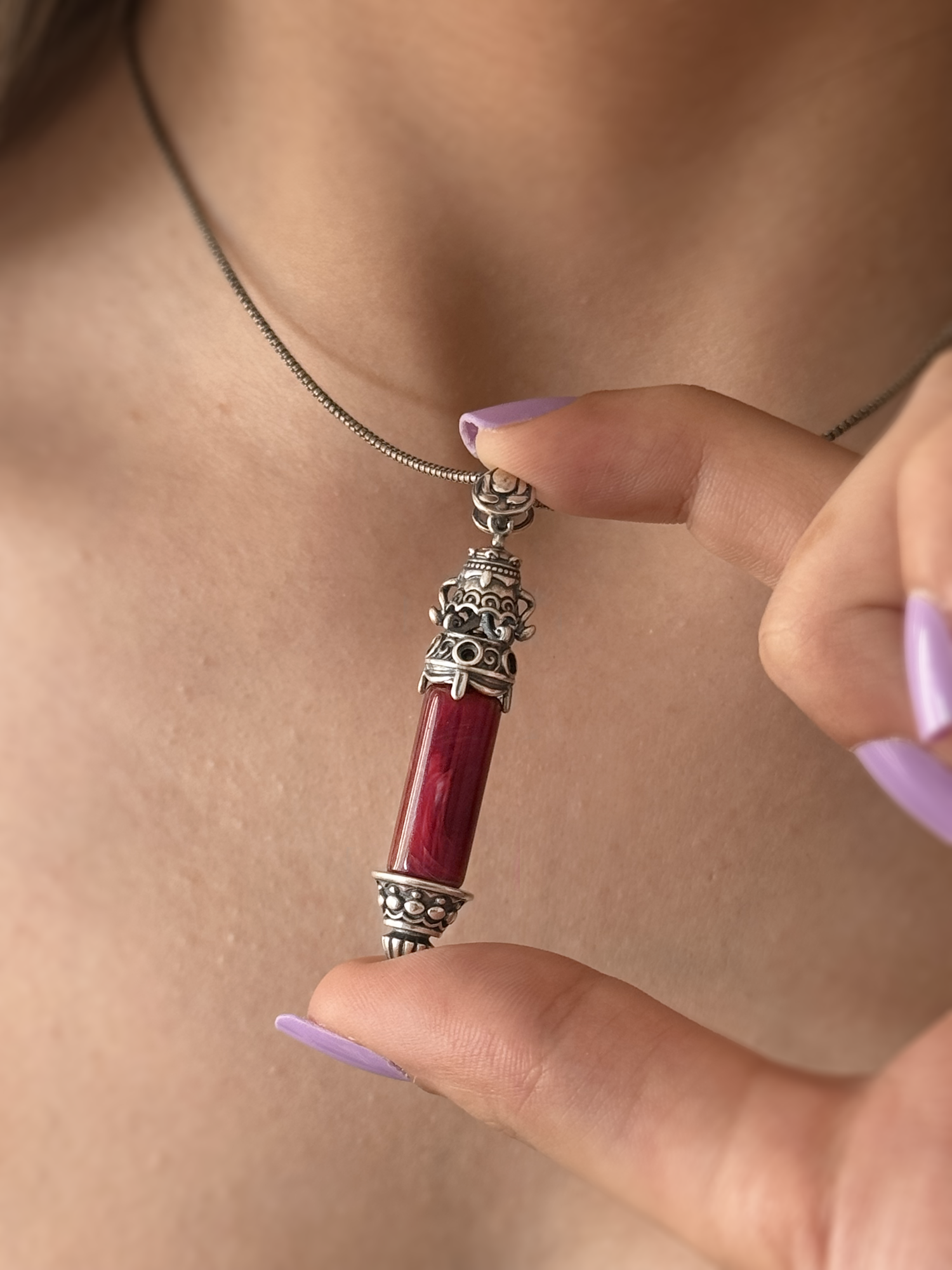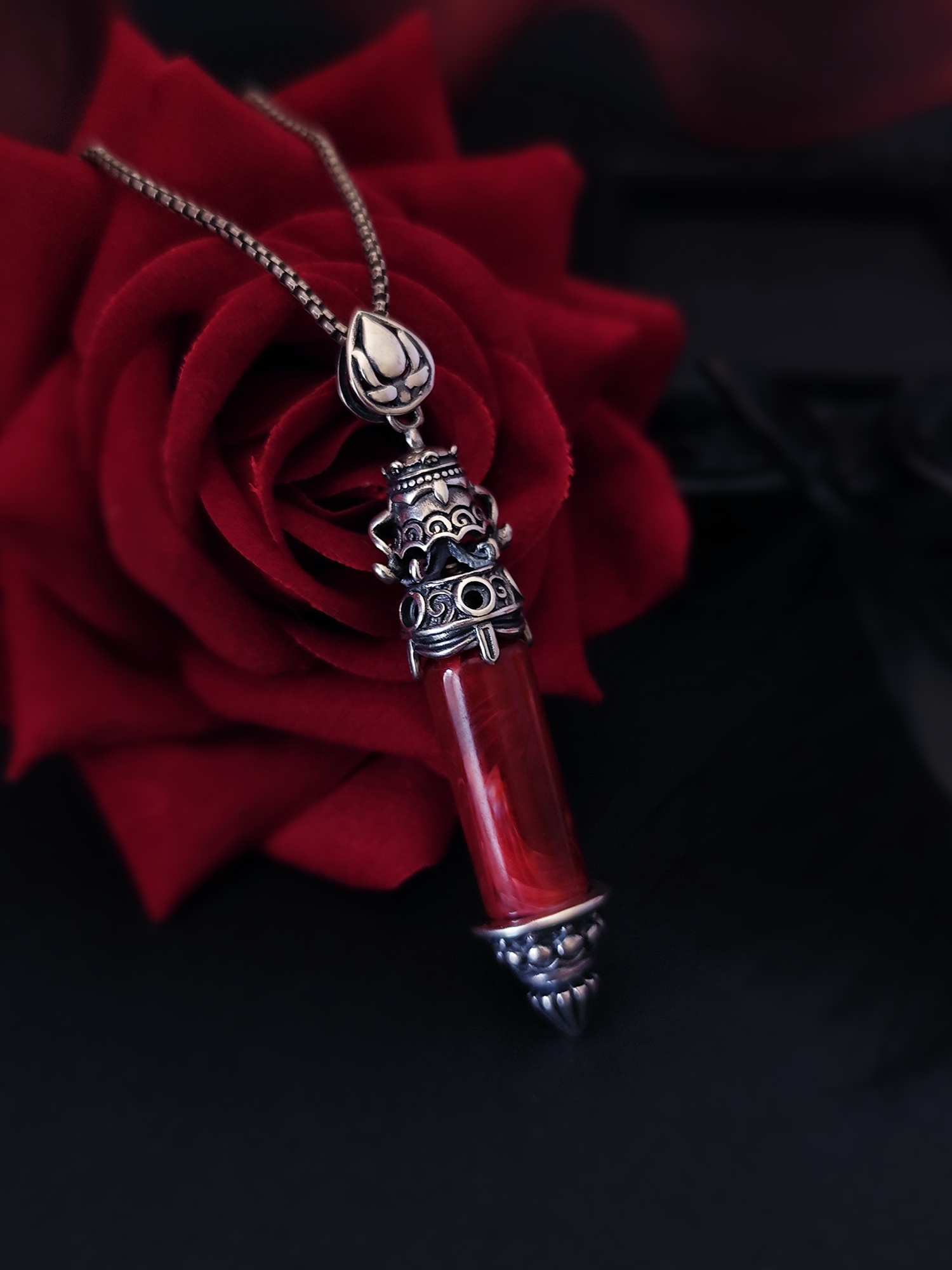 It is made entirely of 925 Sterling Silver. The pendant is really detailed with gothic ornaments and comes in the shape of Rune's blood vial. In the book every witch had these bottles filled with human blood. Witches used this blood to cast spells.