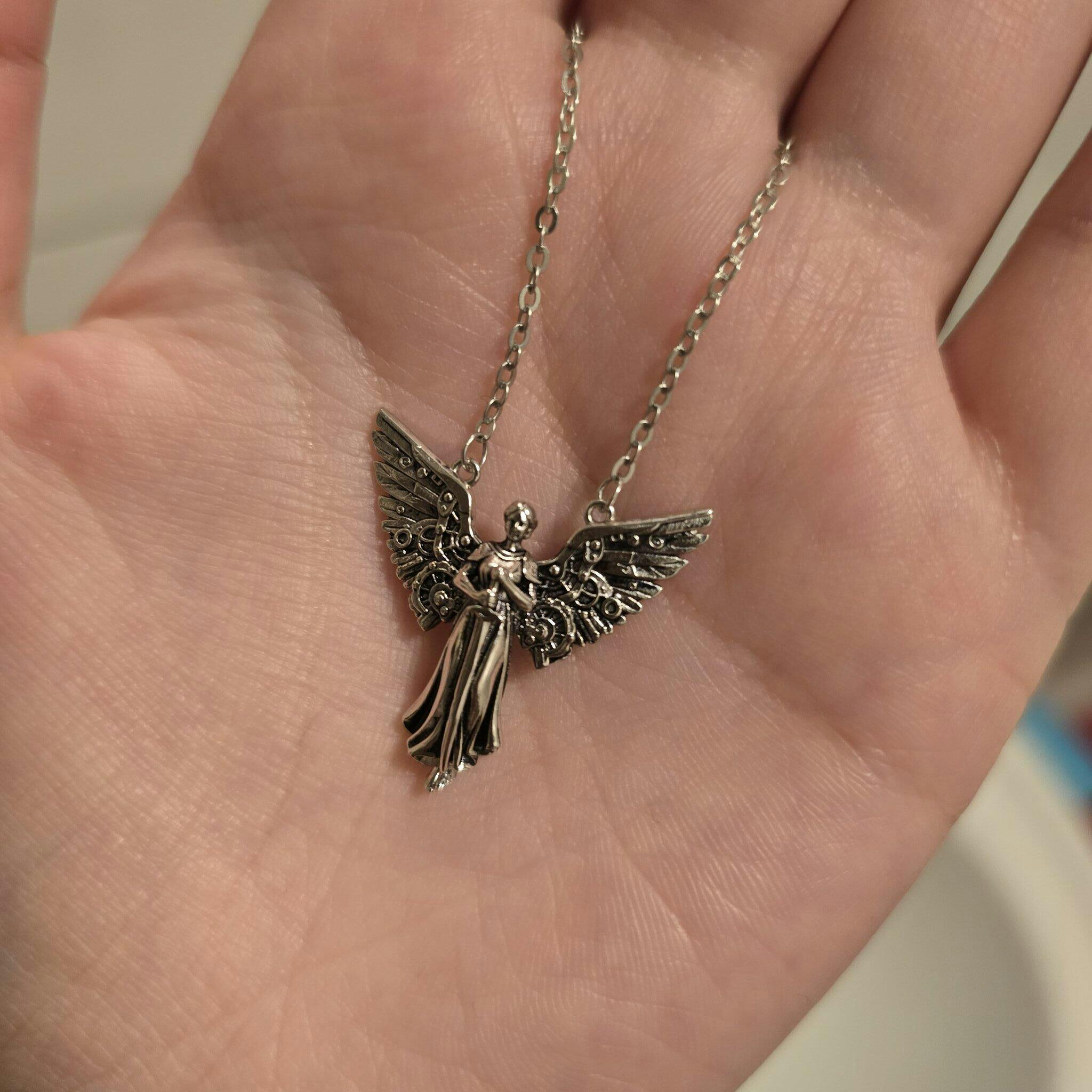It is made entirely of sterling silver 925 with antique silver finish. The pendant comes in the shape of the Tessa's Clockwork Angel amulet. As you can see from photos the amulet is really detailes and it had the soul of the angel Ithuriel trapped inside of it in order to protect Tessa from death.