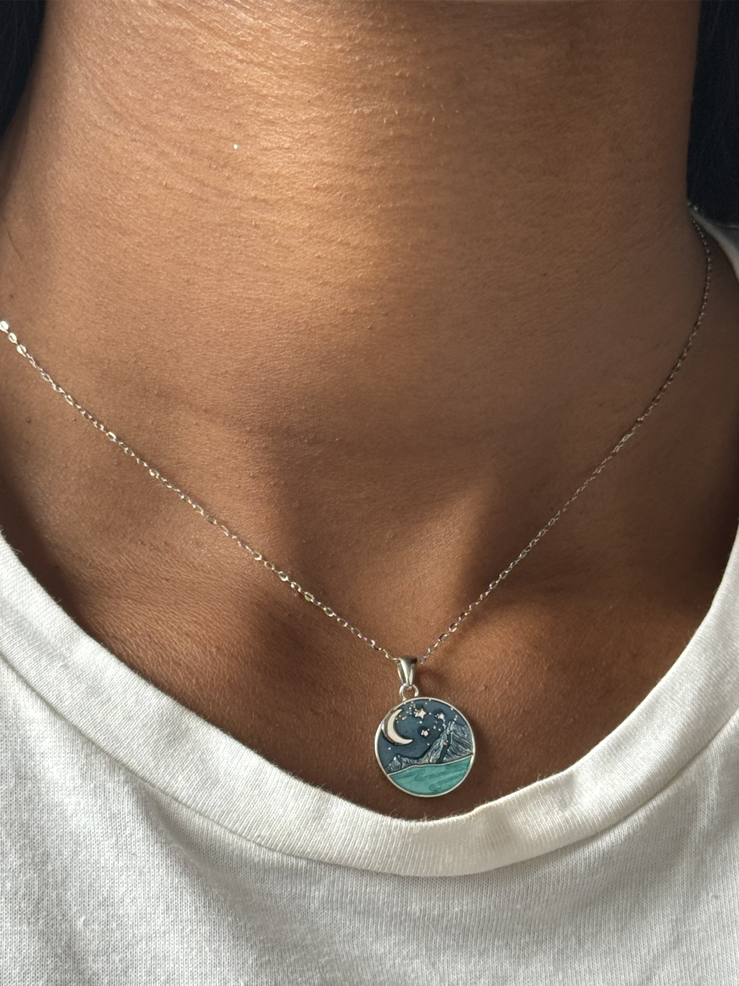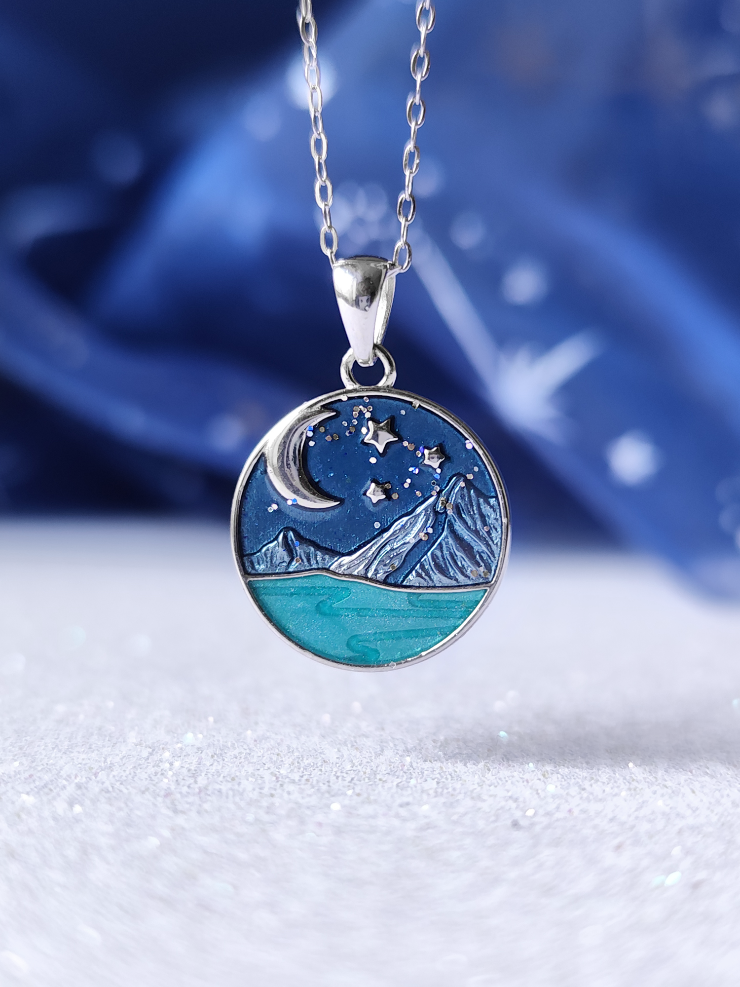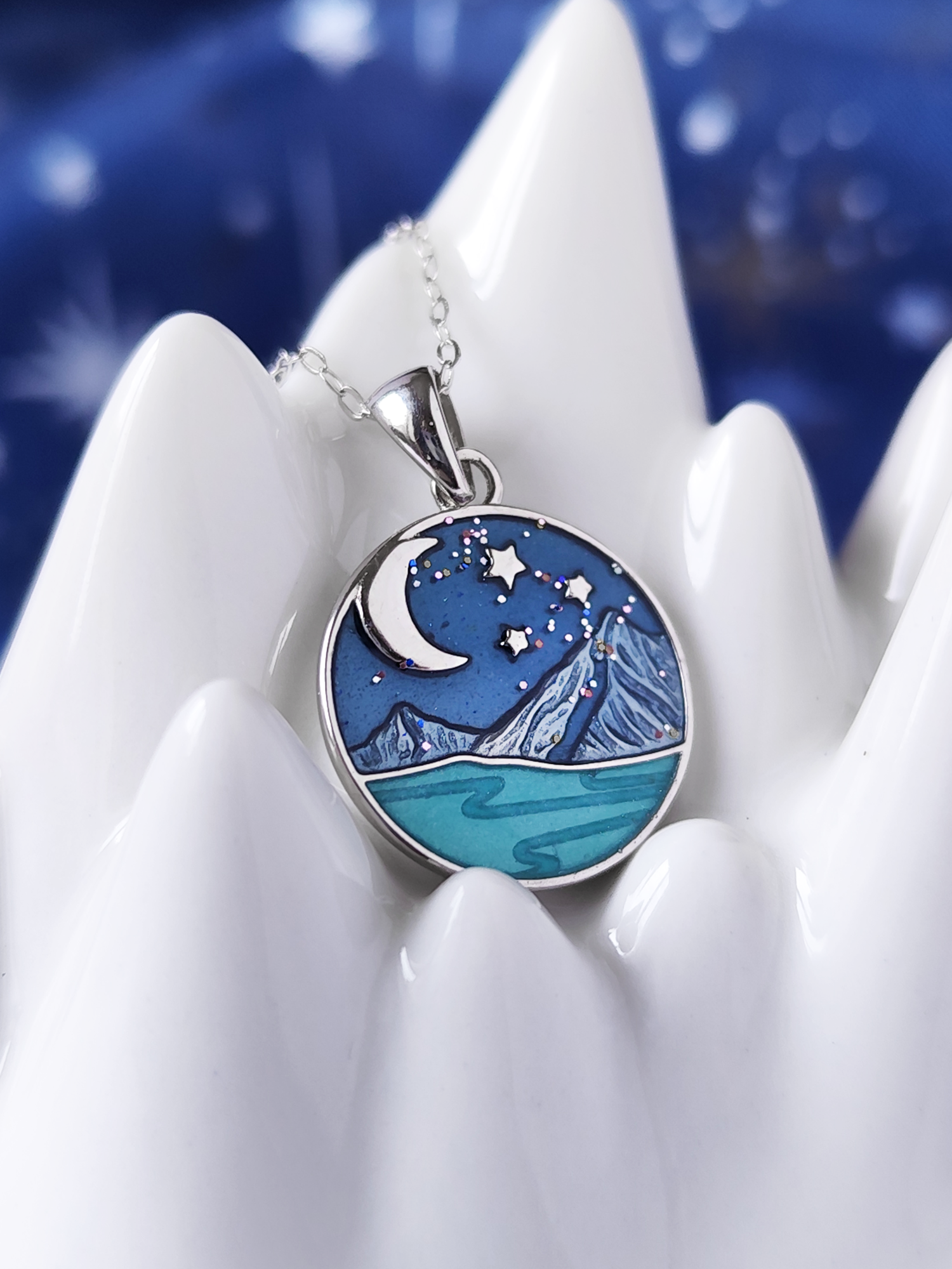 This pendant was inspired by Velaris, the hidden city on the western side of the Night Court of Prythian. The pendant is made of solid 925 sterling silver and comes in the shape of a round charm with painted the Starry sky of Velaris, its mountains and the Sidra River.