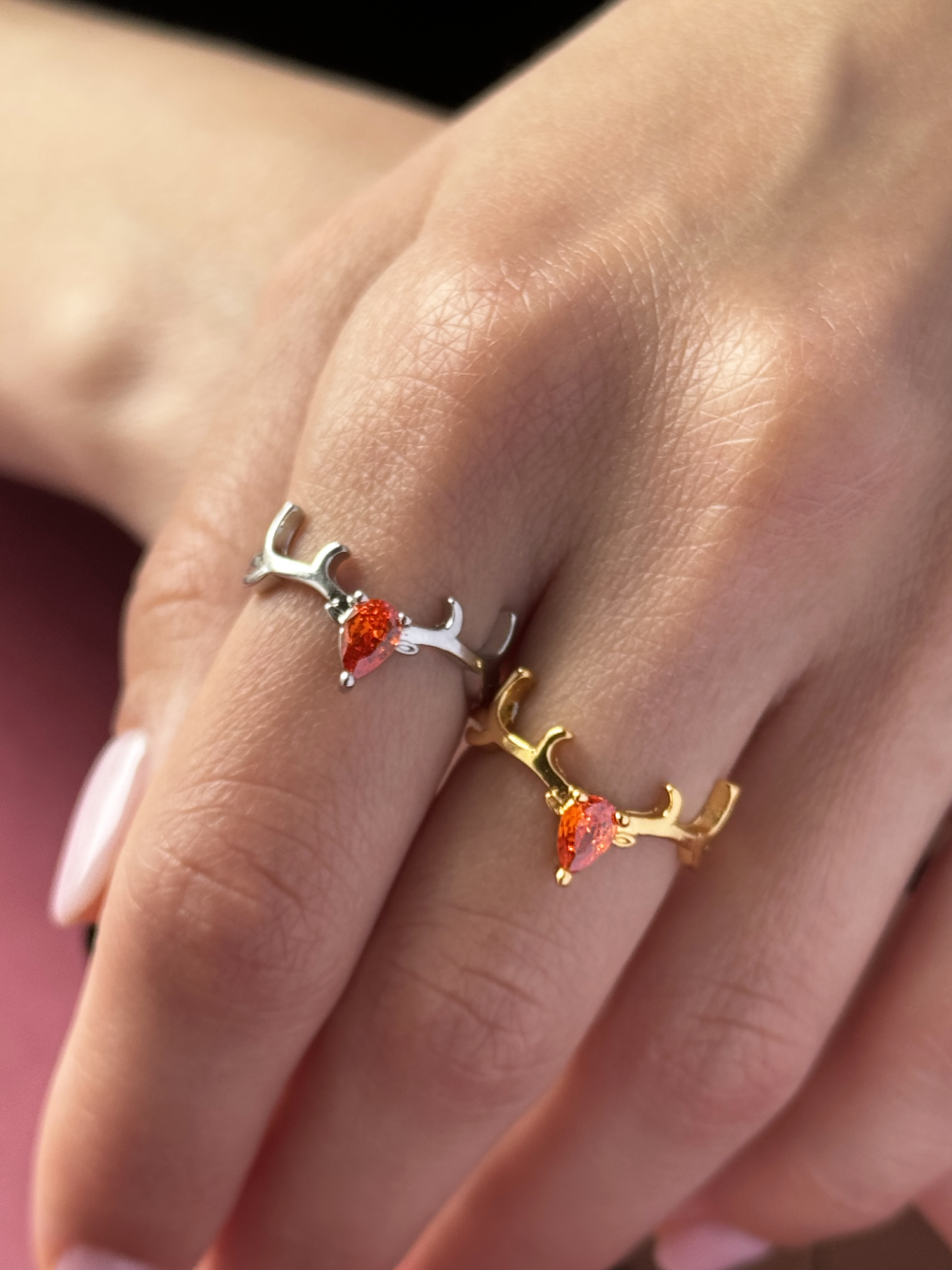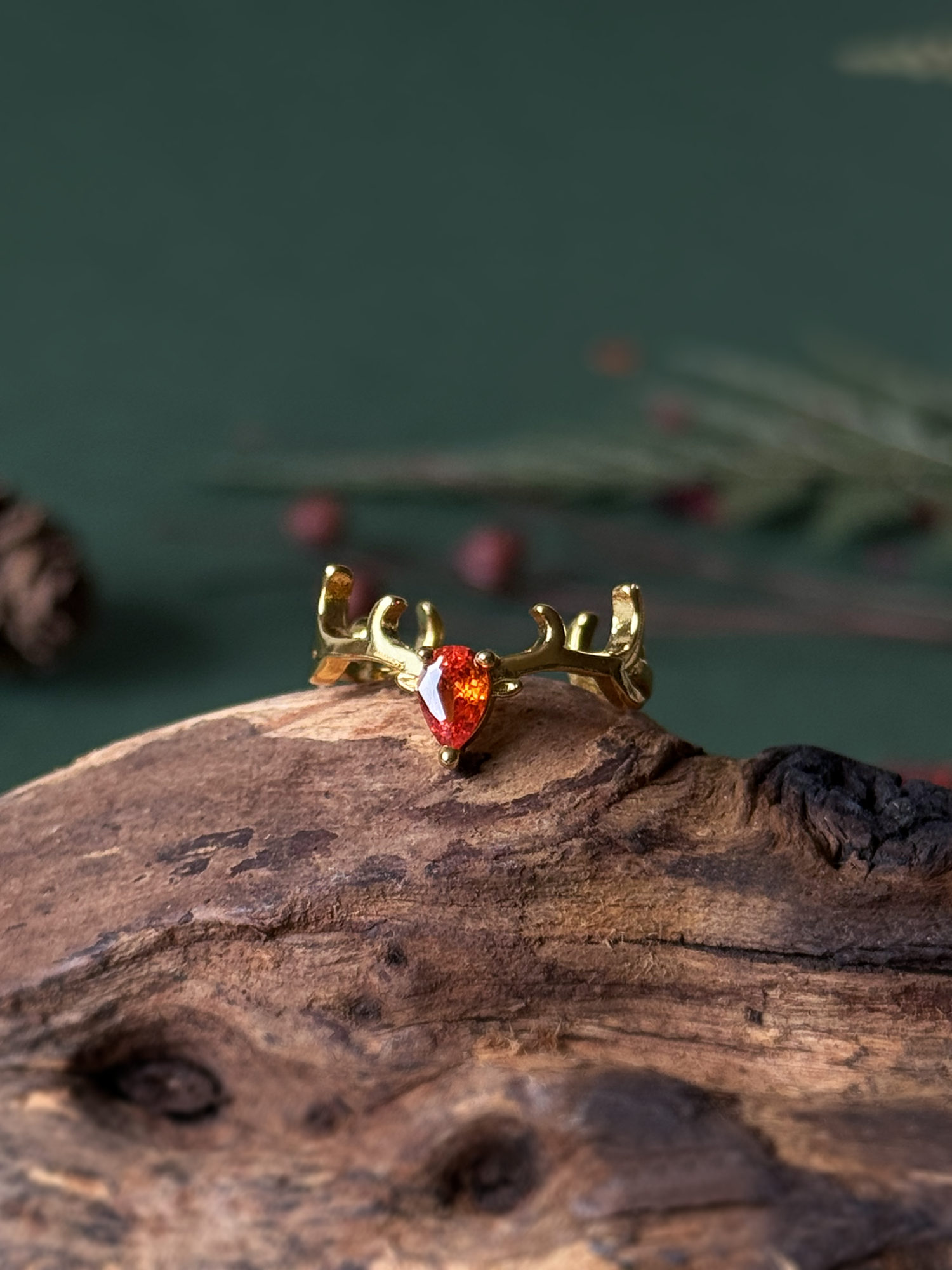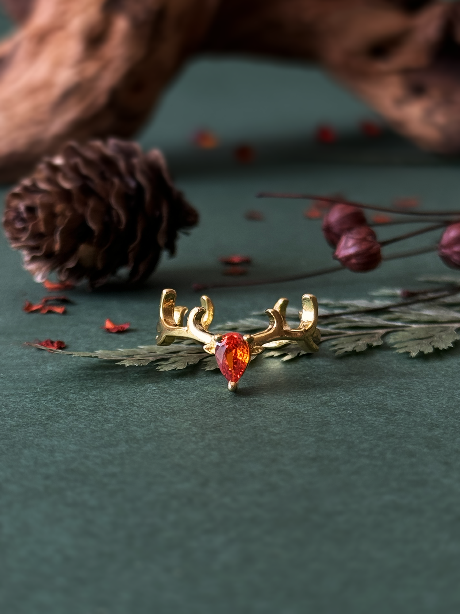 The dainty ring comes in the shape of Aelin's antlers crown that holds a bright and shiny faceted teardrop ember zircon.