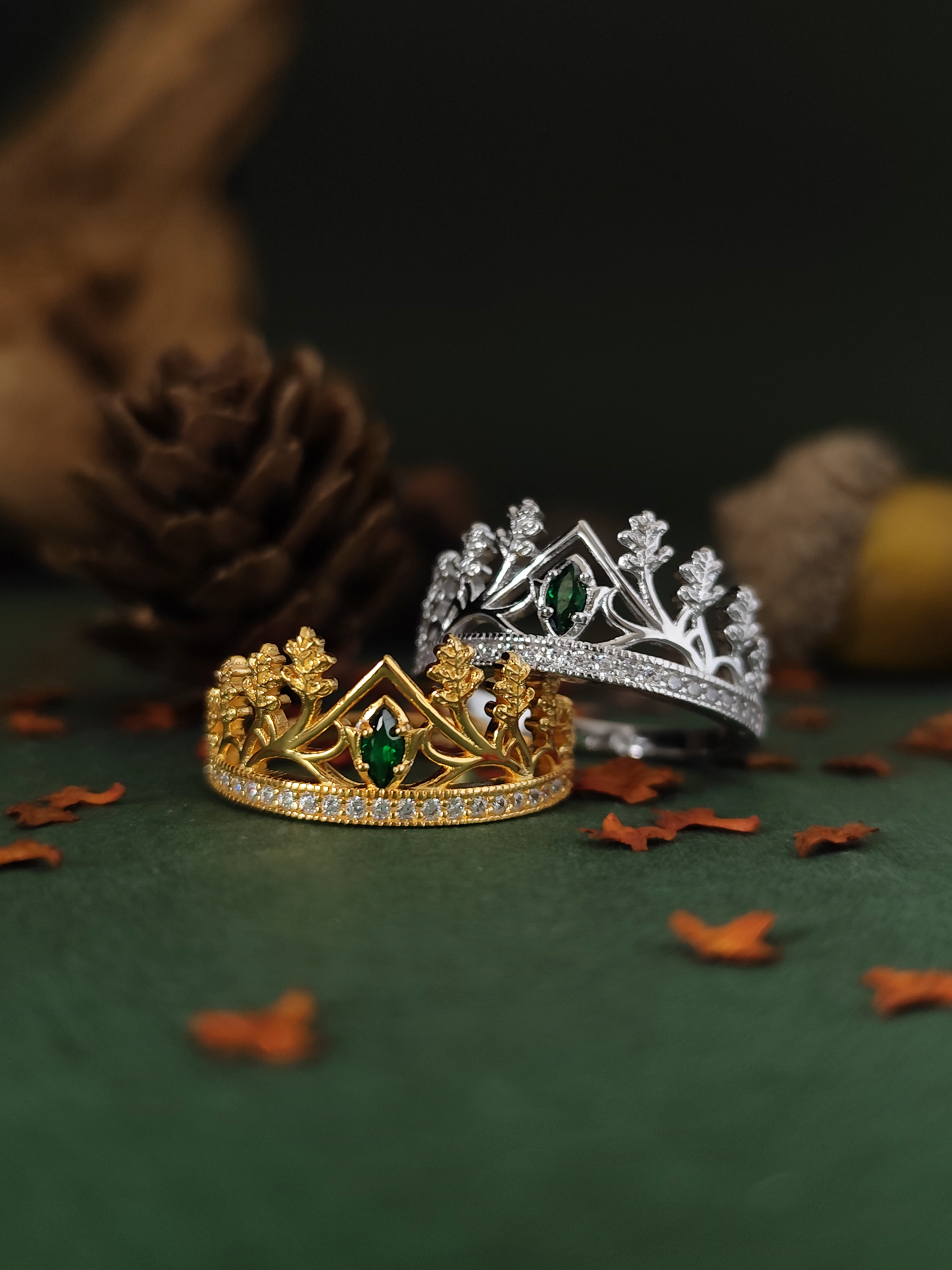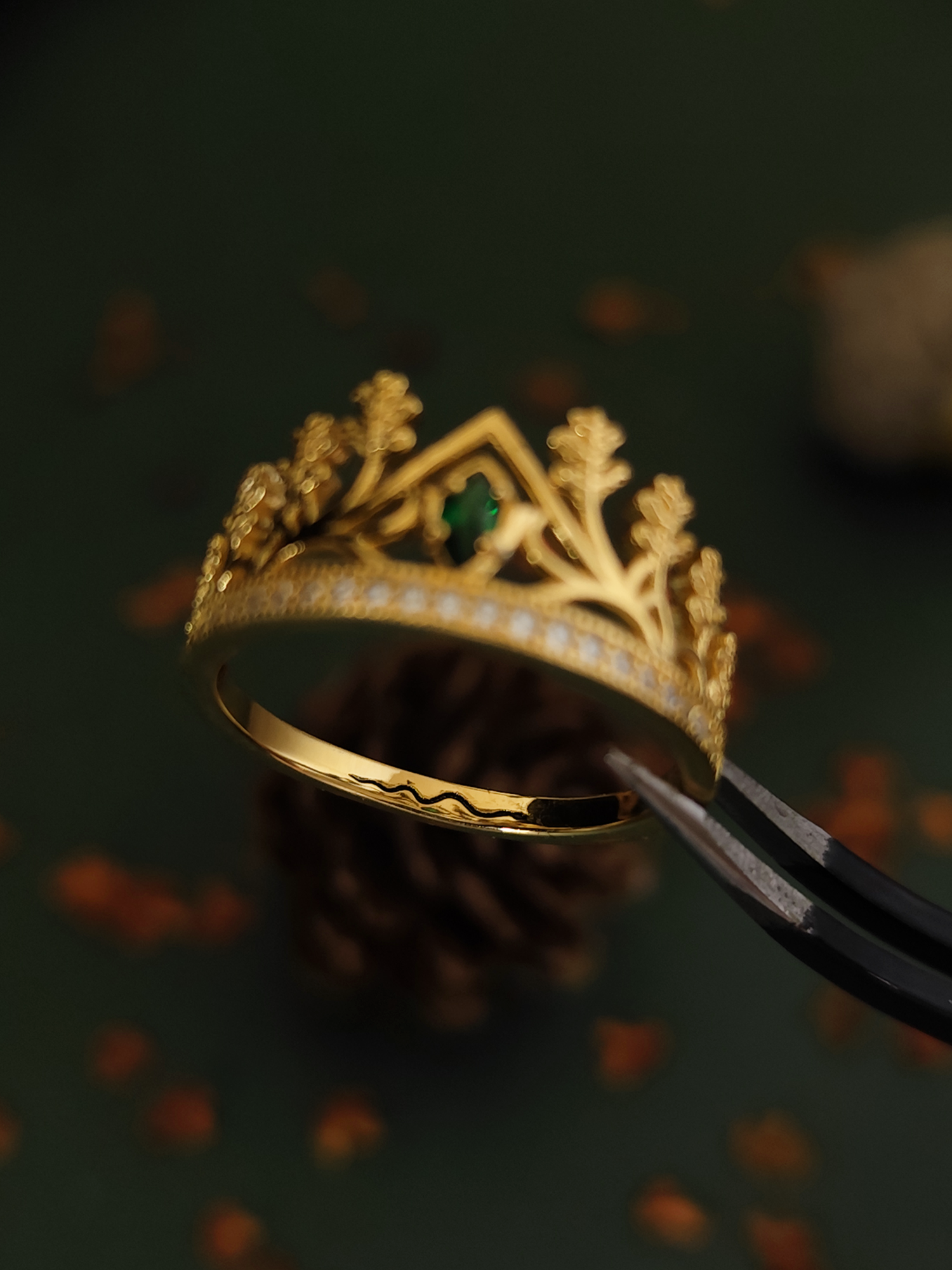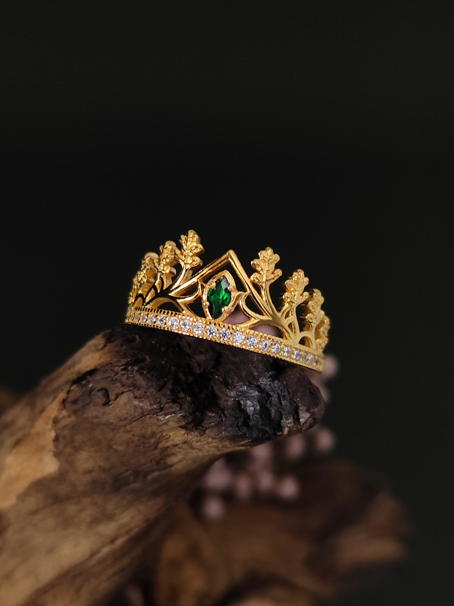 It is made entirely of pure sterling silver 925 plated 18k Gold. The rings comes in the shape of the crused Blood Crown, also know as the Crown of Elfhame. In the center of the ring a shiny emerald navette.