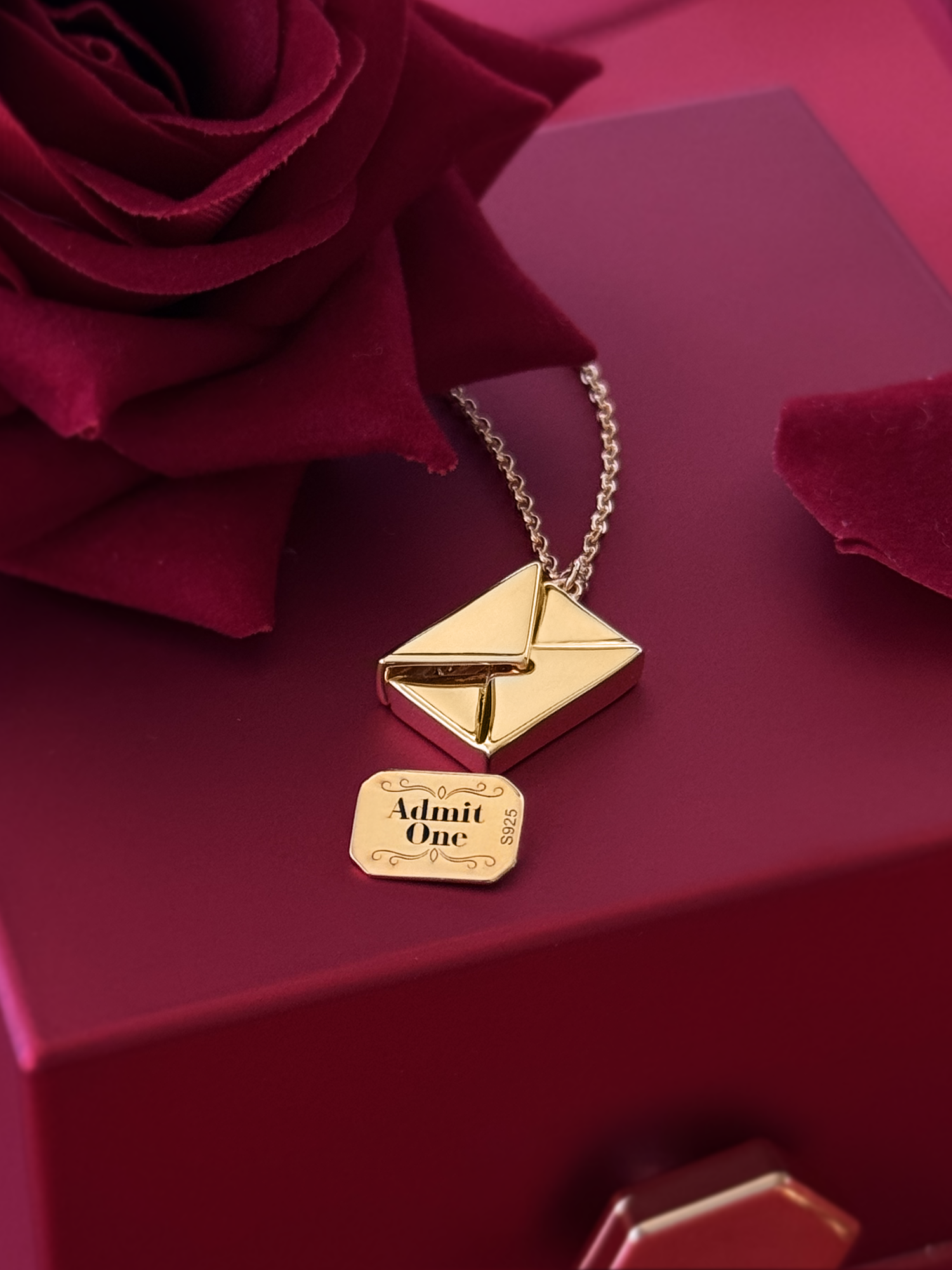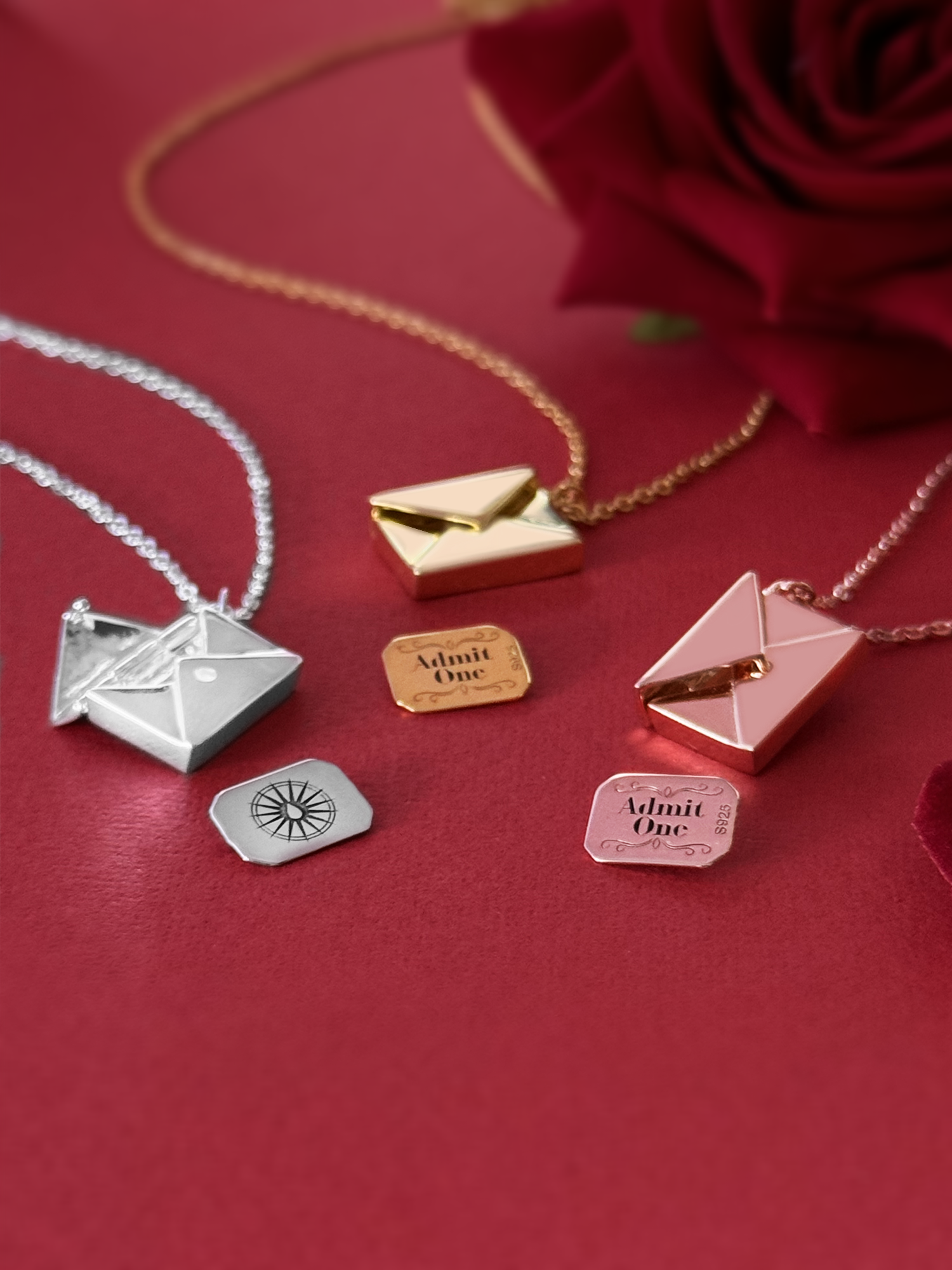 They comes in the shape of an openable envelope locket with inside a tiny Caraval game invitation with engraved the "admit one" text and the game logo.