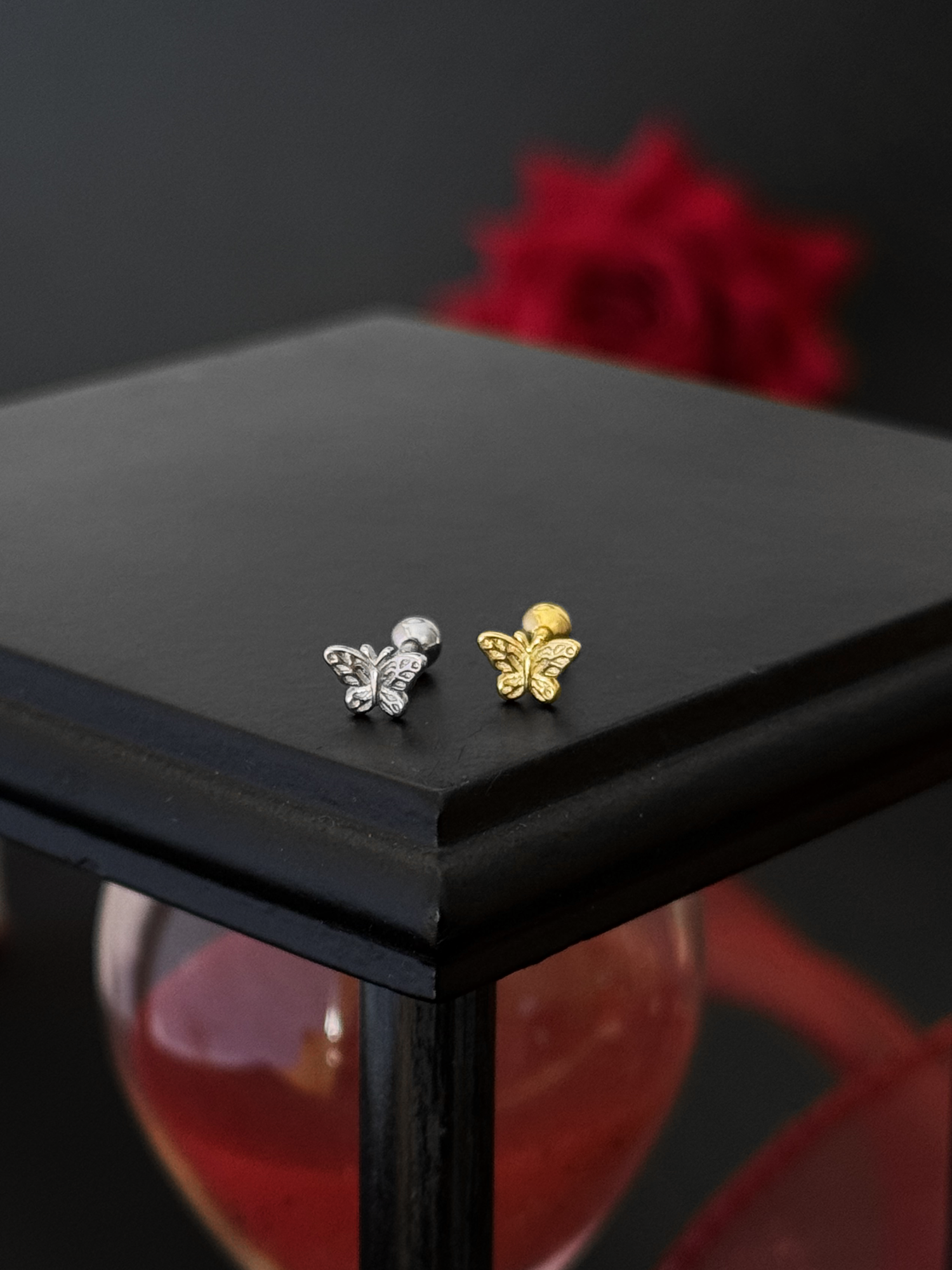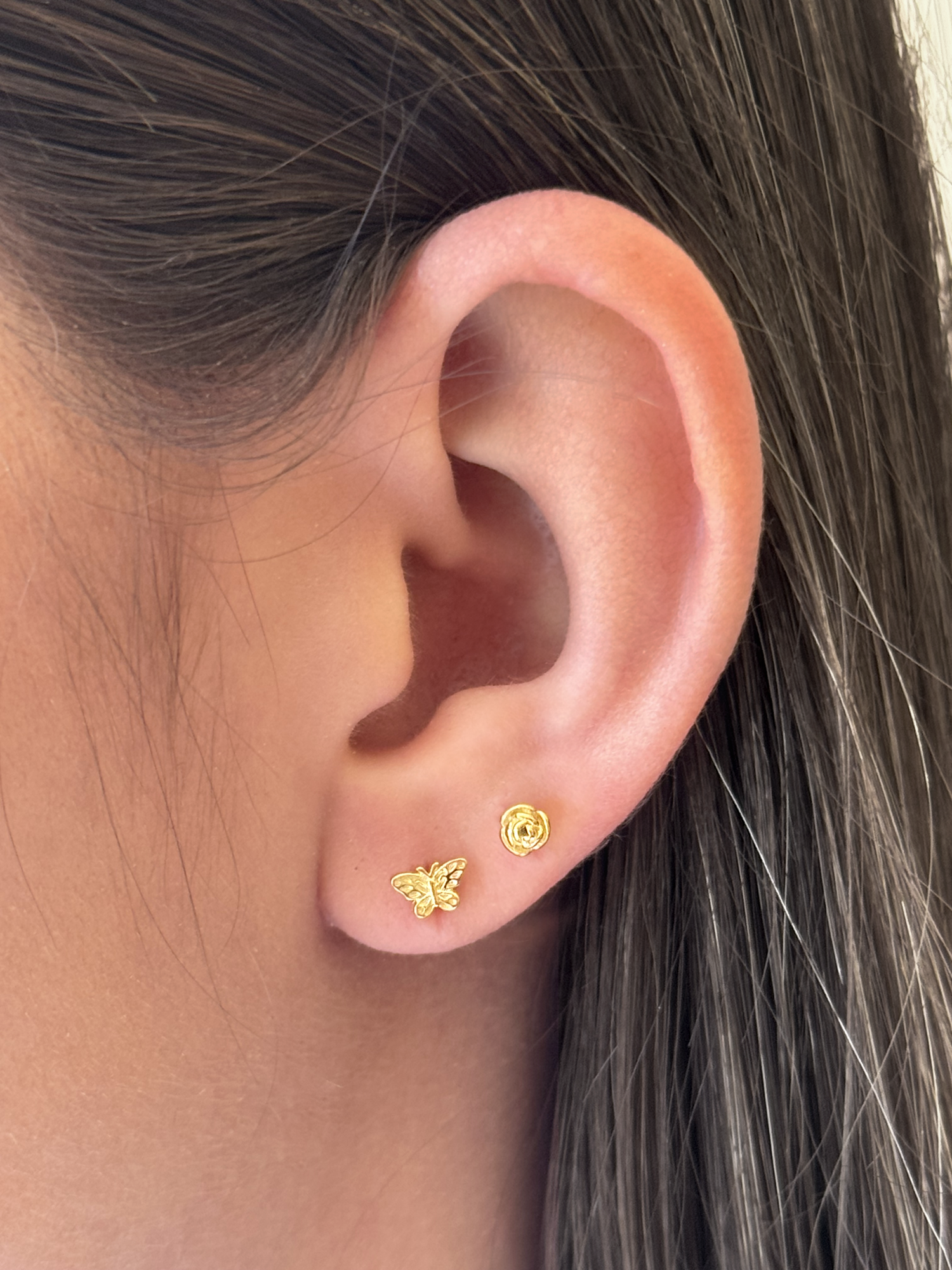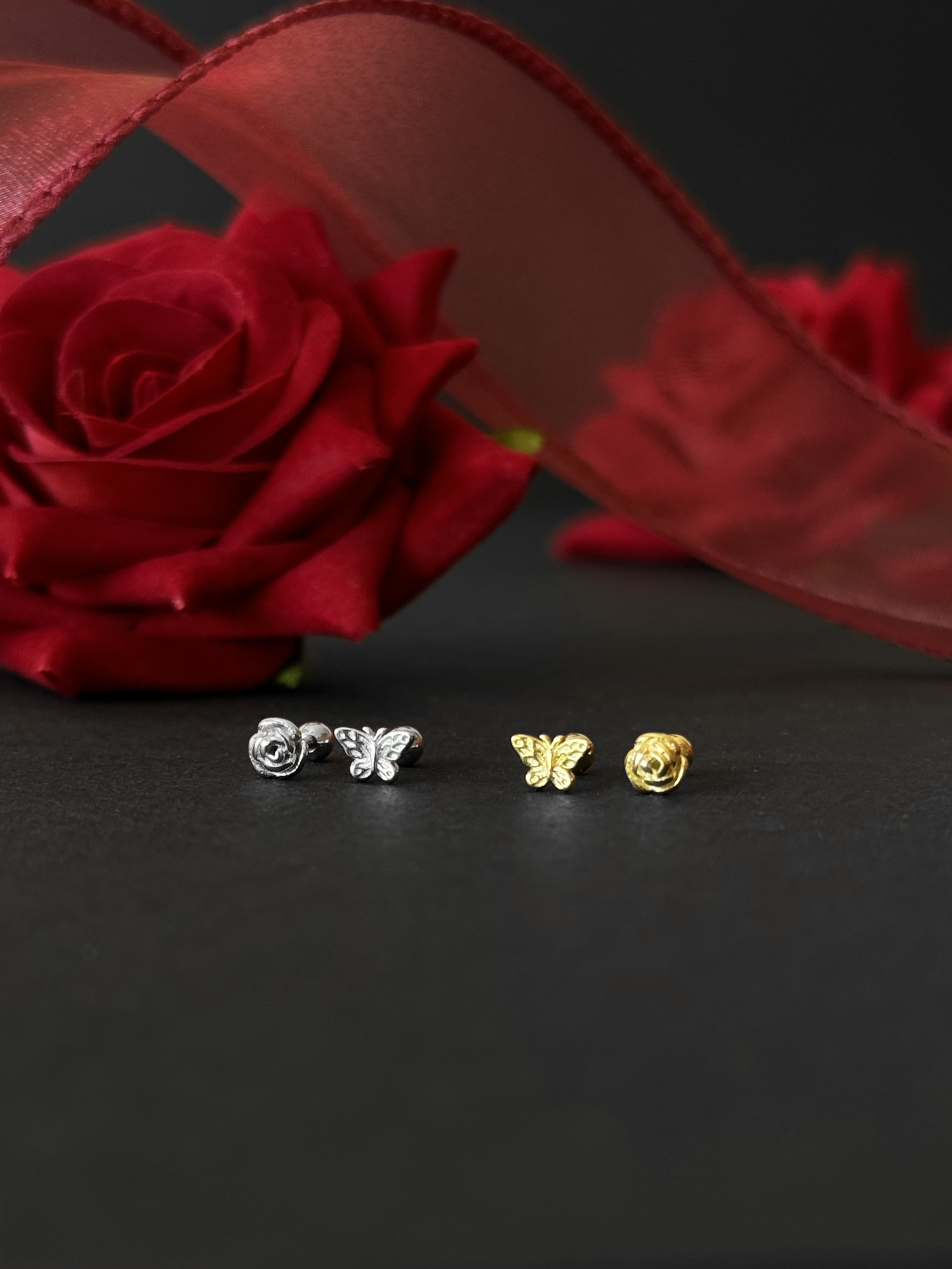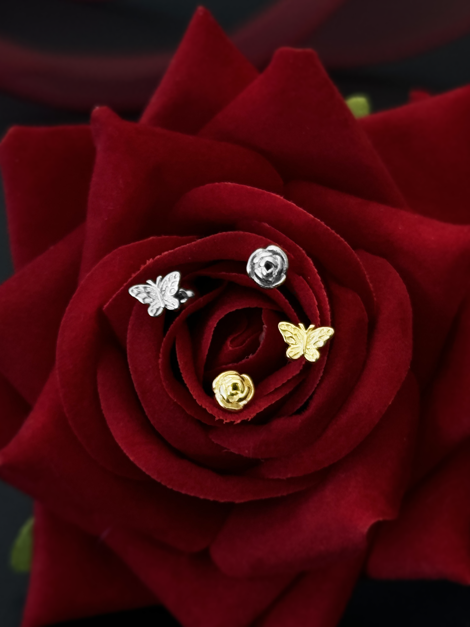 These stud earrings comes in the shape of a rose flower that symbolize Scarlett and a butterfly to symbolize Donatella.