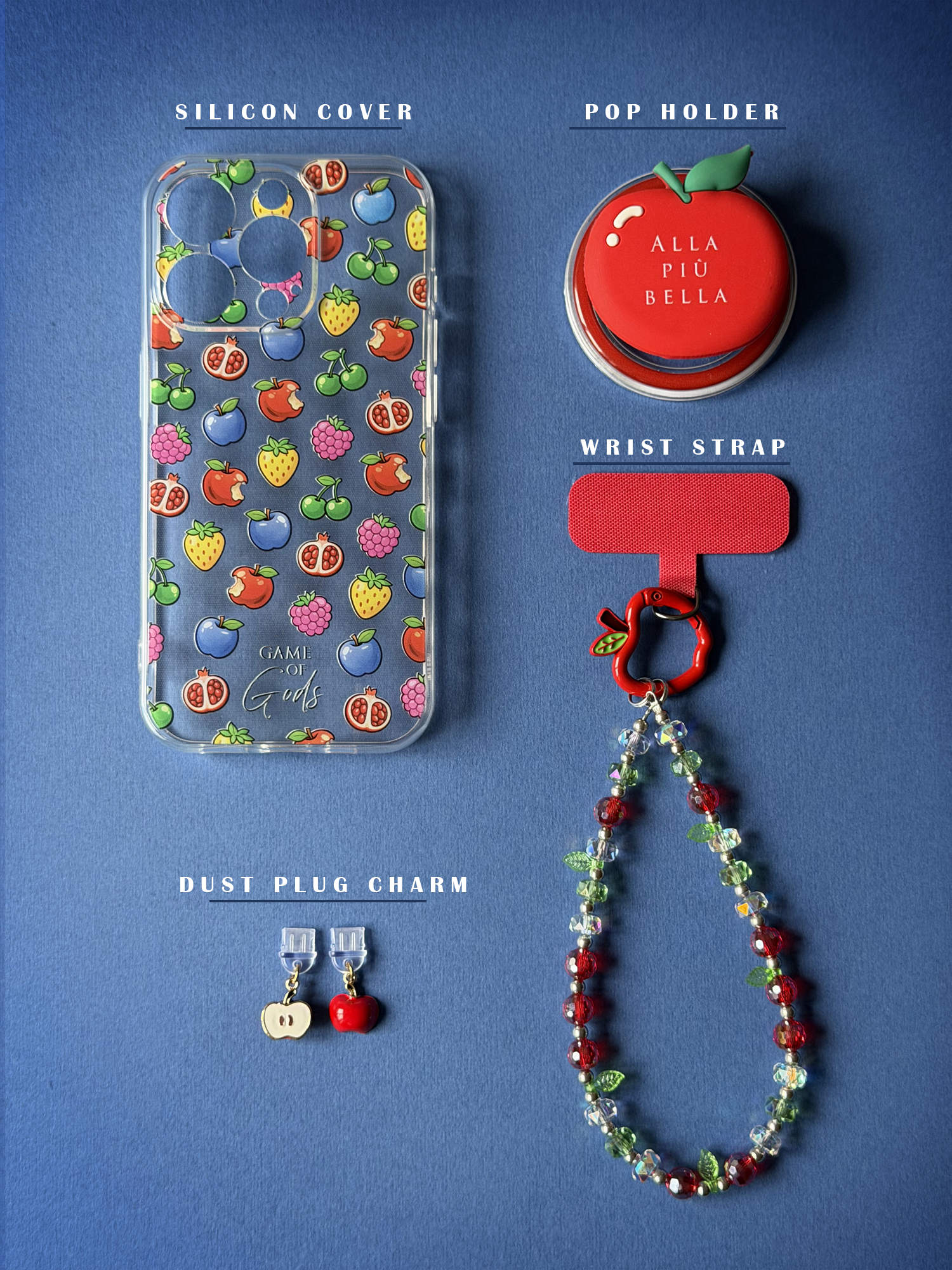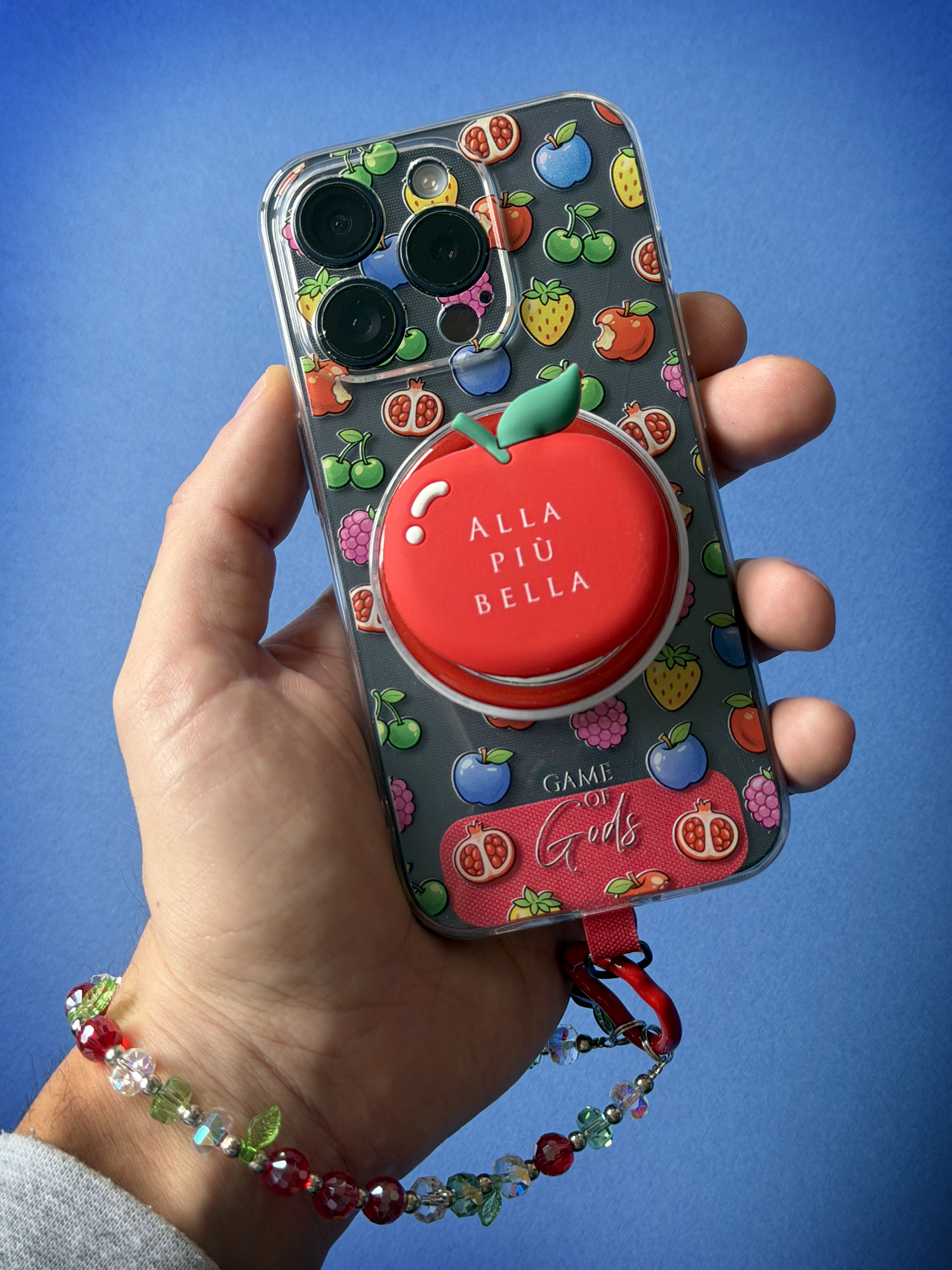 - Cover Macedonia in silicone trasparente con i fruttini più iconici della Game of Gods.