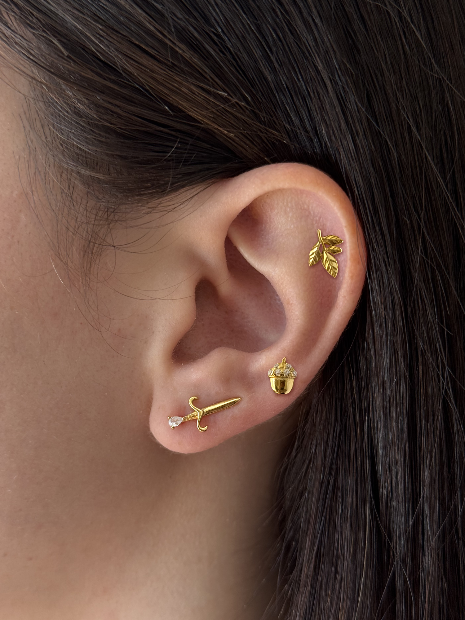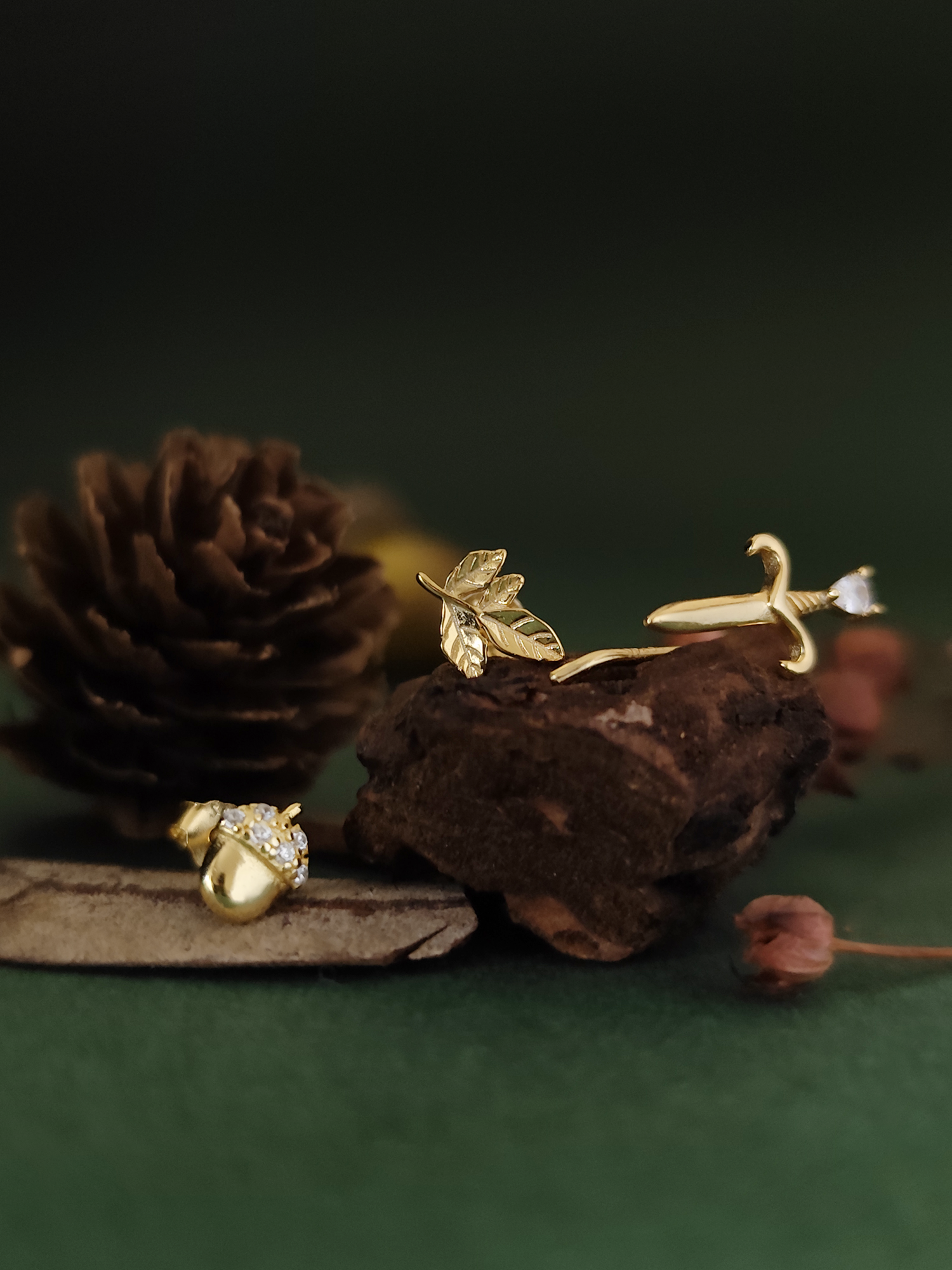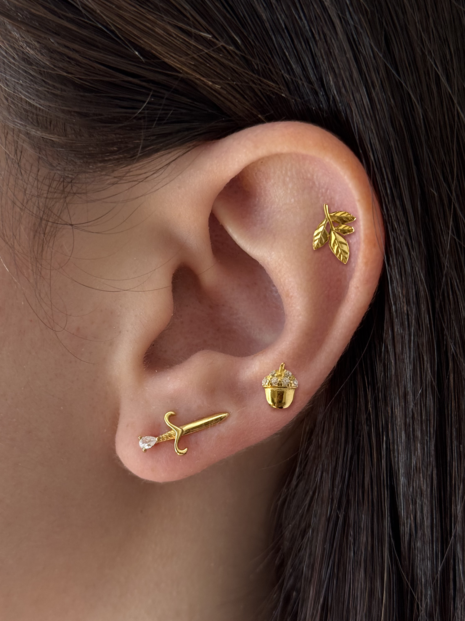 They are made entirely of sterling silver 925 plated 18k Gold. The earrings comes with the shape of Jude's dagger, an acorn and a tiny oak leaf.