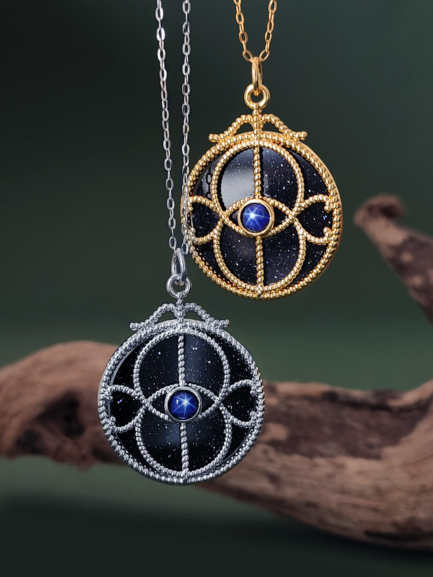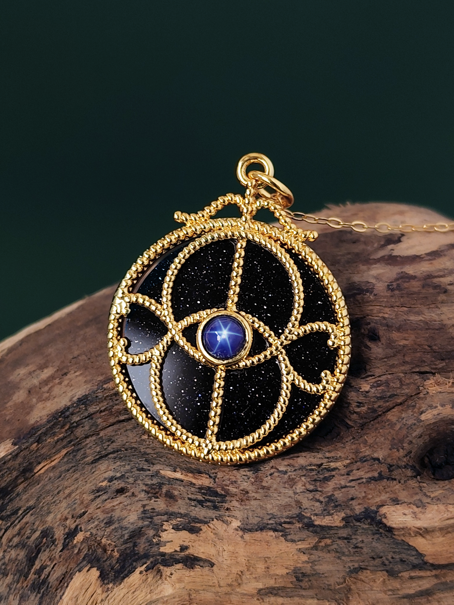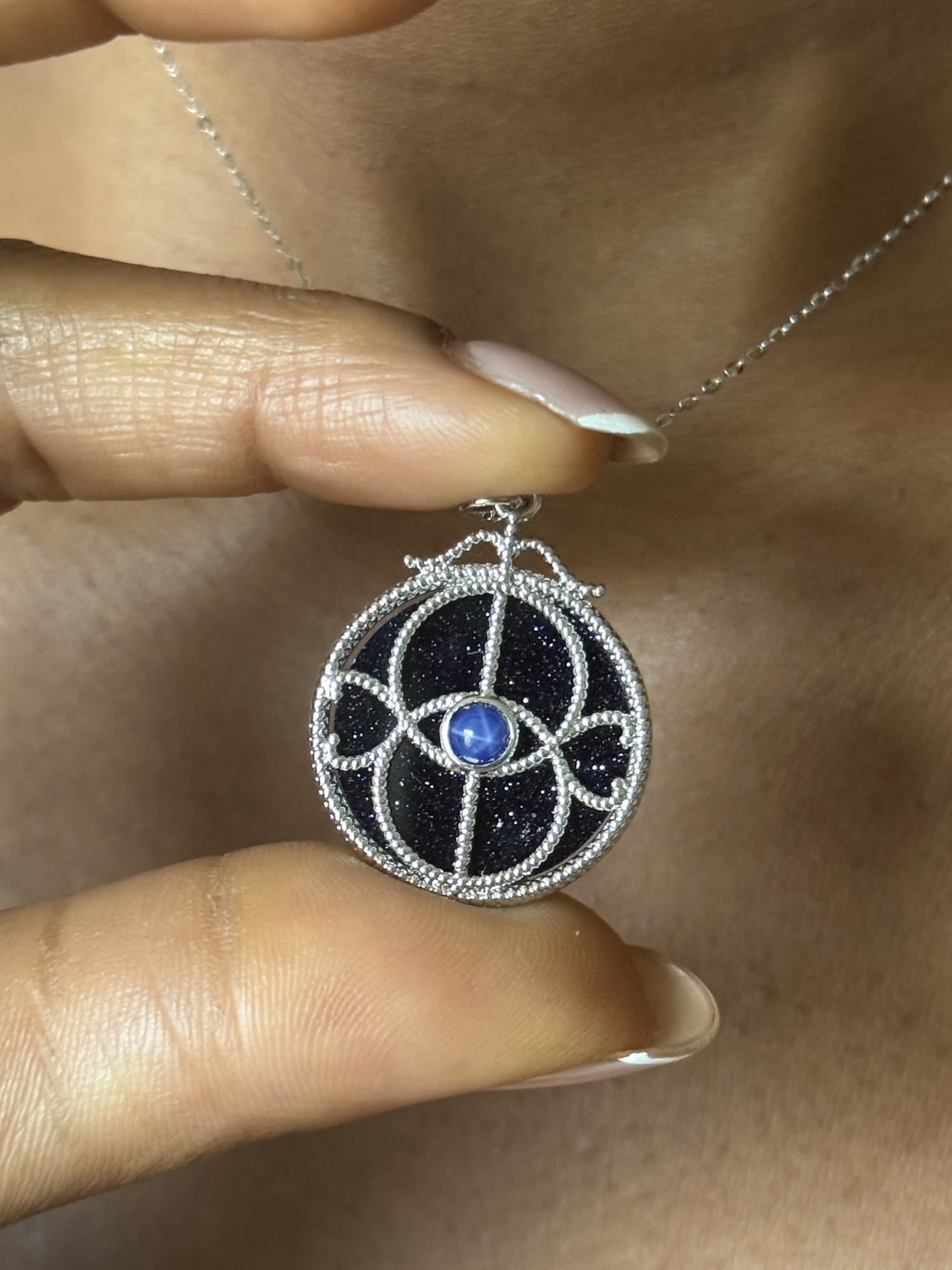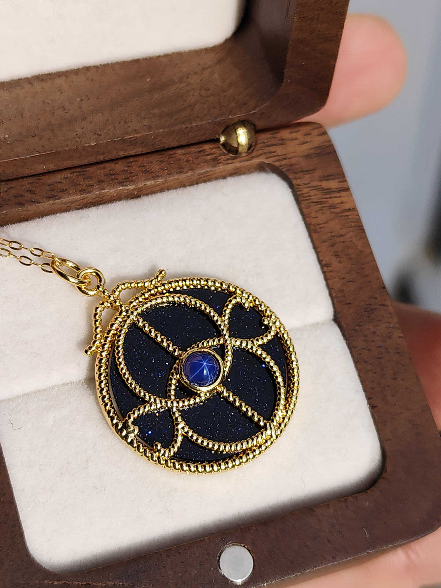 The gemstone is made of blue star sapphire stone and the beautiful and shiny backside is a blue sandstone.