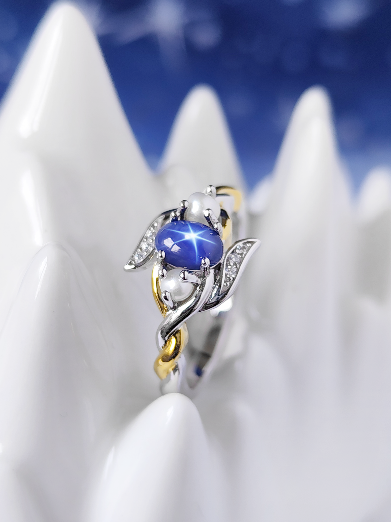 This beautiful ring is a special and unique piece of jewel for you your best friends and a perfect gift for any occasion. It is made entirely of solid sterling silver 925 with 18k Gold plated band. The ring comes also with two small real pearls and a blue star sapphire stone.