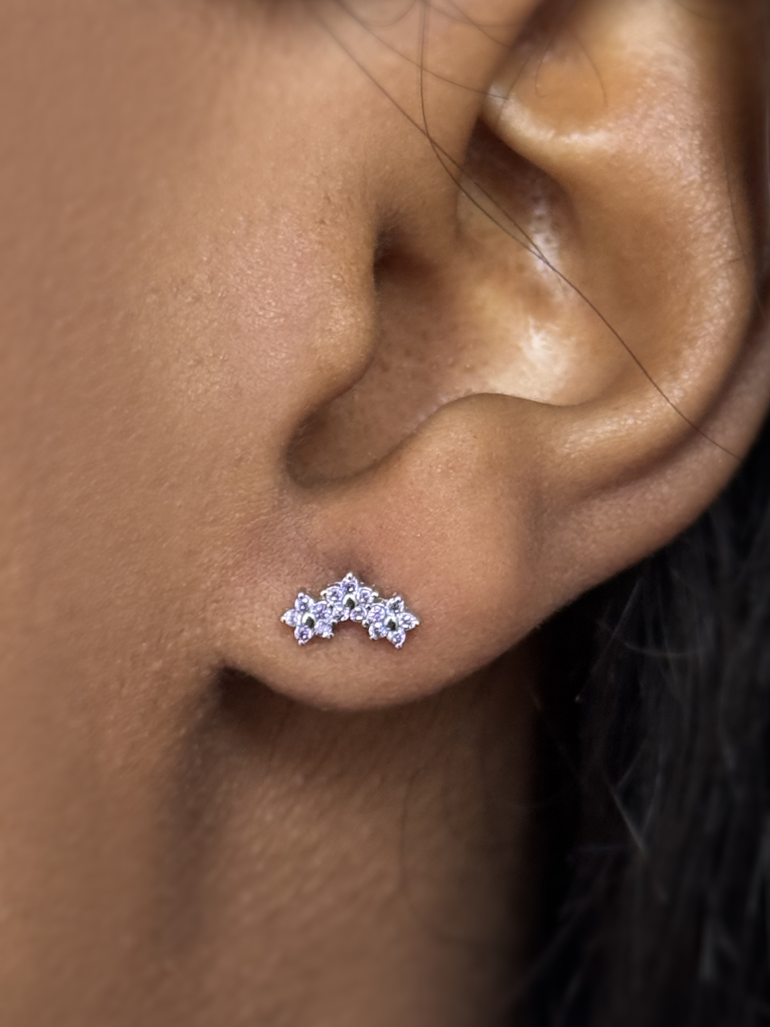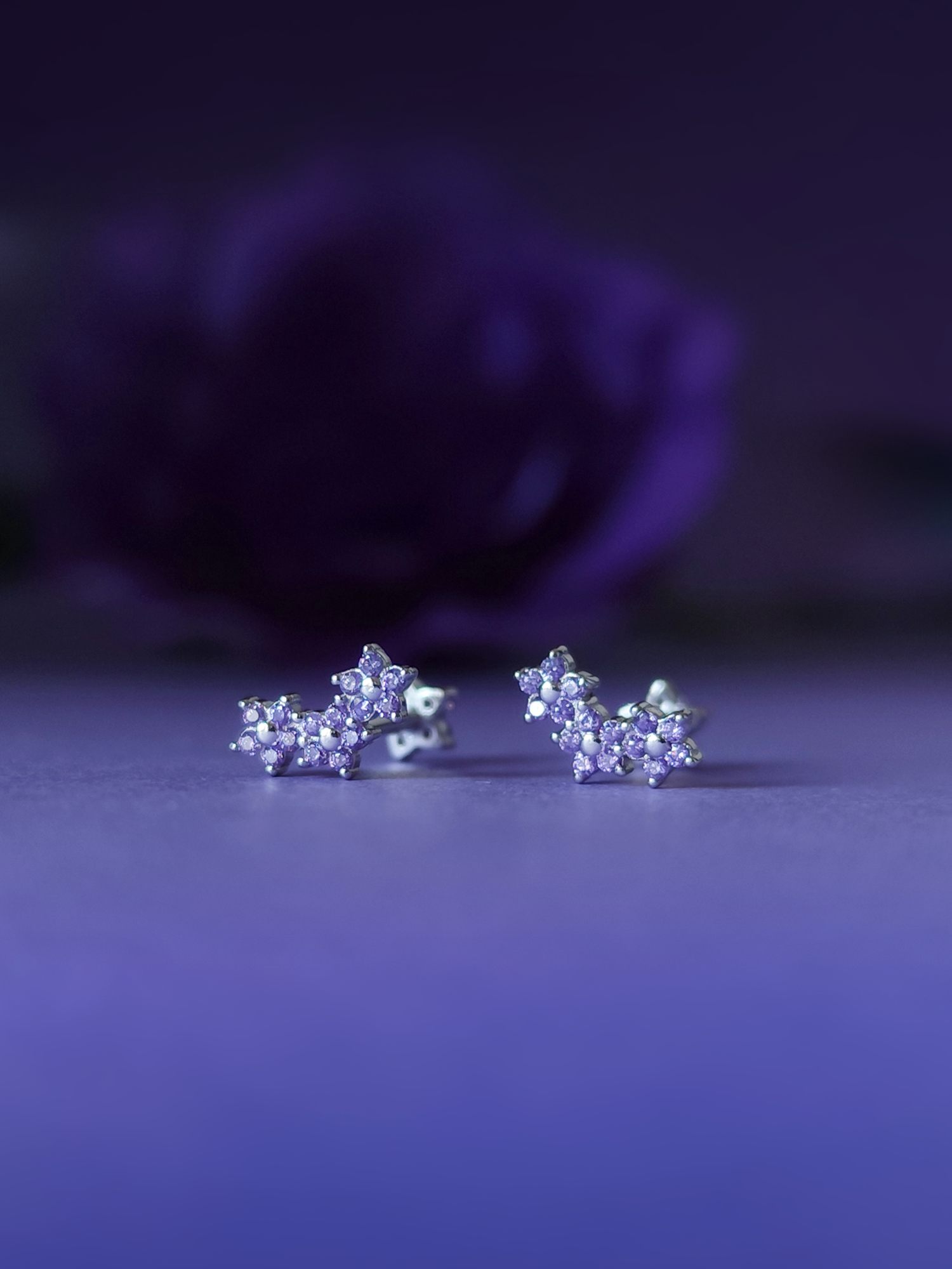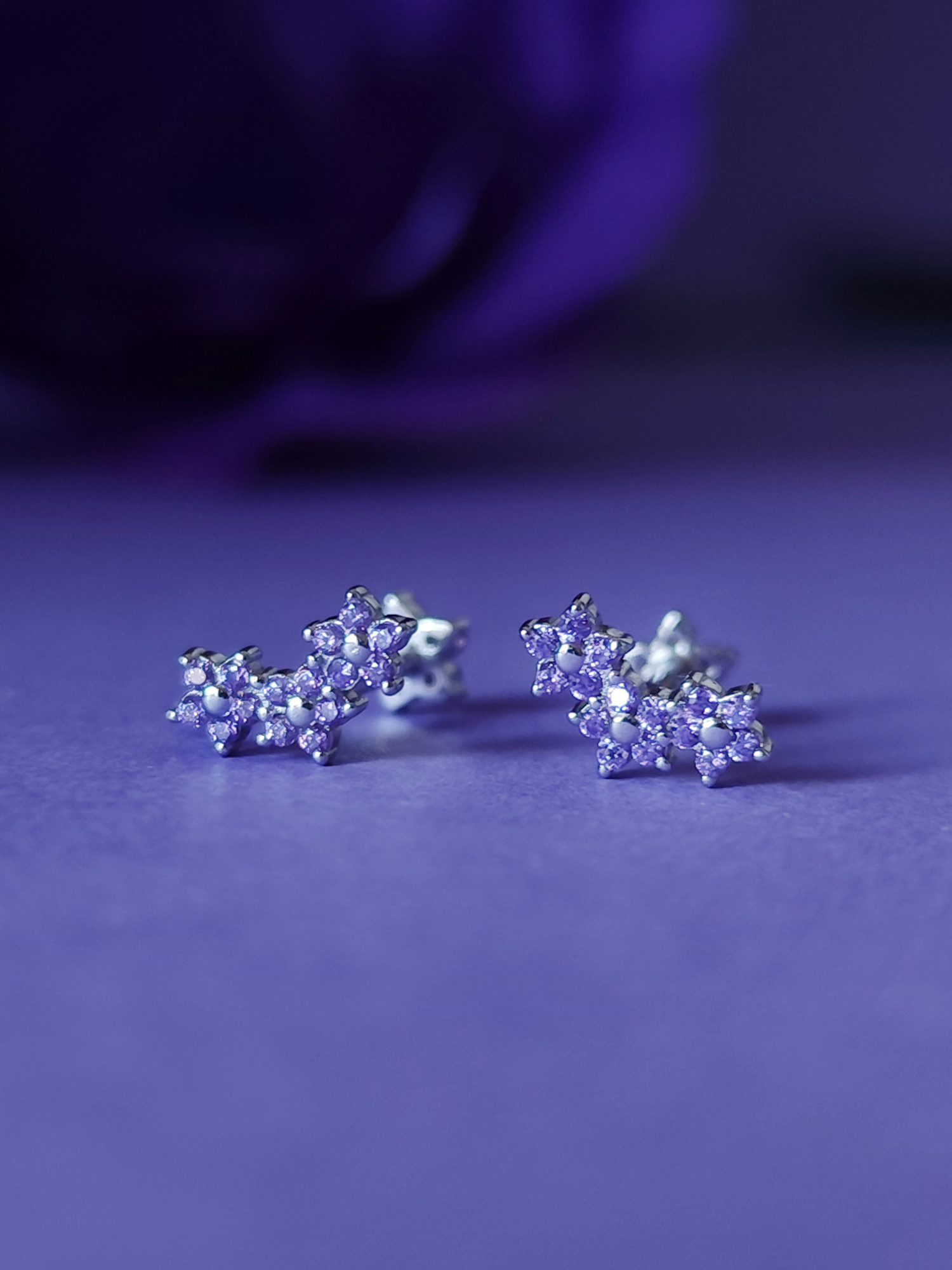 They are made entirely of sterling silver 925. The earrings comes with the shape of the Forget Me Not flower with bright purple shades crystals.