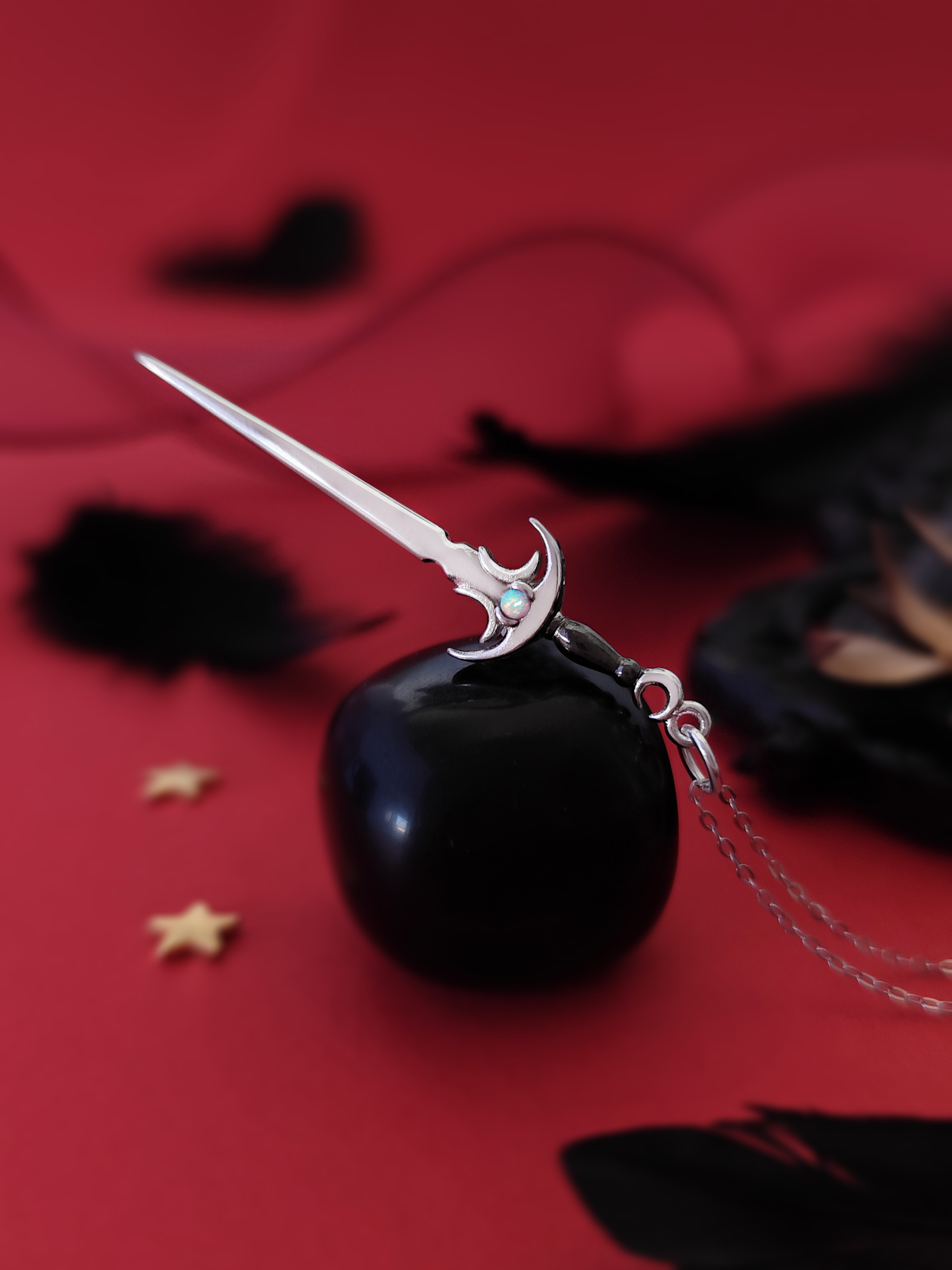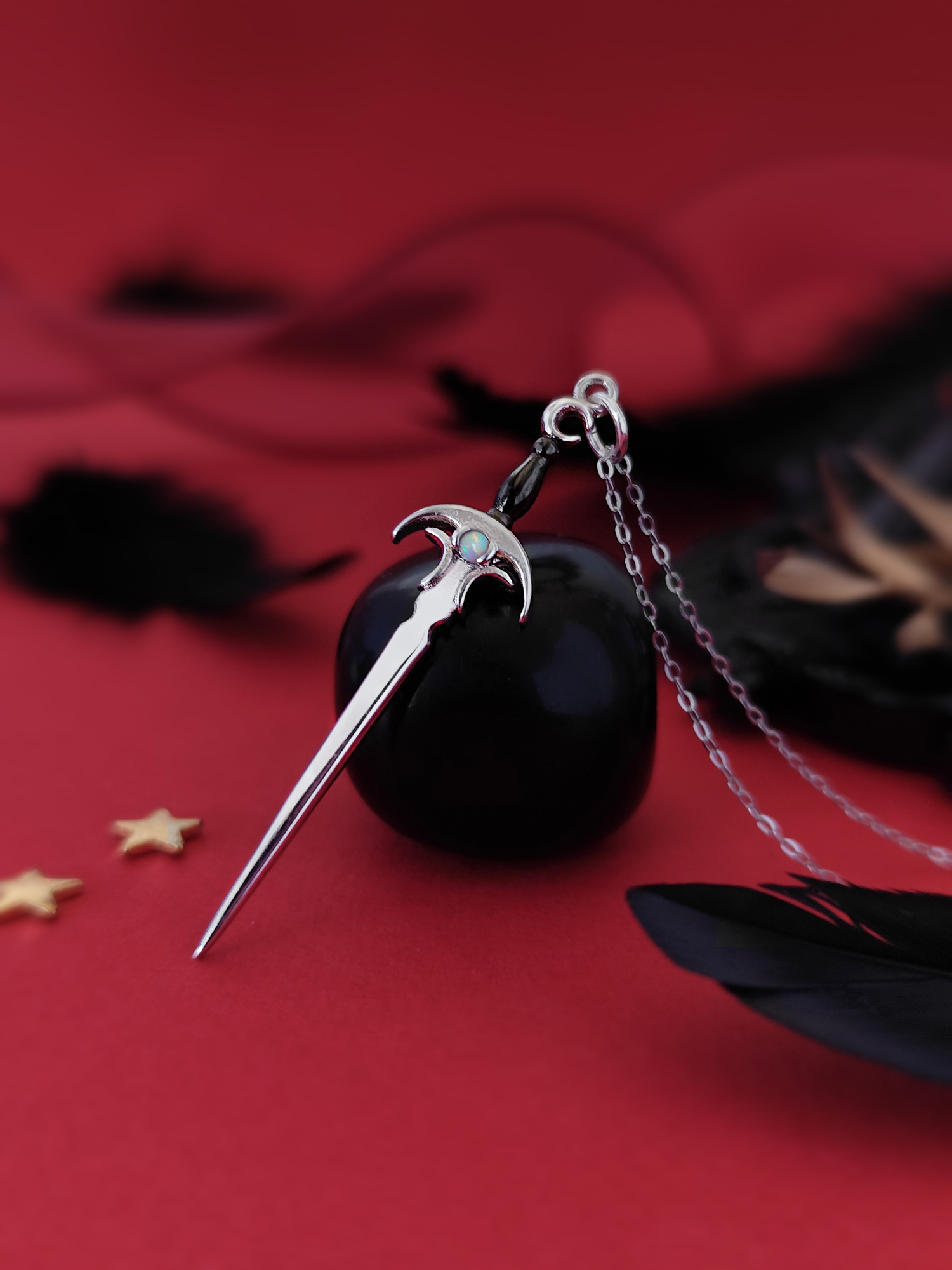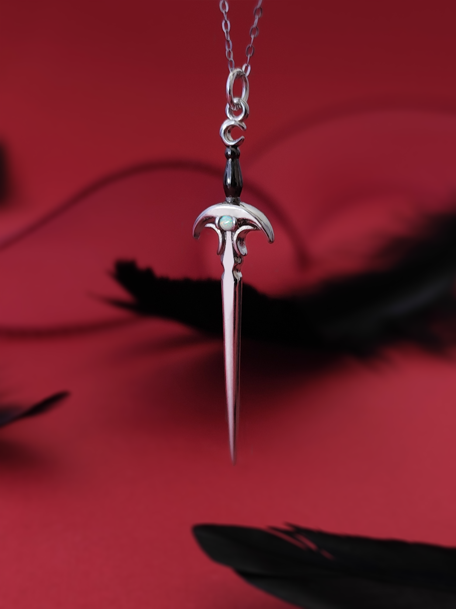 Made of solid 925 Sterling Silver with black gun platted details the pendant comes in the shape of Bryce's sword with a shiny and bright opal stone embedded in the middle of the handle. The Starsword, also known as Gwydion, was carried by Ruhn Danaan and later by his sister Bryce Quinlan.
