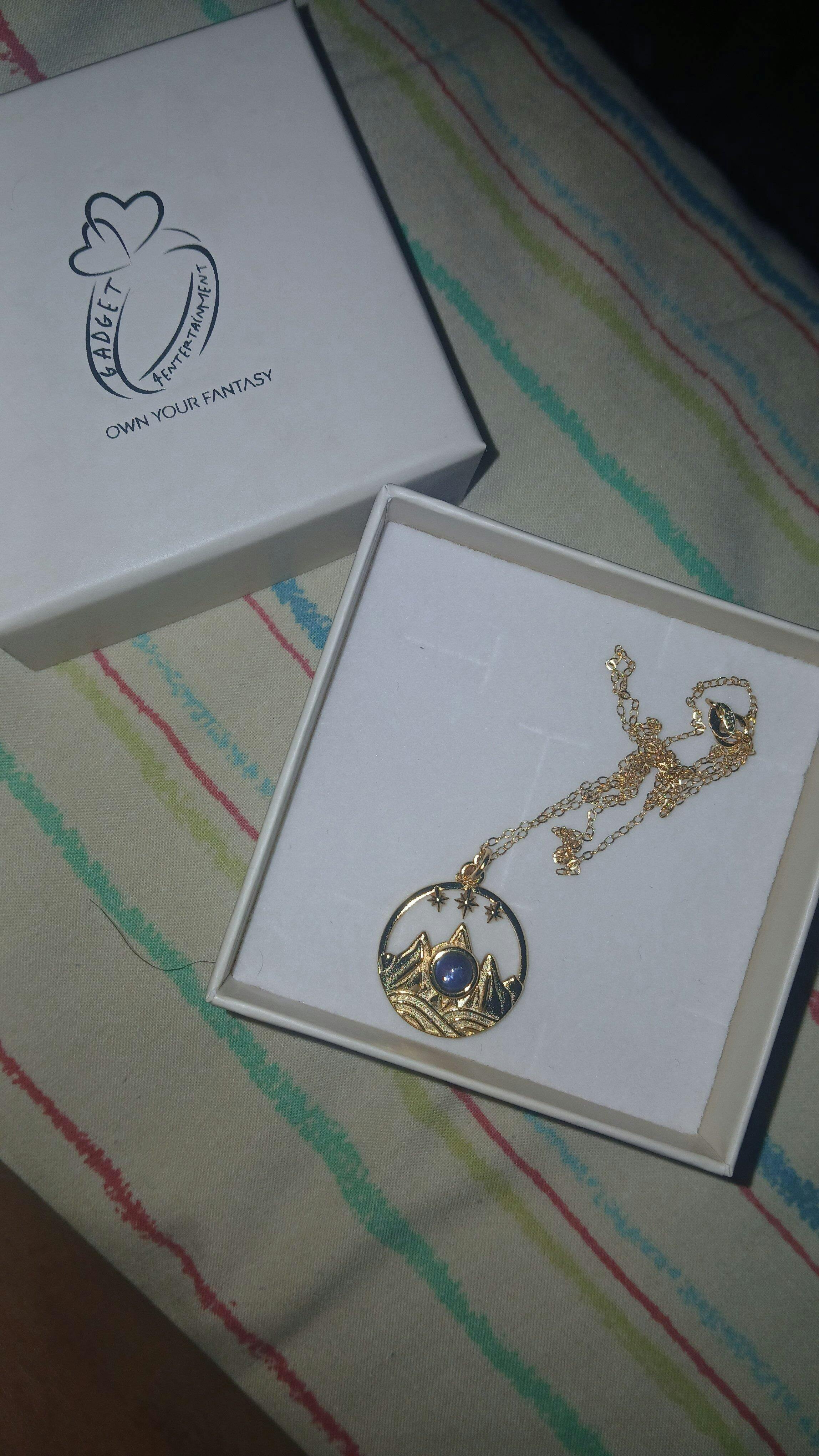 The necklace is made entirely of solid 925 silver, in the shape a mountain with three stars on the top. Inside the embedded lens you will see the fantastic world of Sarah J. Maas.