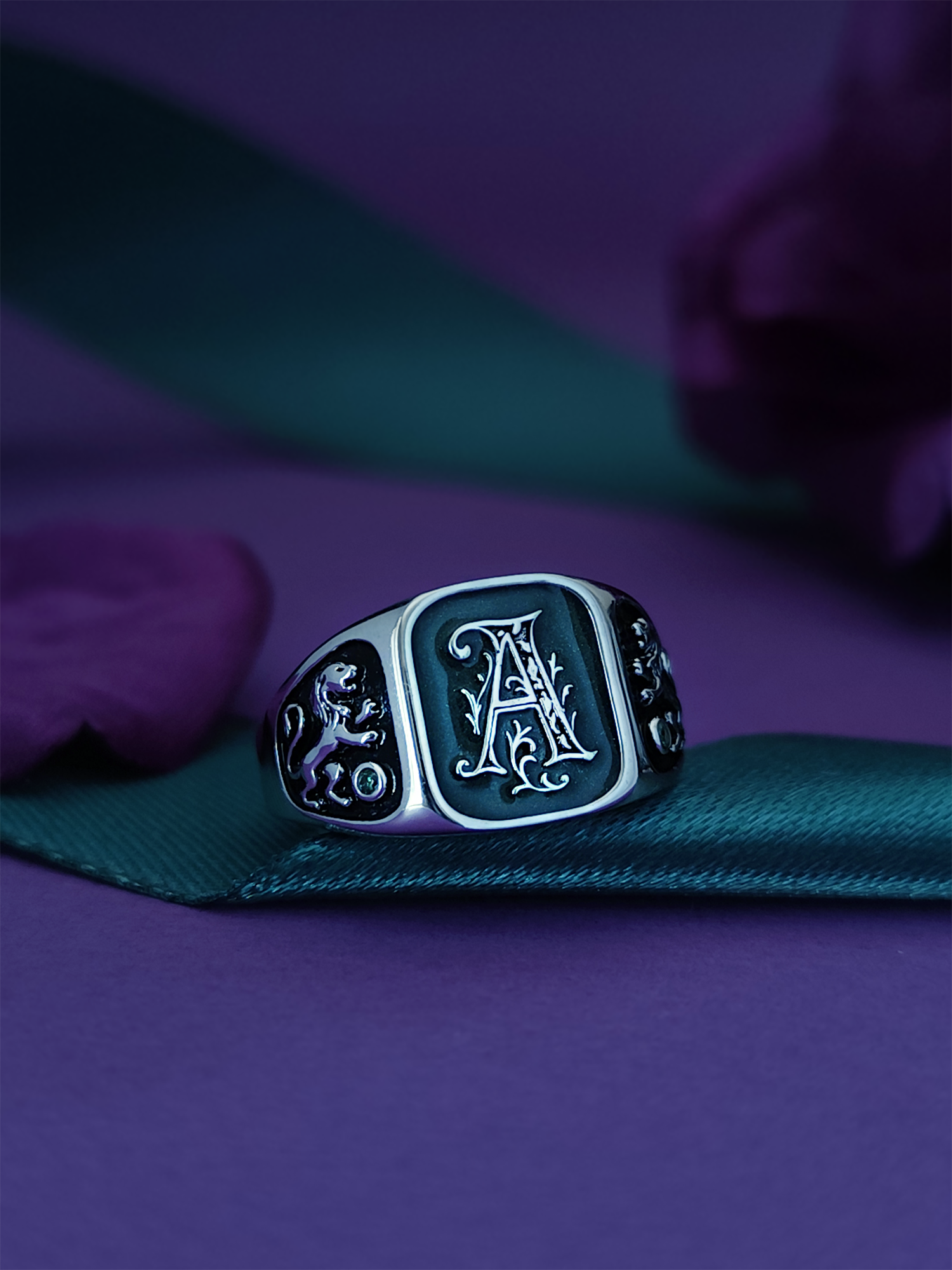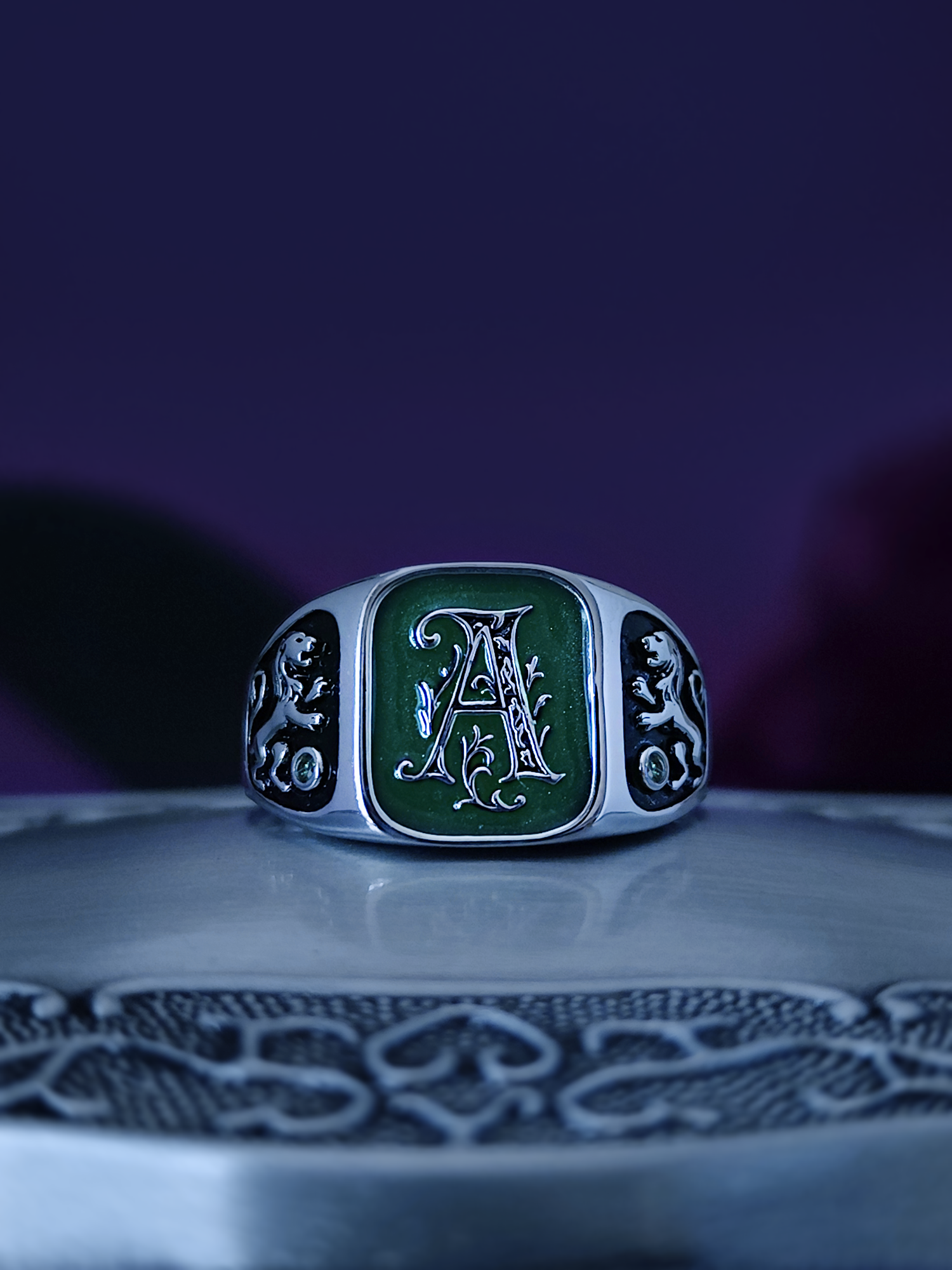 It is made entirely of pure sterling silver 925. The ring is the perfect replica of Kai's enforcer signet ring. In the middle the letter "A" (Azer) beside two rampant lions symbols of the Azer's Family with two bright emerald crystals and green enamel symbol of Ilya.