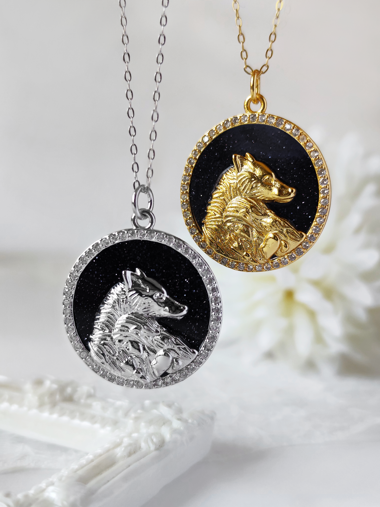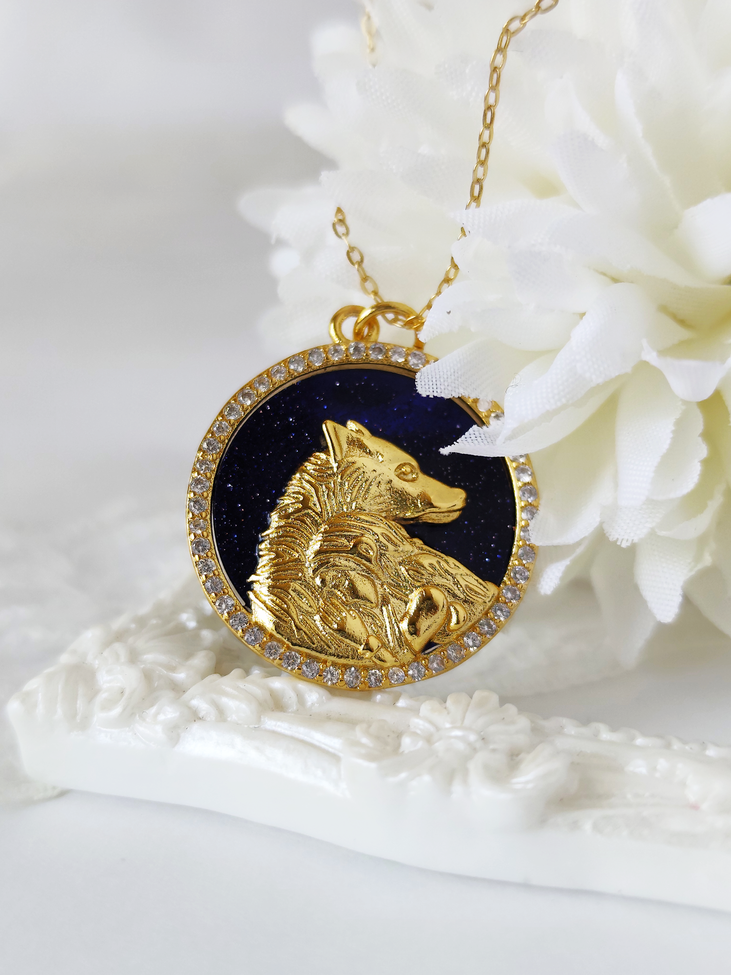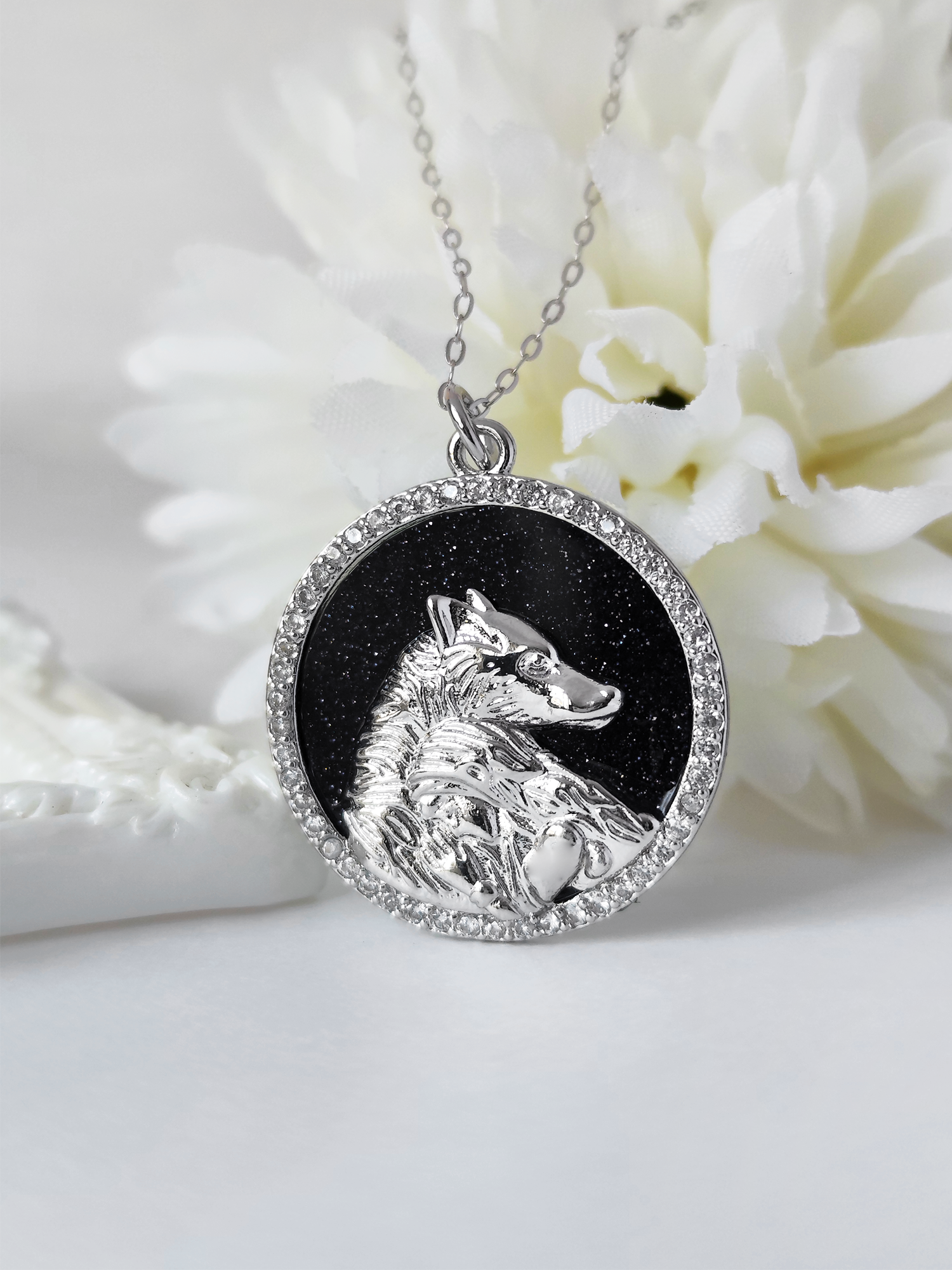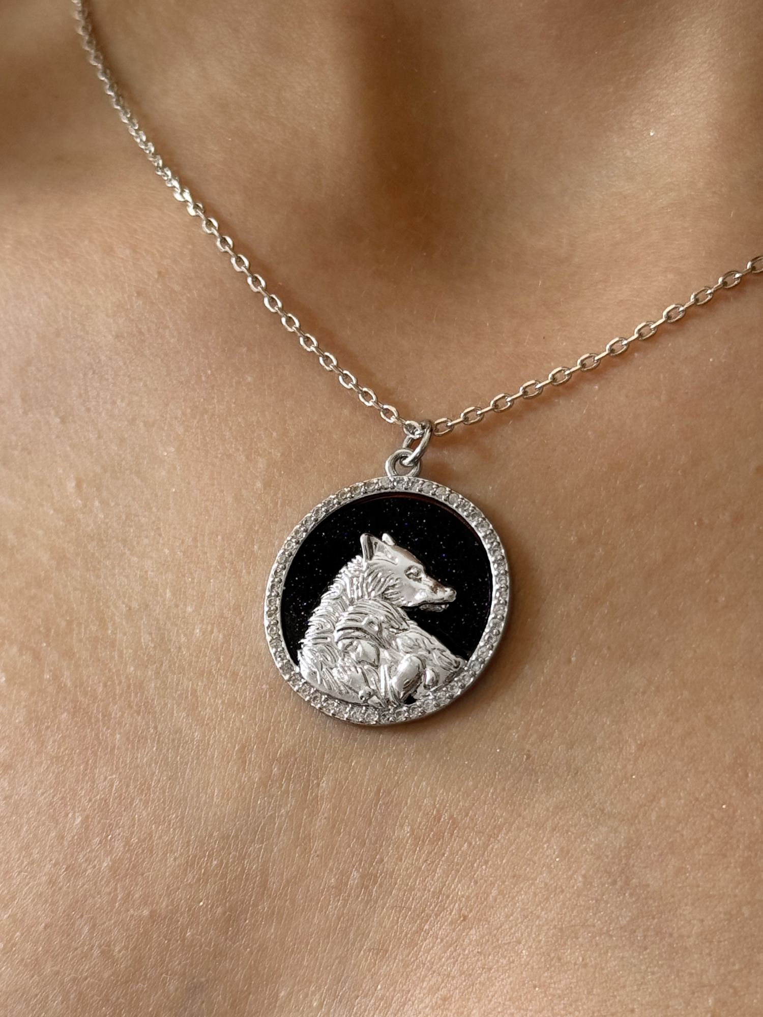 The necklace is made entirely of sterling silver 925 and it has the shape of a round coin with Misery sleeping on Lowe wolf silhouette like in the book. The backside a beautiful and shiny blue sandstone with clear swarovski around the coin.