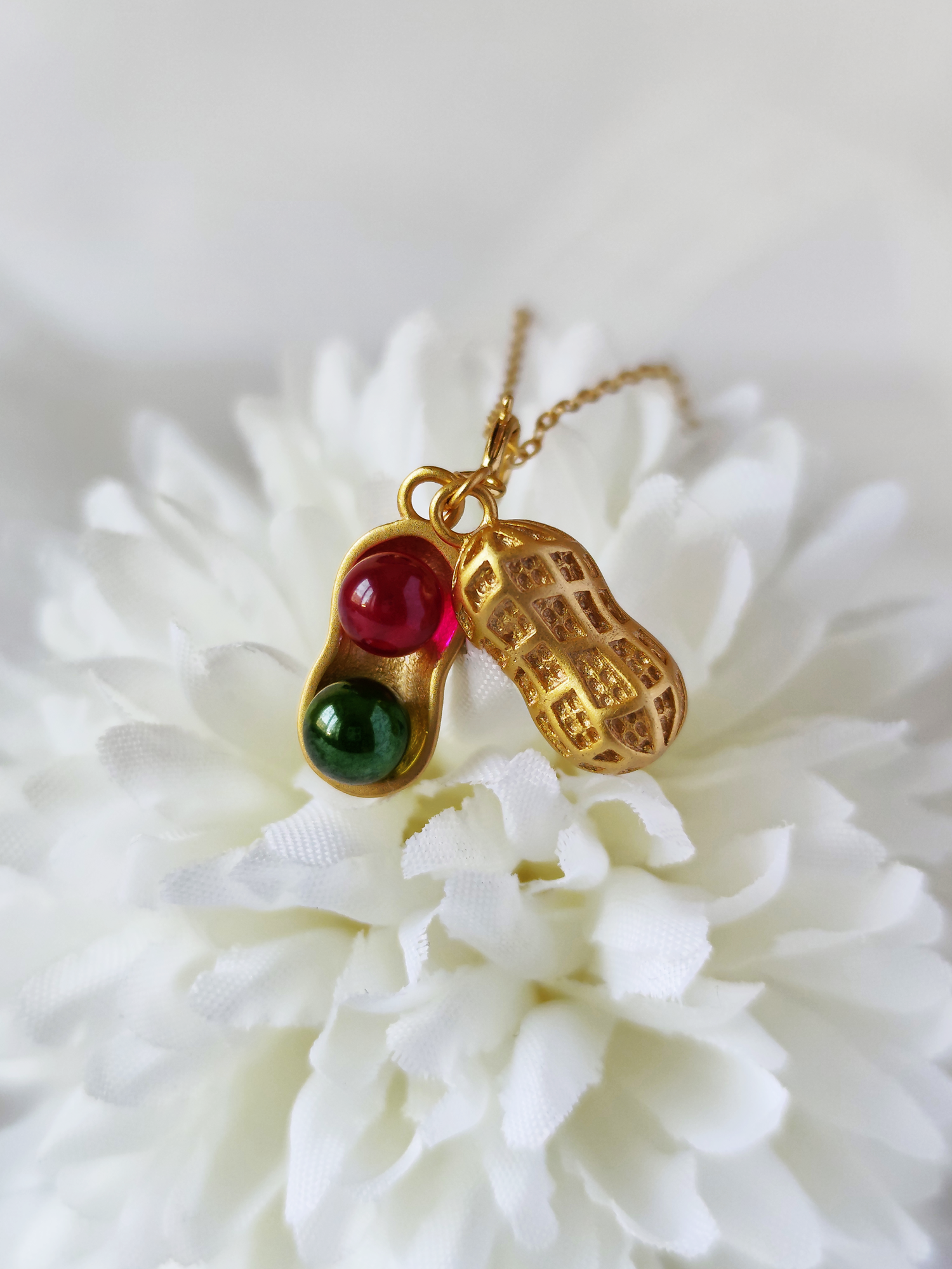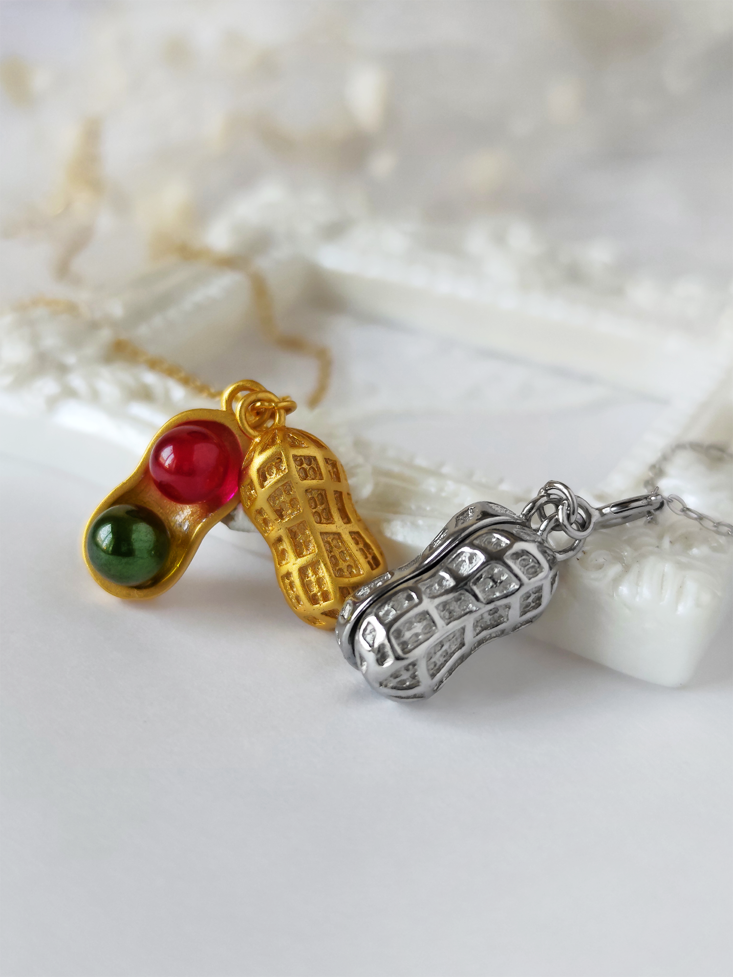 The necklace is made entirely of sterling silver 925 and it has the shape of a openable mini peanut with inside two round pearl. One red to symbolize Misery bloodline color, and the other one is green to symbolize Lowe bloodline color.