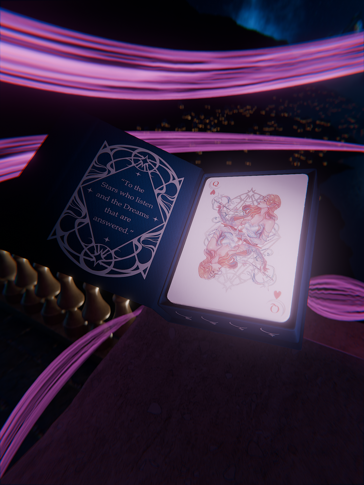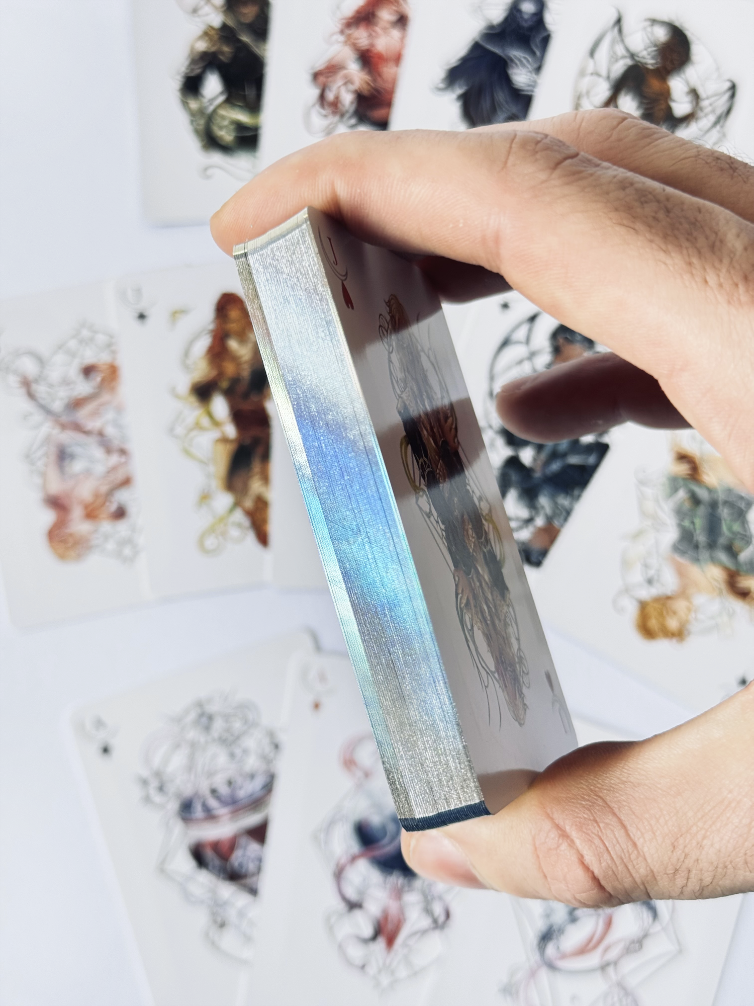 A set of 56 cards inside a beautiful and shiny magnetic hard box. Each card comes with an unique designs with different characters and artefacts from the book: like Feyre as Queen of Heart, Rhysand as King of Heart, the Suriel as Jolly, Nesta as Queen of Spade, The Cauldron as Ace of Diamond and many more.