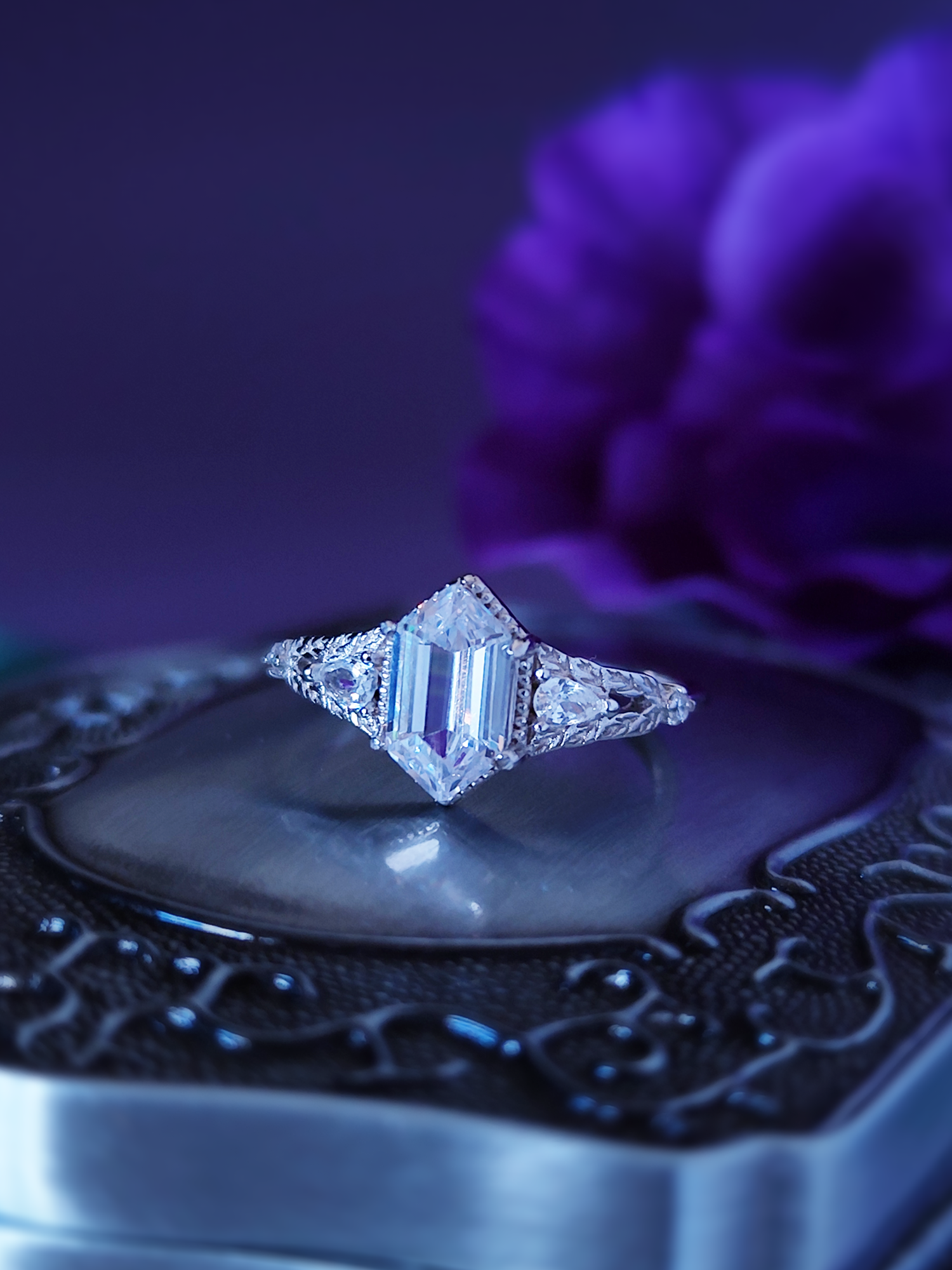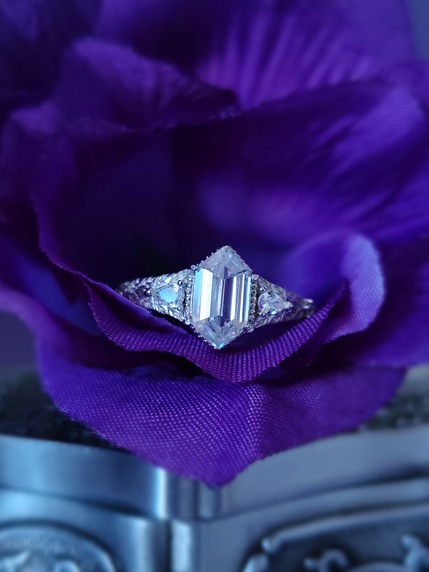 It is made entirely of pure sterling silver 925 with bright clear faceted crystal. The rings comes with the shape of a little Forget me Know flowers holding the rhombus crystal.