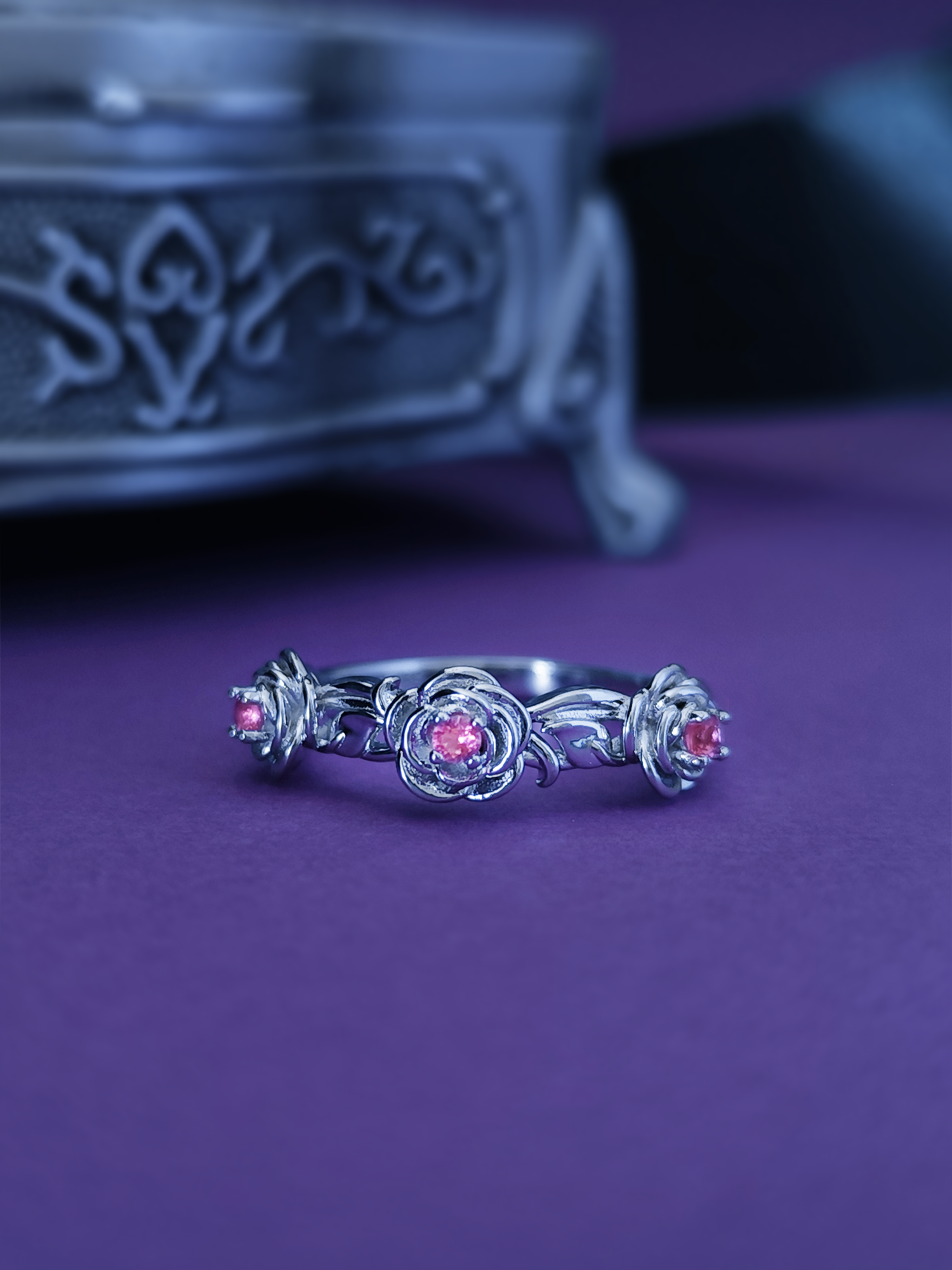 It is made entirely of pure sterling silver 925 with bright pink crystals. The ring comes in th shape of a intertwined leaves with littles Pink Roses flowers around the band, flowers mentioned in Fearless book.