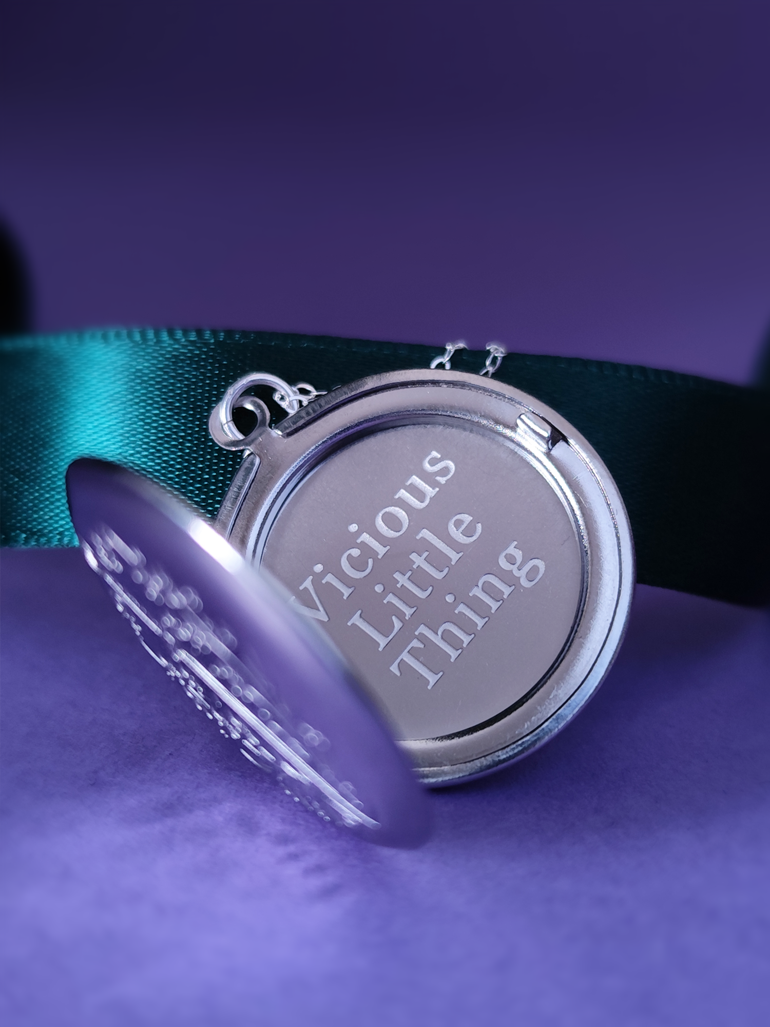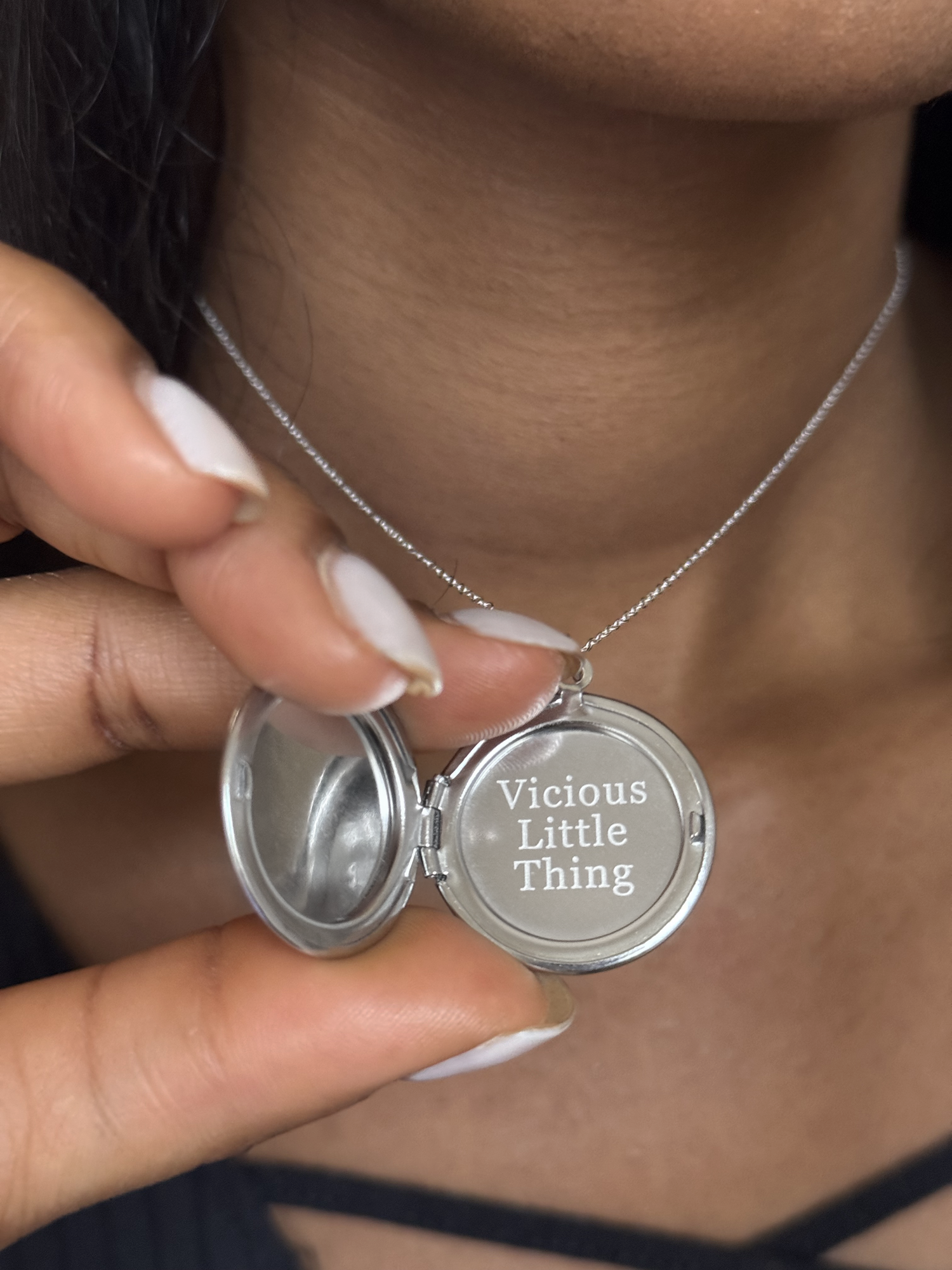 Inside the locket an embossed quote: "Vicious Little Thing".