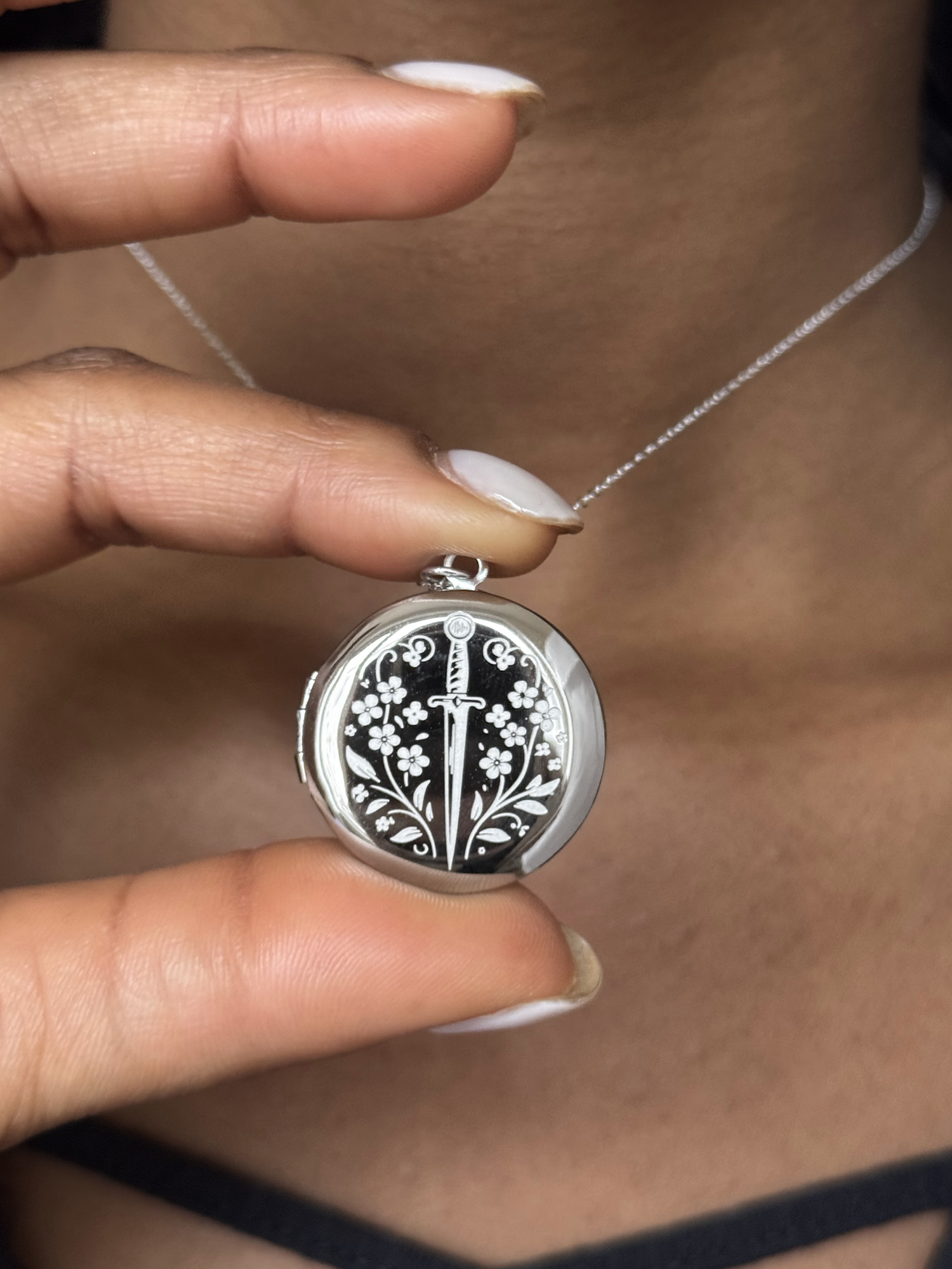 This beautiful locket necklace is a special and unique pieces of jewel for you your best friends and a perfect gift for any occasion. Made of solid stainless steel with 925 sterling silver chain the locket is inspired in Powerless book and comes in the shape of a round openable pendant with embossed the Paedyn's dagger around small forget me knot flowers.
