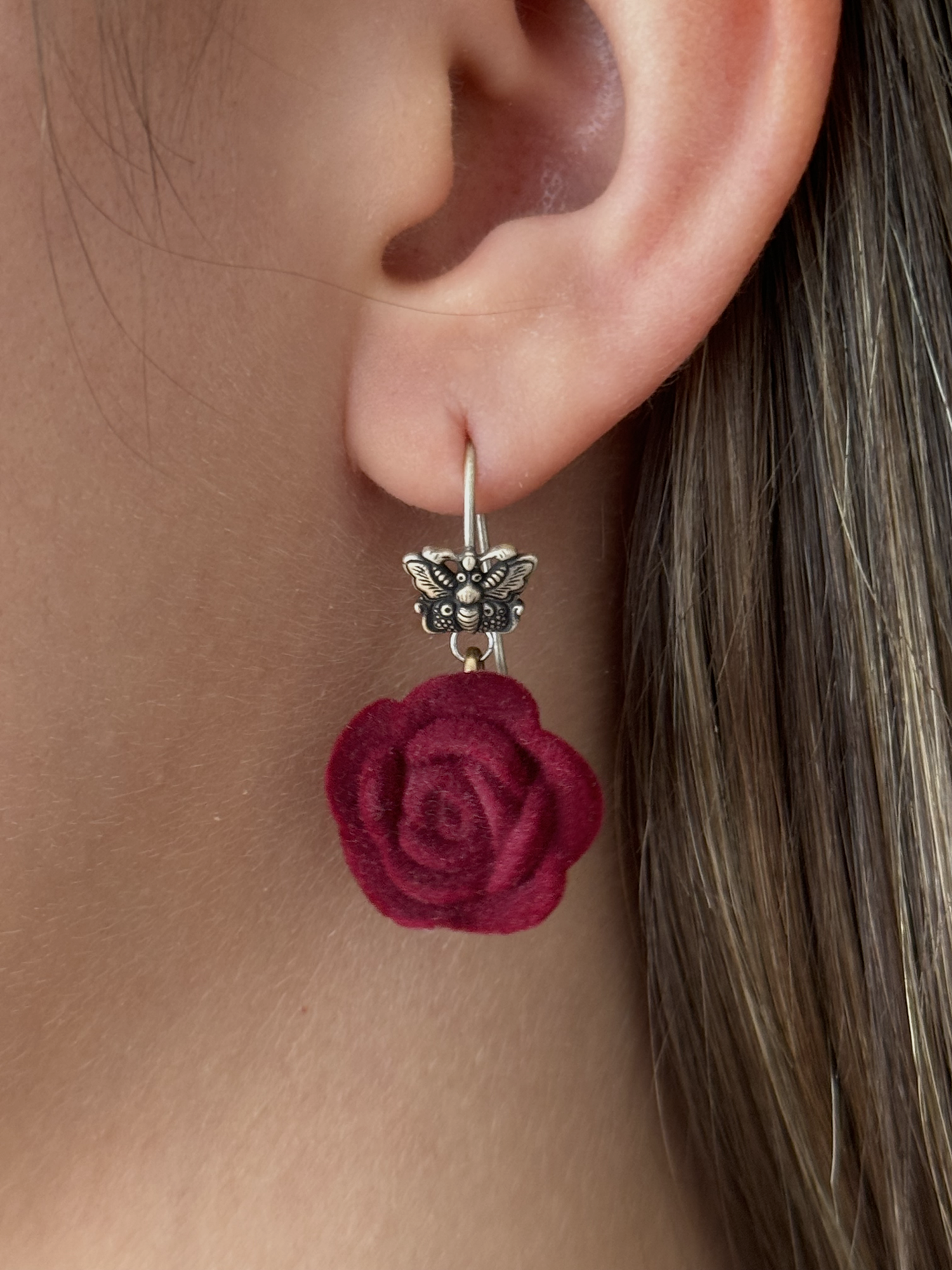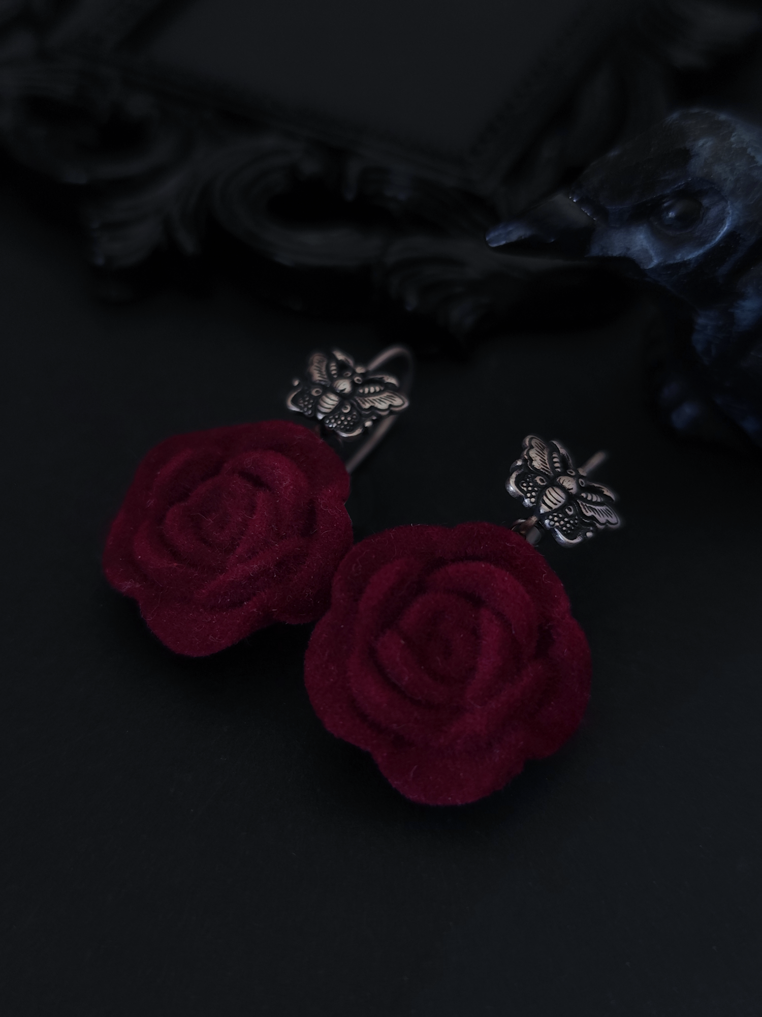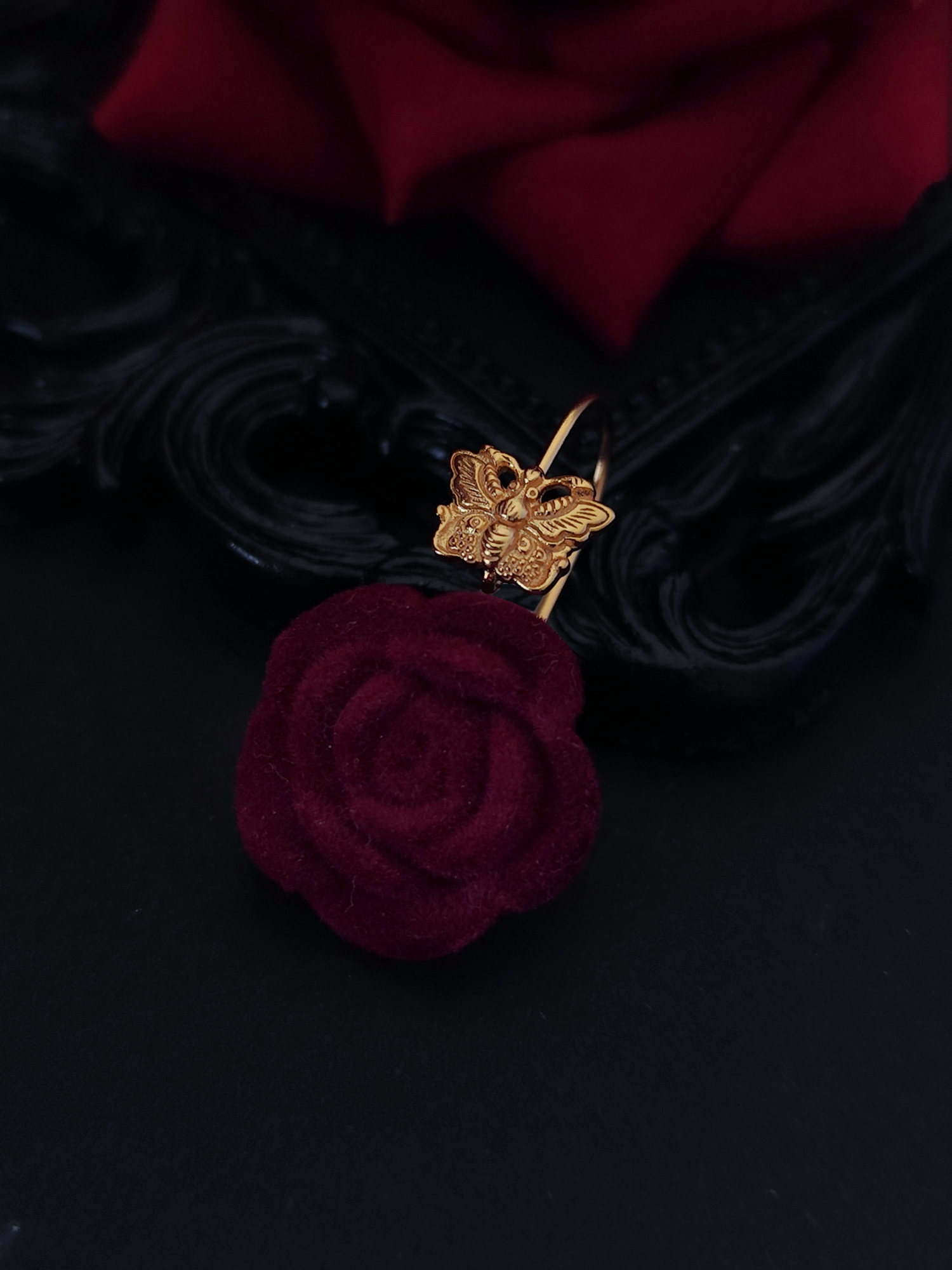 The hook earrings comes in the shape of a moth holding the Gideon silk red rose like the one he gives to Rune.