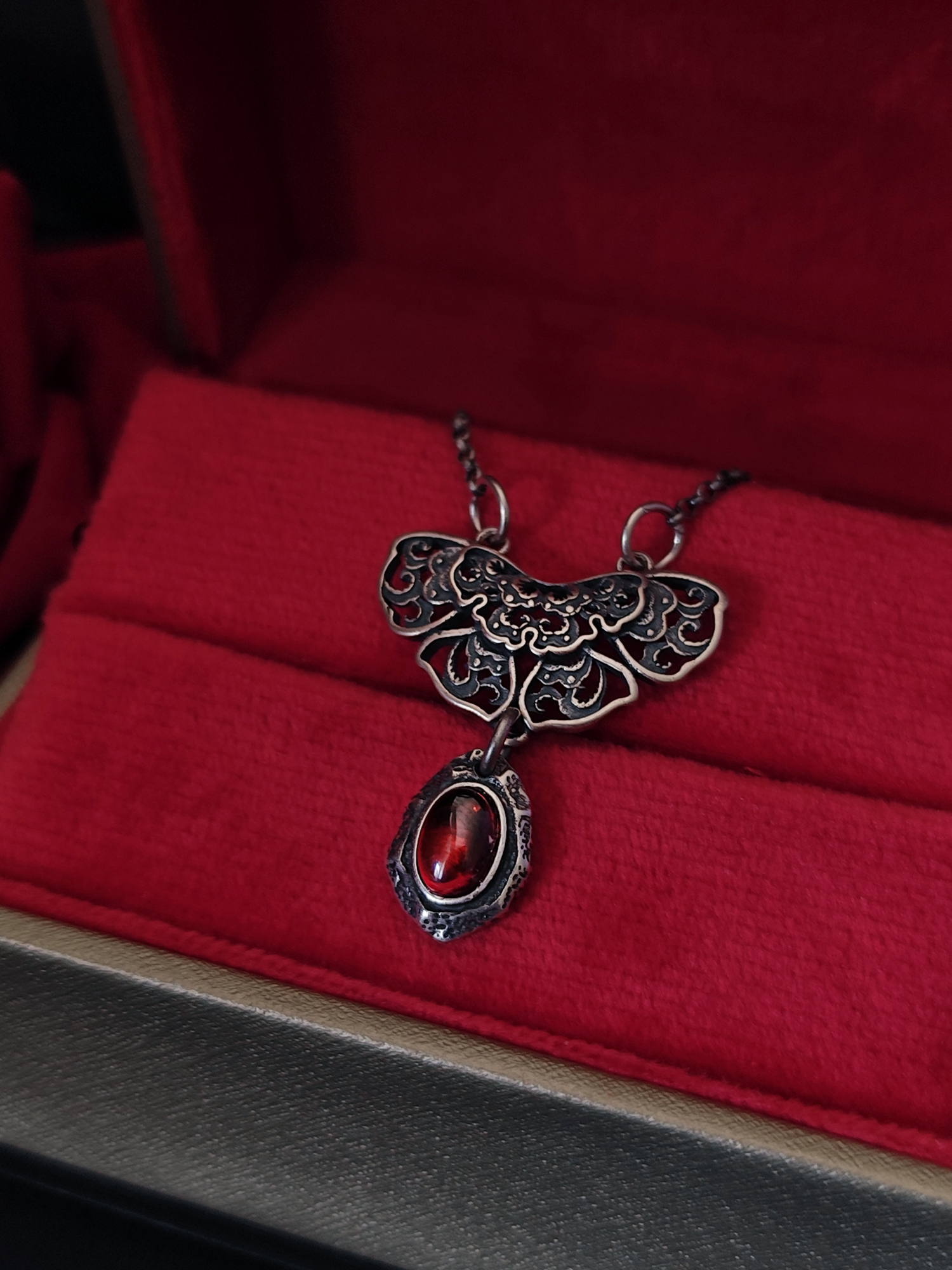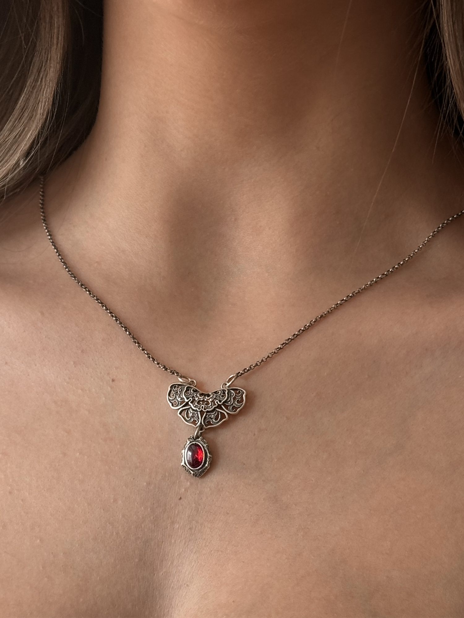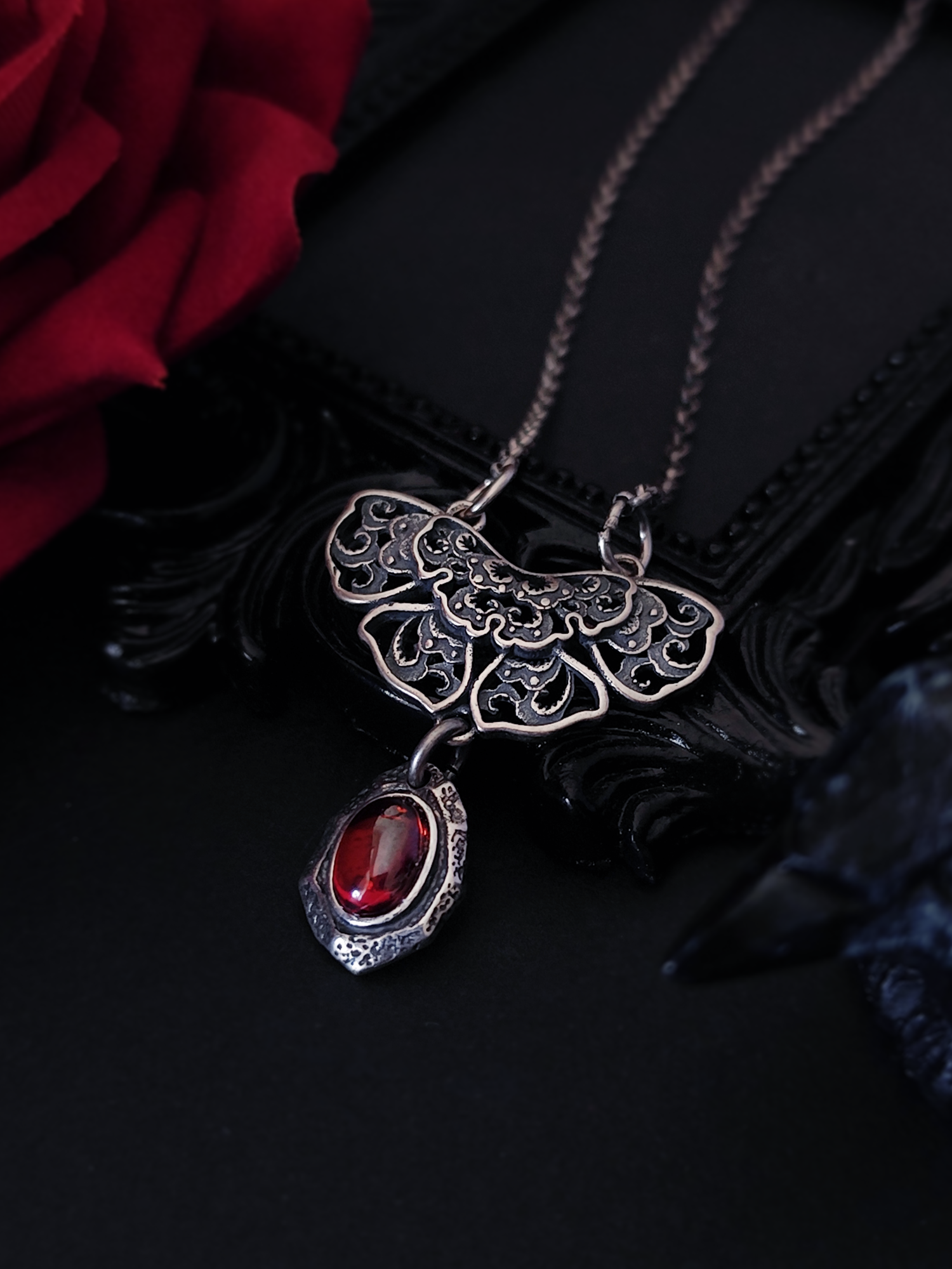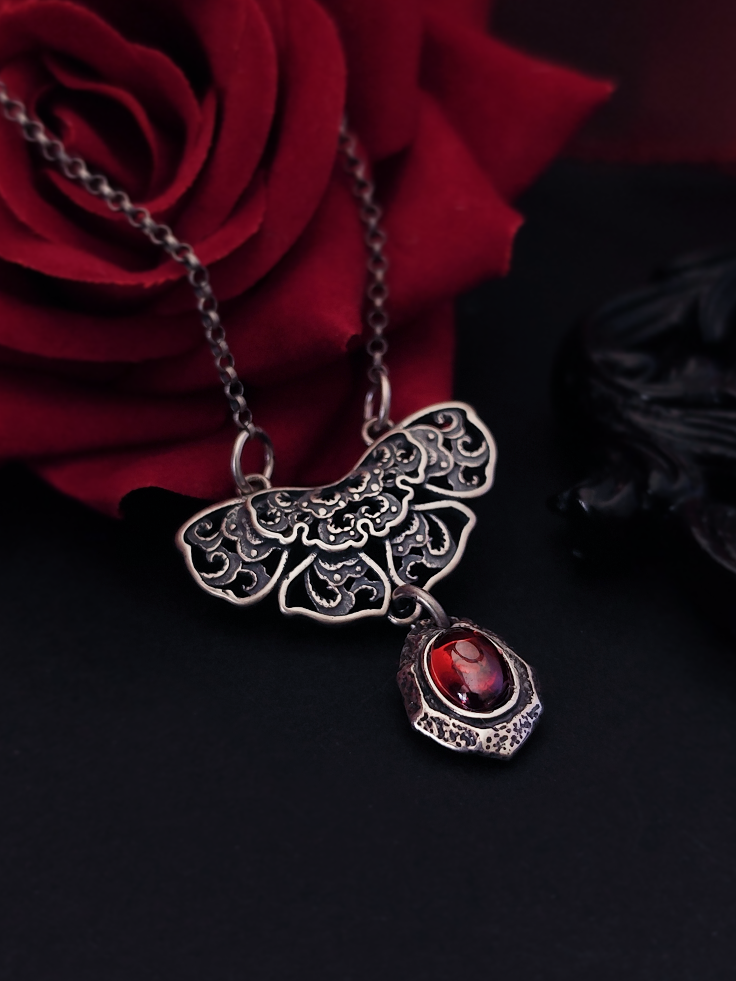 It is made entirely of sterling silver 925. The pendant has the shape of a flying filigree moth holding a red ruby oval crystal.  In the book the red moth was Rune's magic witch mark. A blood red magical mark that a witch leaves as signature.