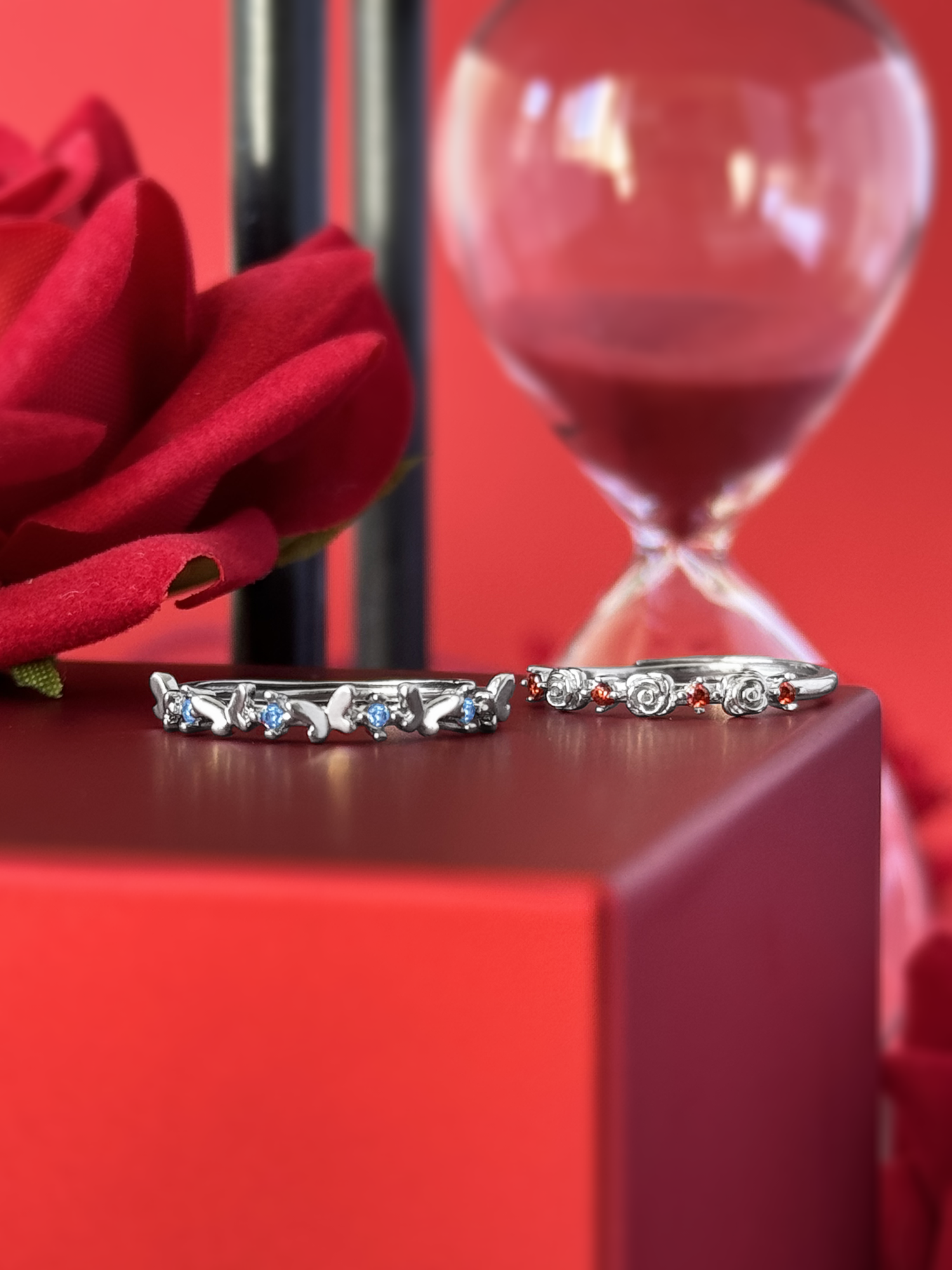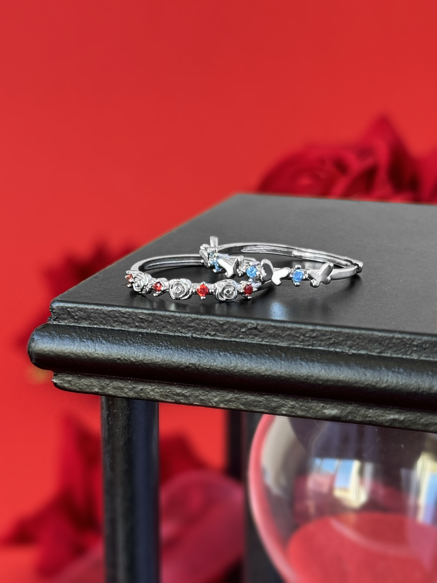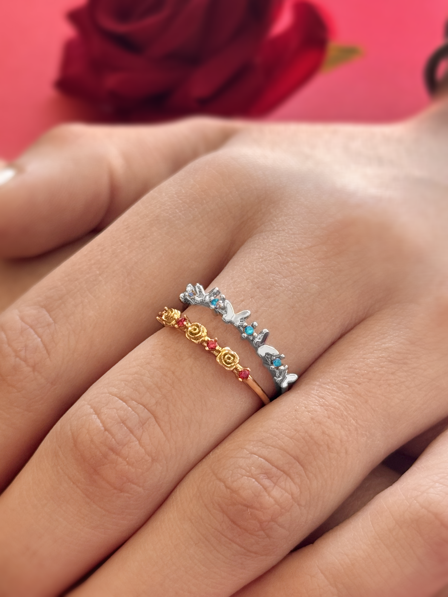 The Scarlett's ring comes in the shape of little roses with a small bright faceted red ruby zircons around the band. The Donatella's ring comes in the shape of little butterflies with a small faceted aquamarina zircons around the band.