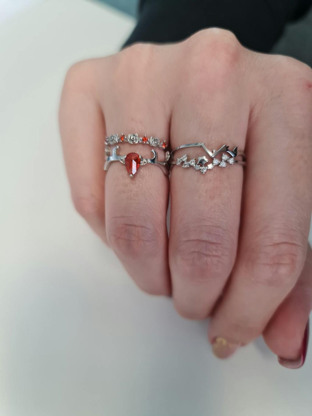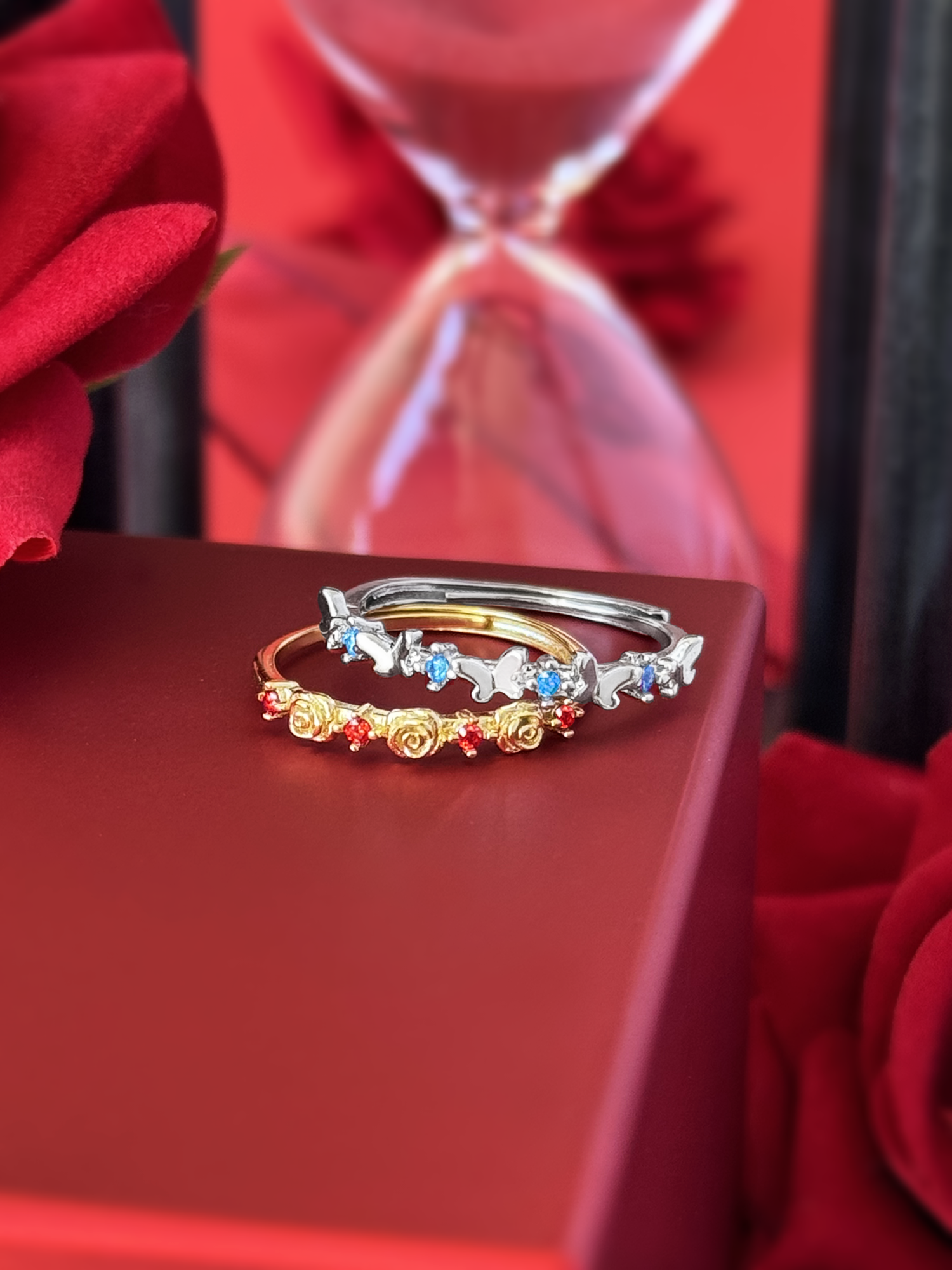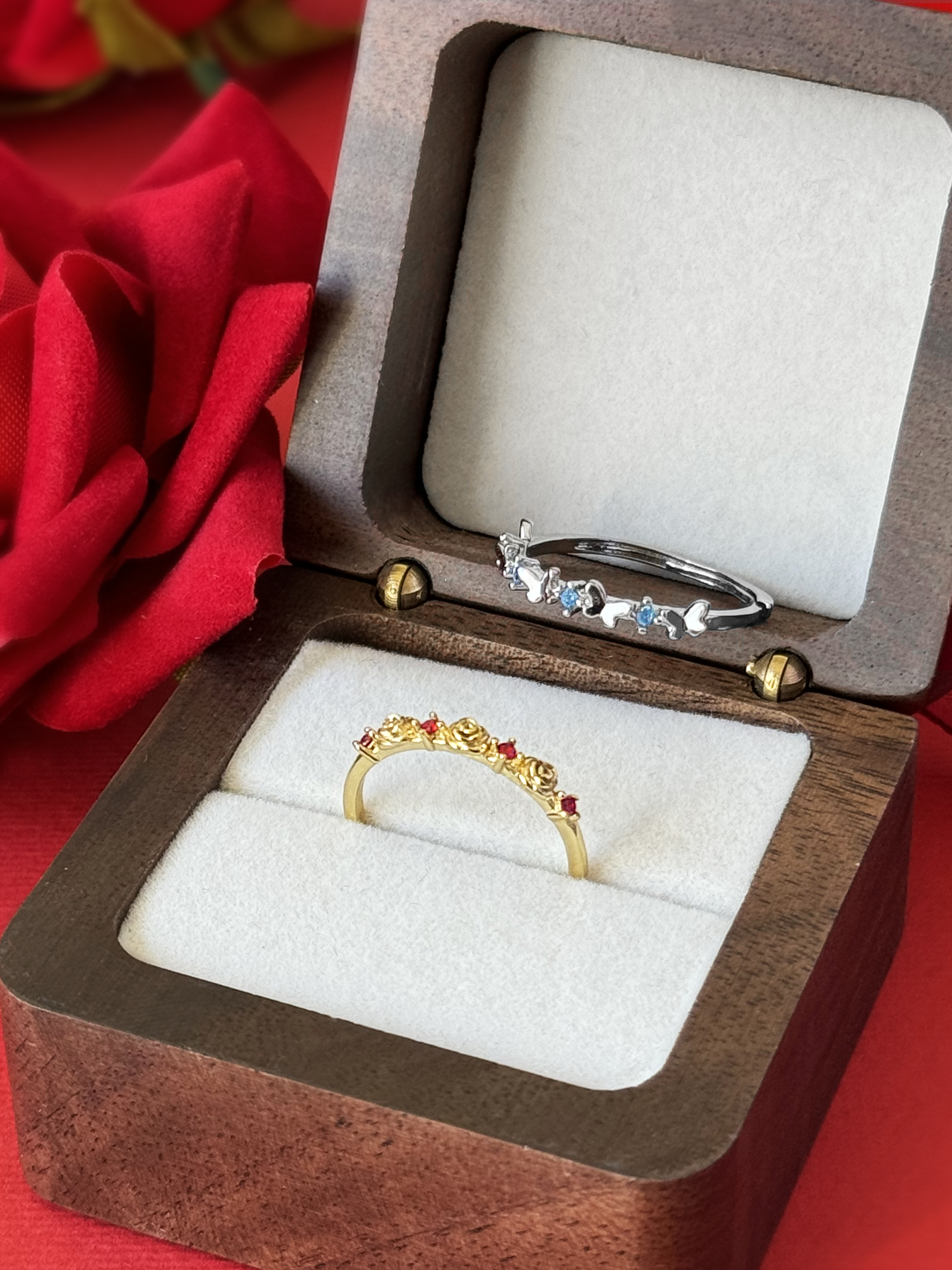 The Scarlett's ring comes in the shape of little roses with a small bright faceted red ruby zircons around the band. The Donatella's ring comes in the shape of little butterflies with a small faceted aquamarina zircons around the band.