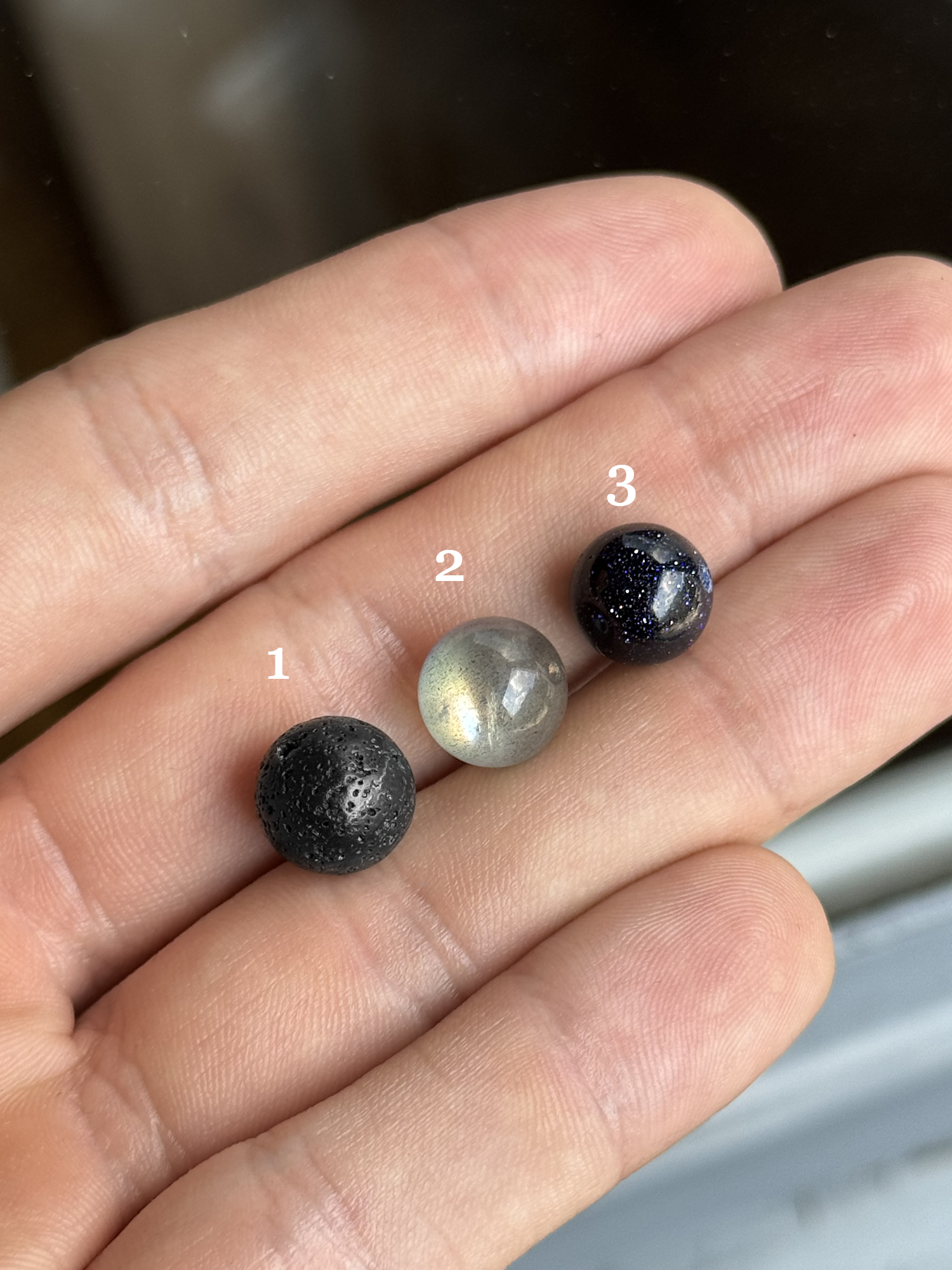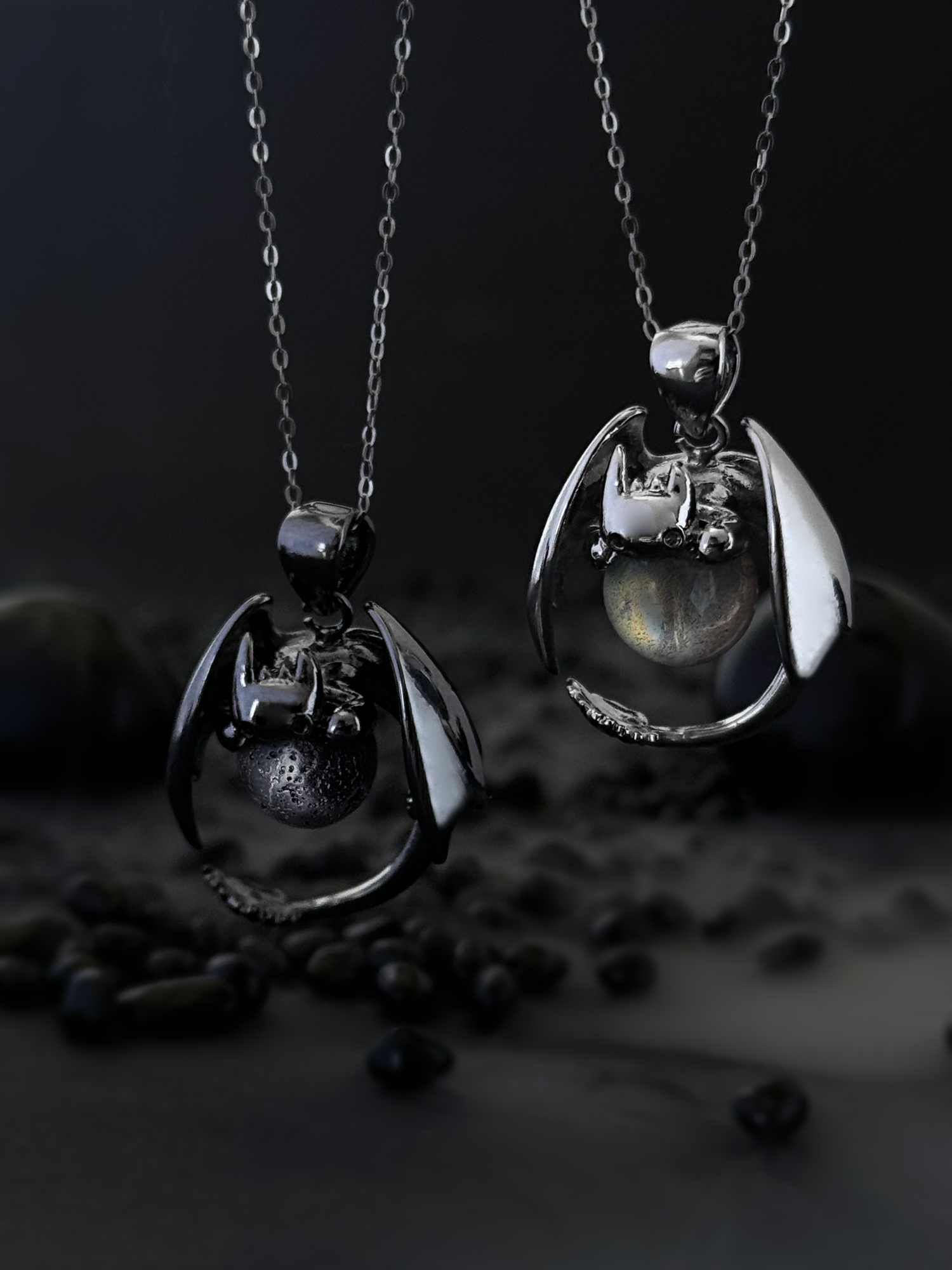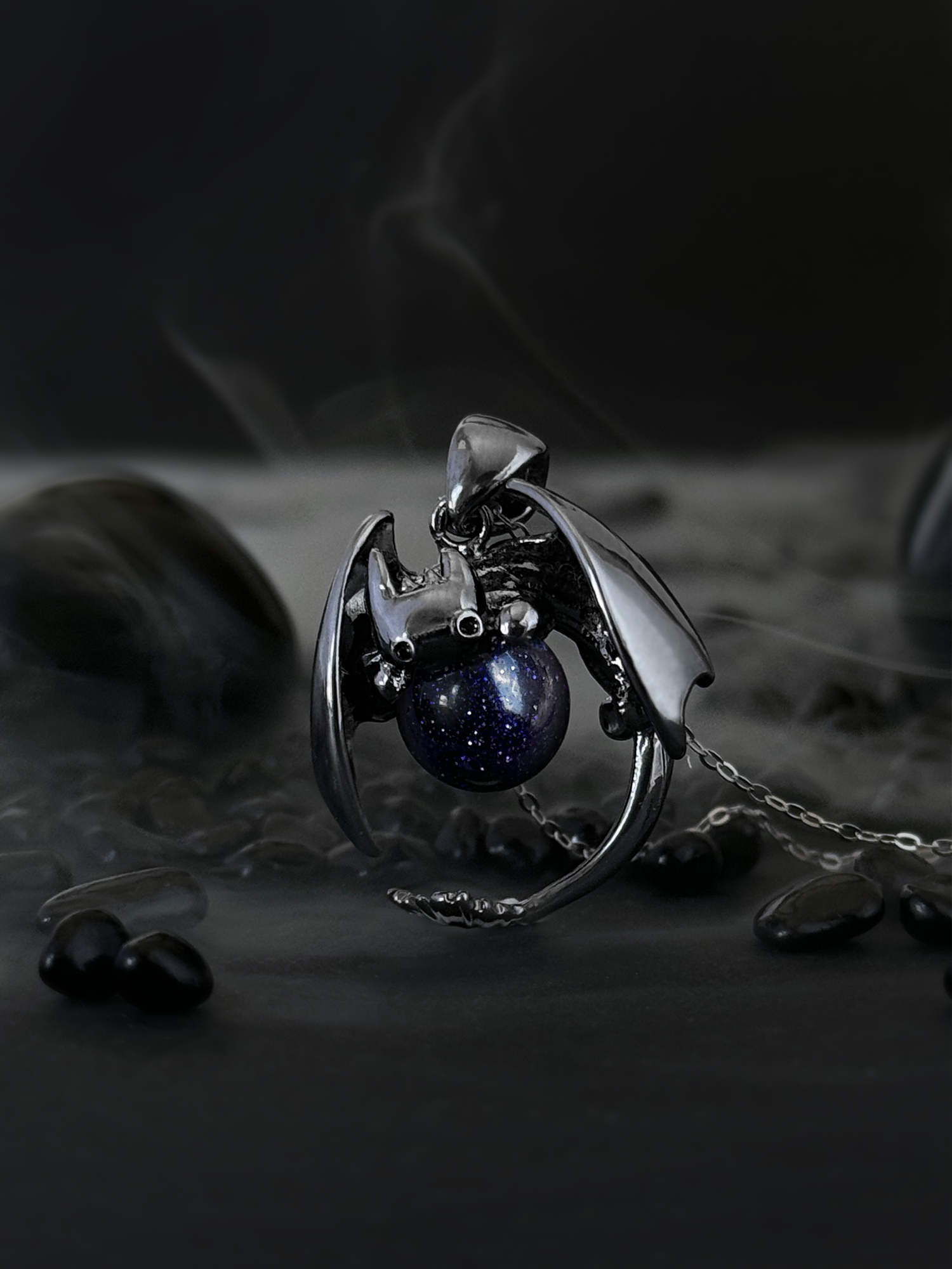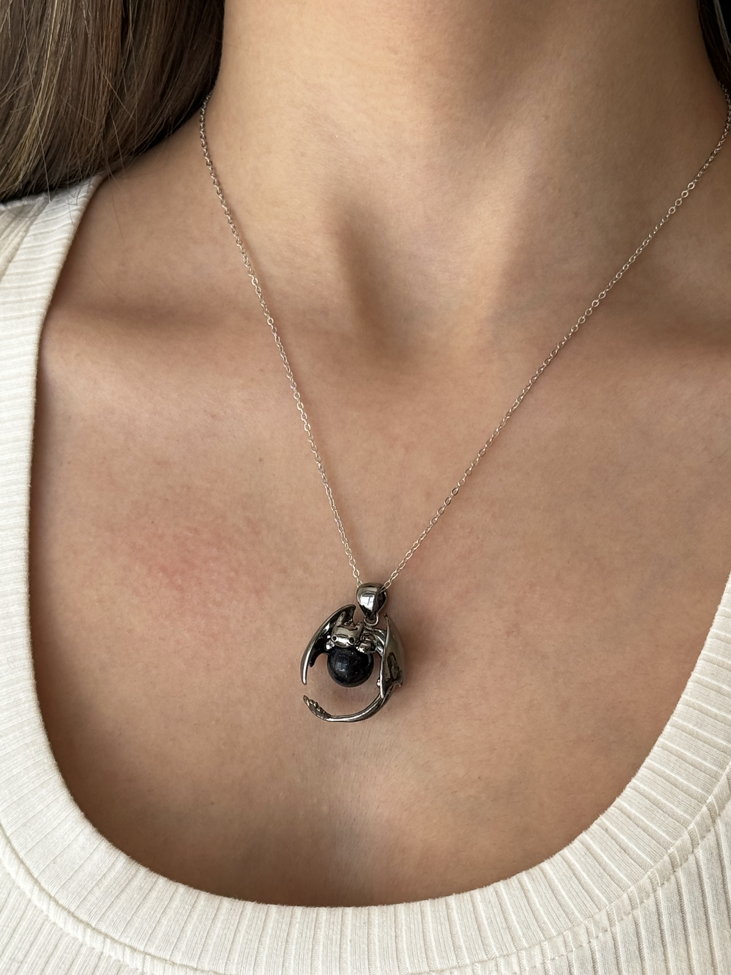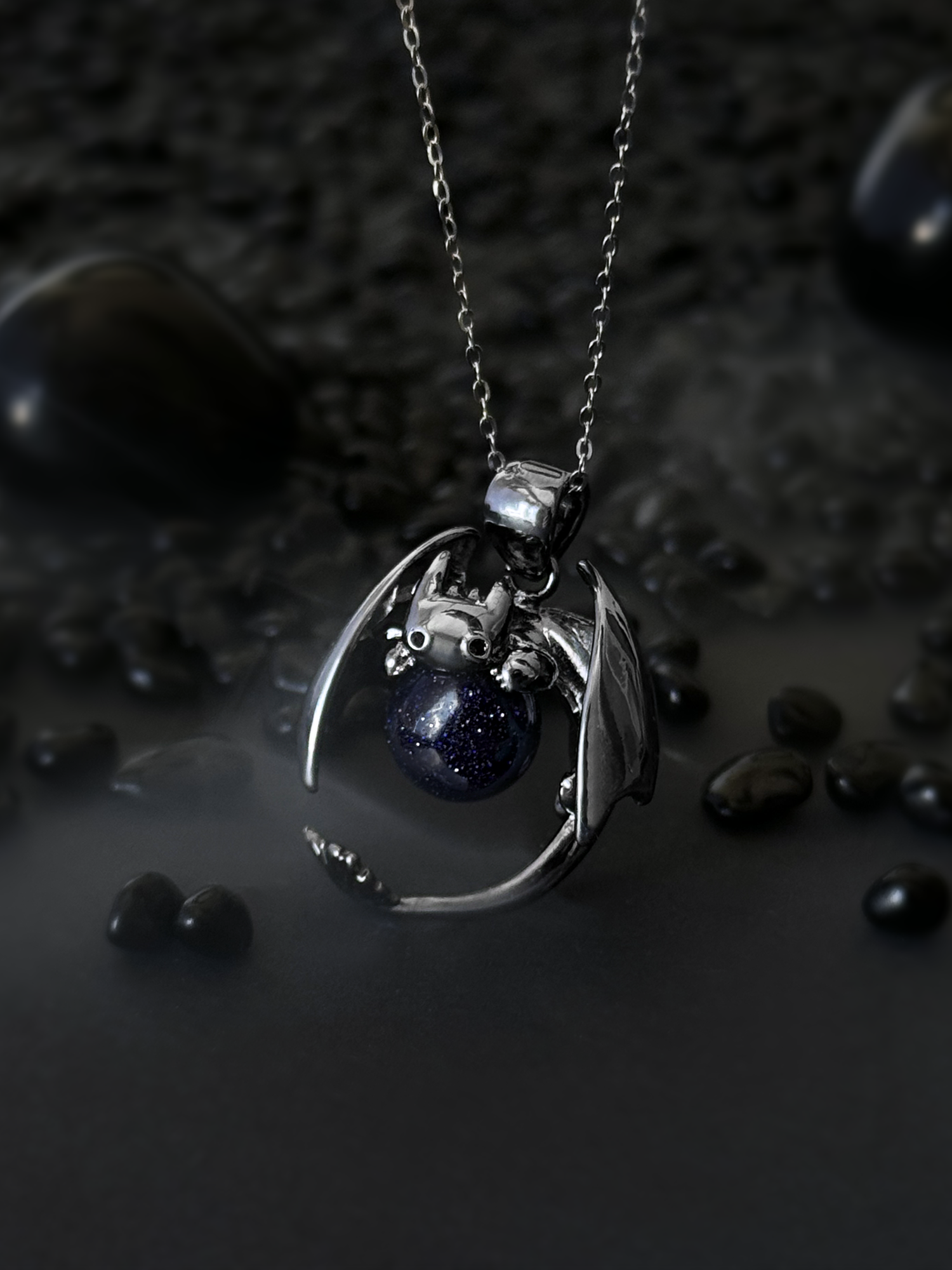 The necklace comes in the shape of a little dragon sleeping above a natural round bead: blue sandstone, moonstone or natural lava stone.