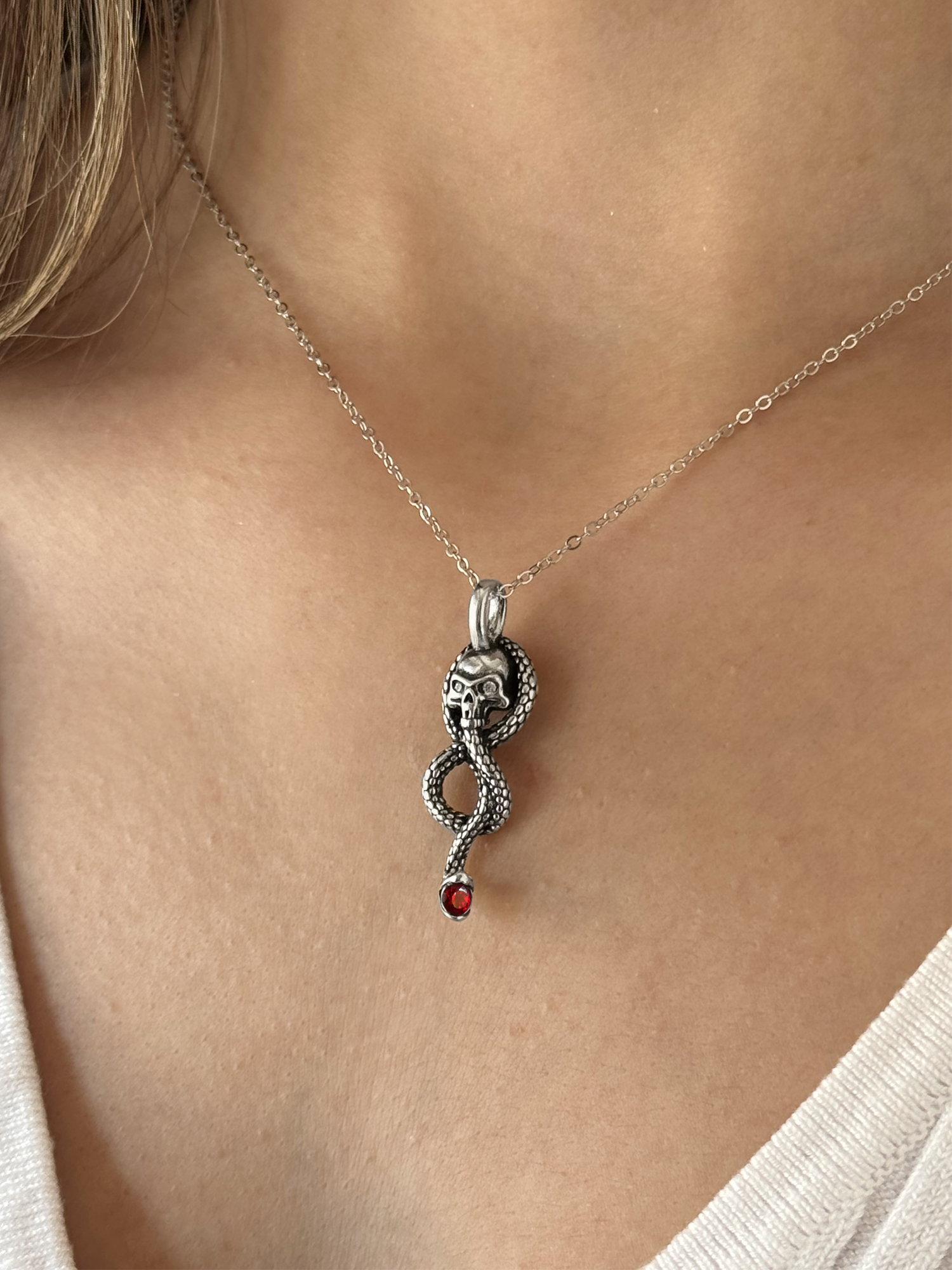 The necklace comes in the shape of the a snake twisted around a skull head with two clear zircon. In the mouth of the snake a bright oval faceted red ruby.