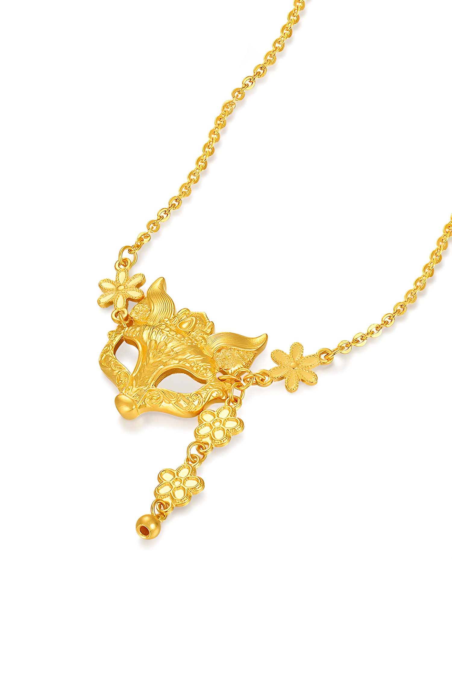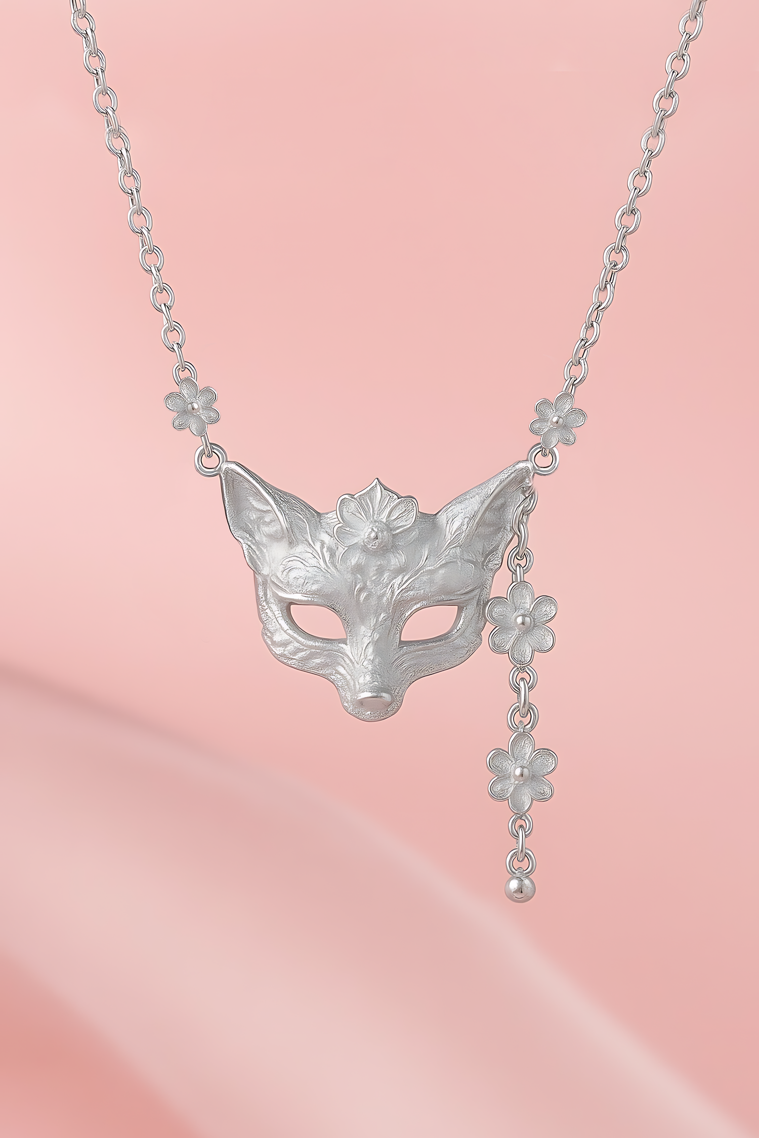 The necklace is made entirely of 925 sterling silver and comes in the shape of a Fox Ballad Mask with small and dainty hanging flowers.