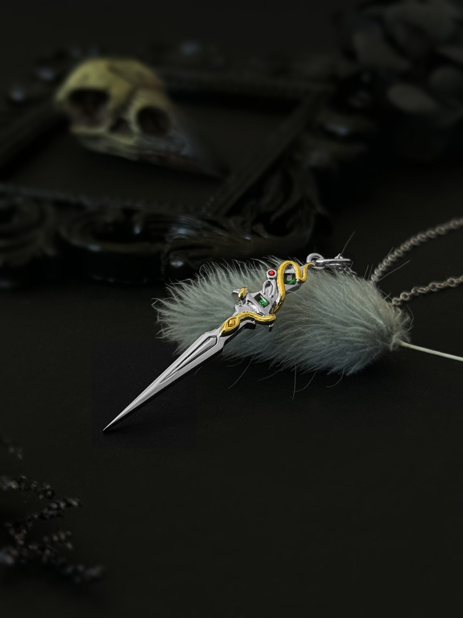 The necklace comes in the shape of the Wrath's snake dagger. In the book the dagger is described as "a small dagger with a gold snake with fangs bared twined around the hilt. It's beautiful, iced, and deadly, just like Wrath." It also comes with bright faceted red ruby and green emerald zircons.
